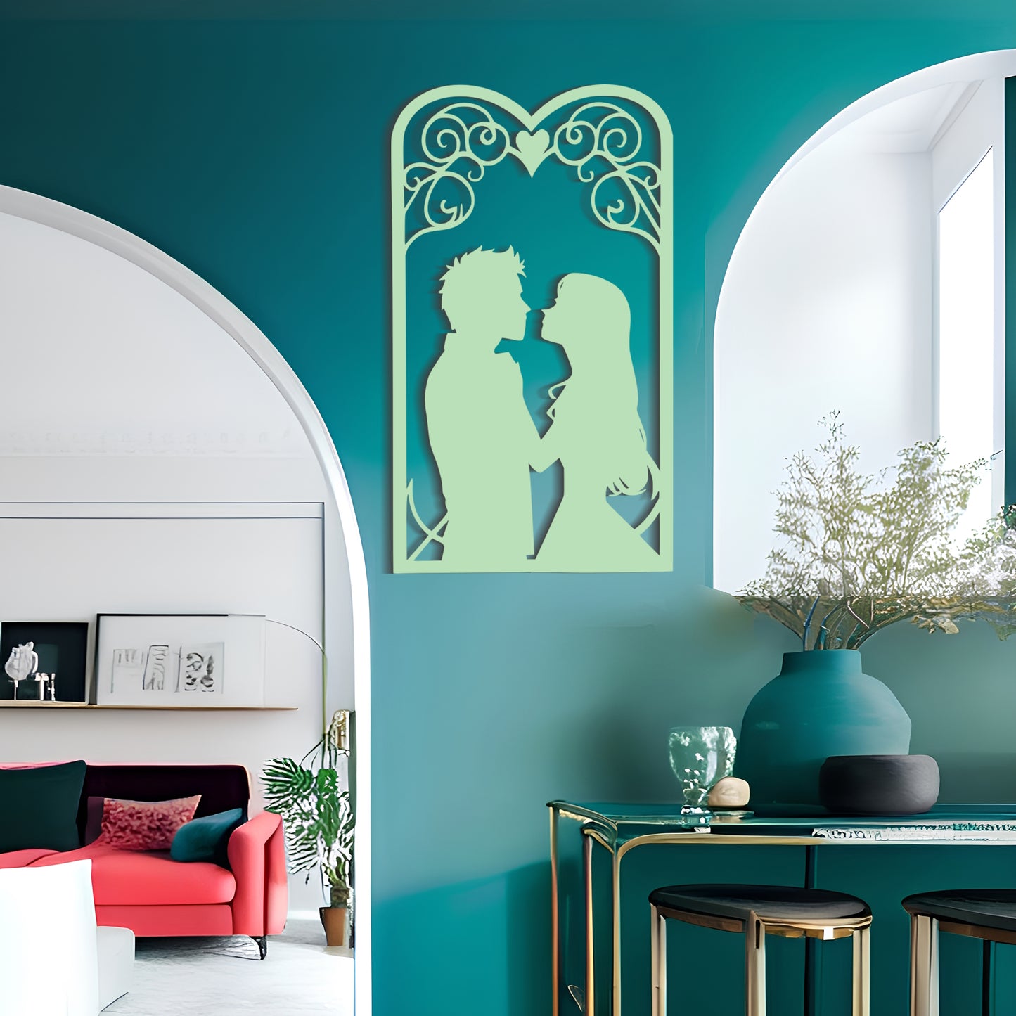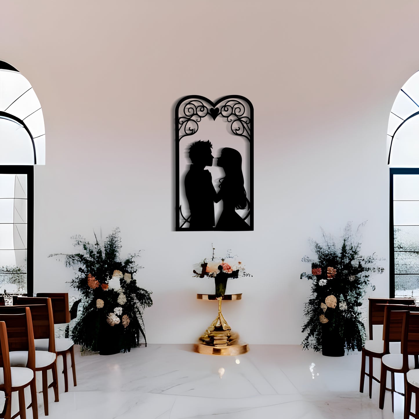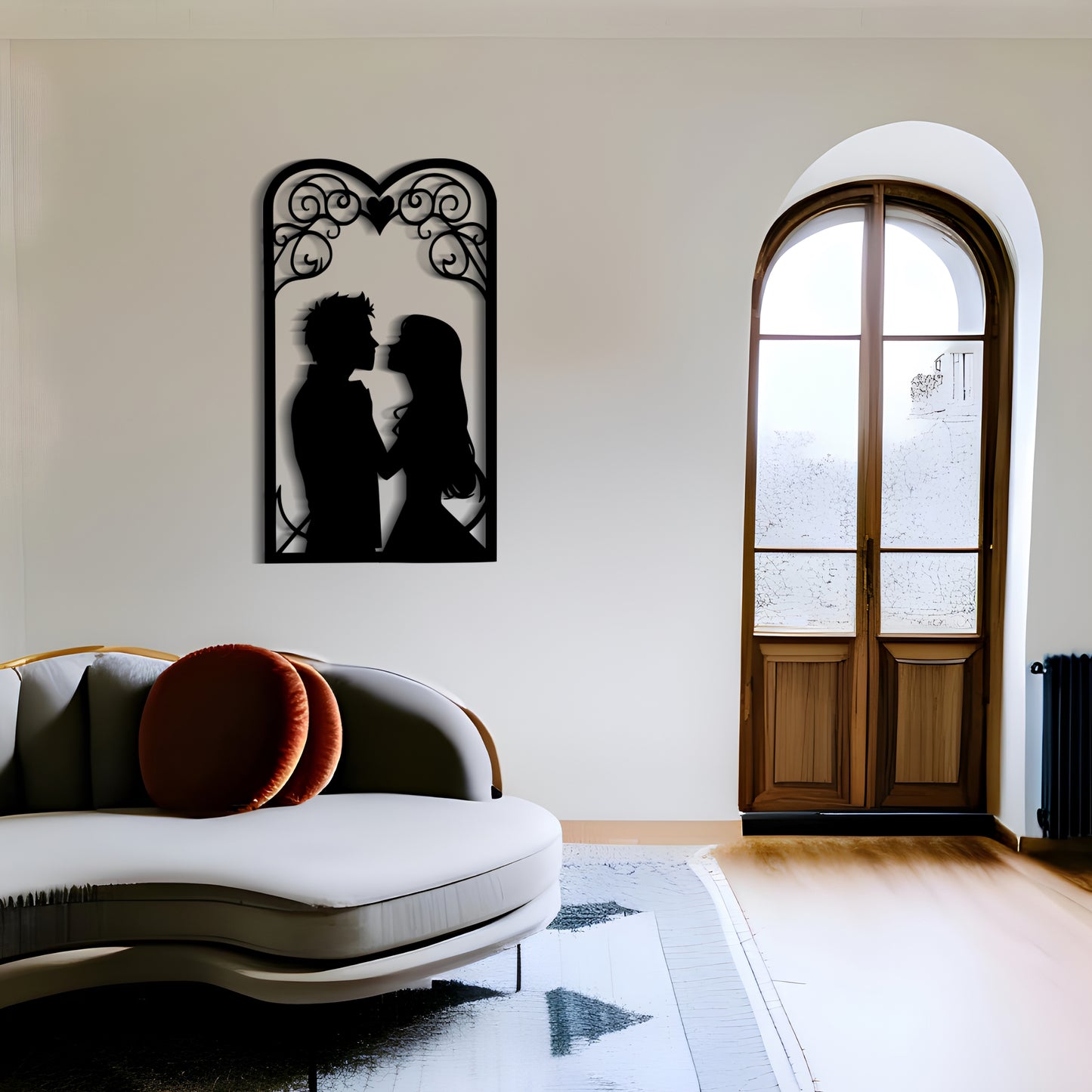 This beautiful metal wall art captures the essence of romanticism and young adult fantasy novels with its stunning silhouette of a man and woman sharing a sweet kiss. The intricate details of the art nouveau ornament and tarot card frame add a touch of mystery and enchantment to the design, making it perfect for wedding or weeding decor. The golden hue of the metal artwork makes it an eye-catching piece that will elevate any living room or outdoor space. Get this as a wedding gift or a stunning wall decor piece for your own home!