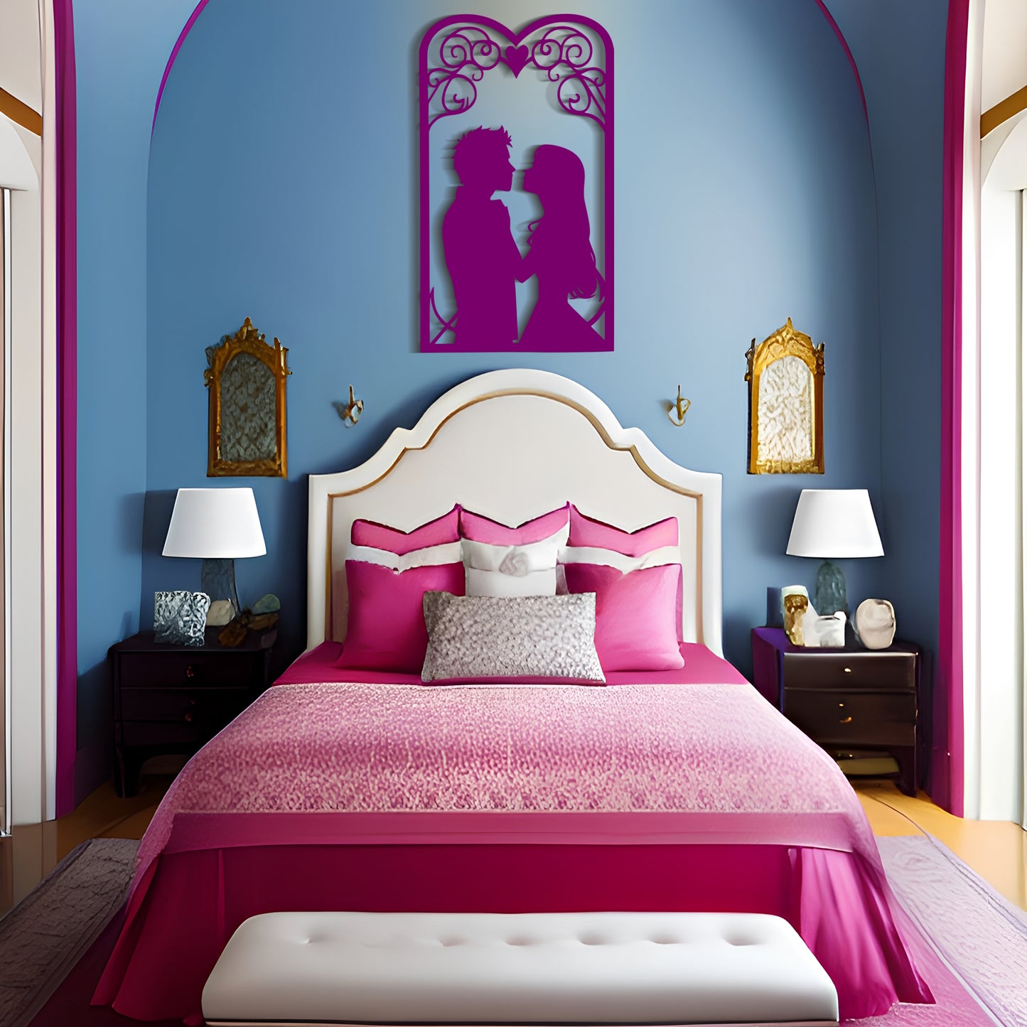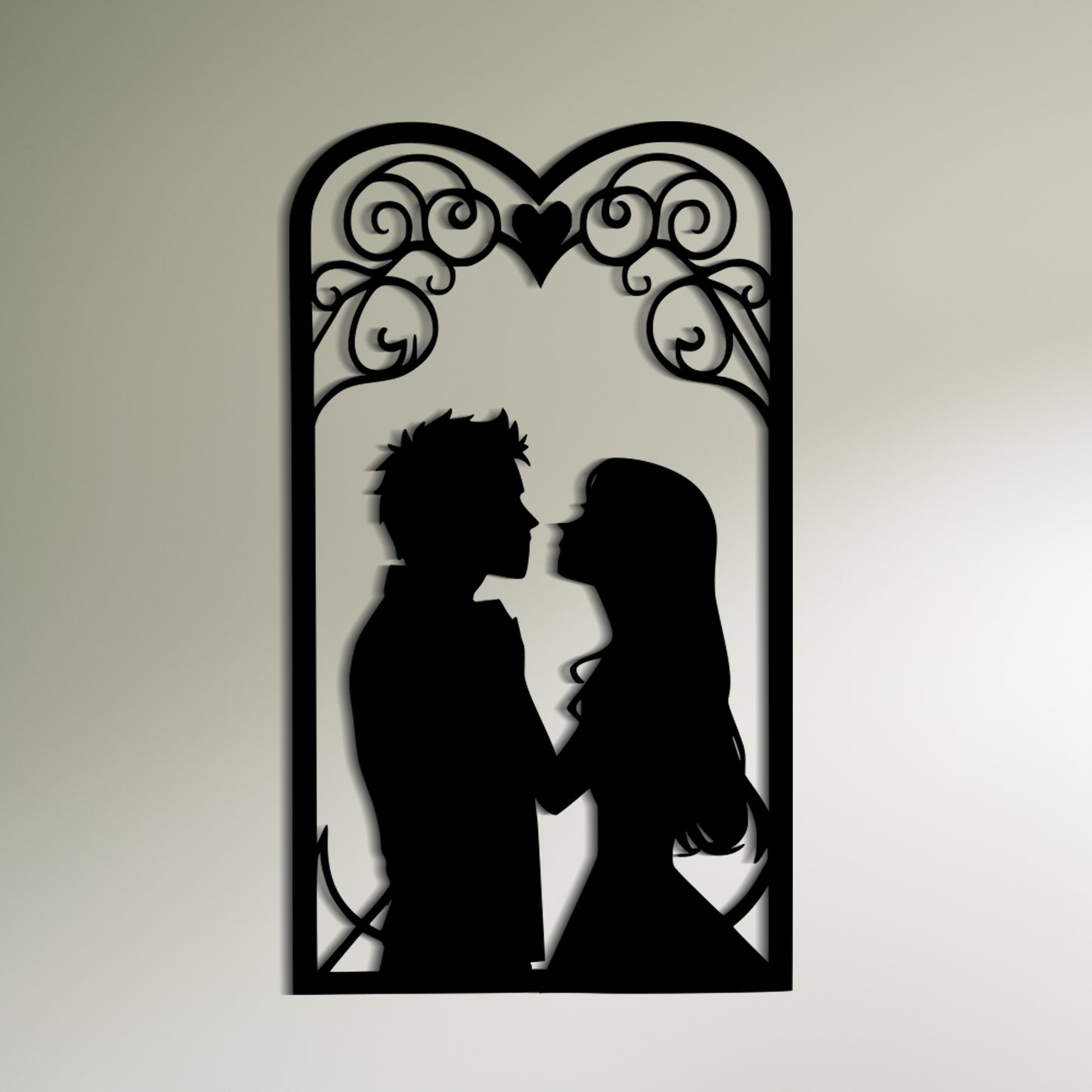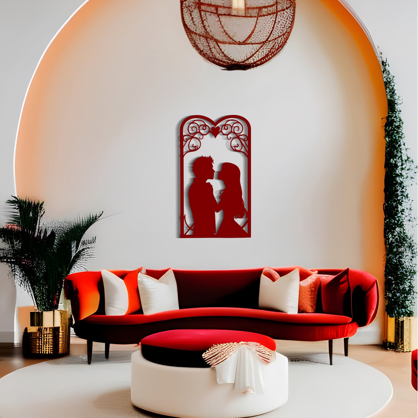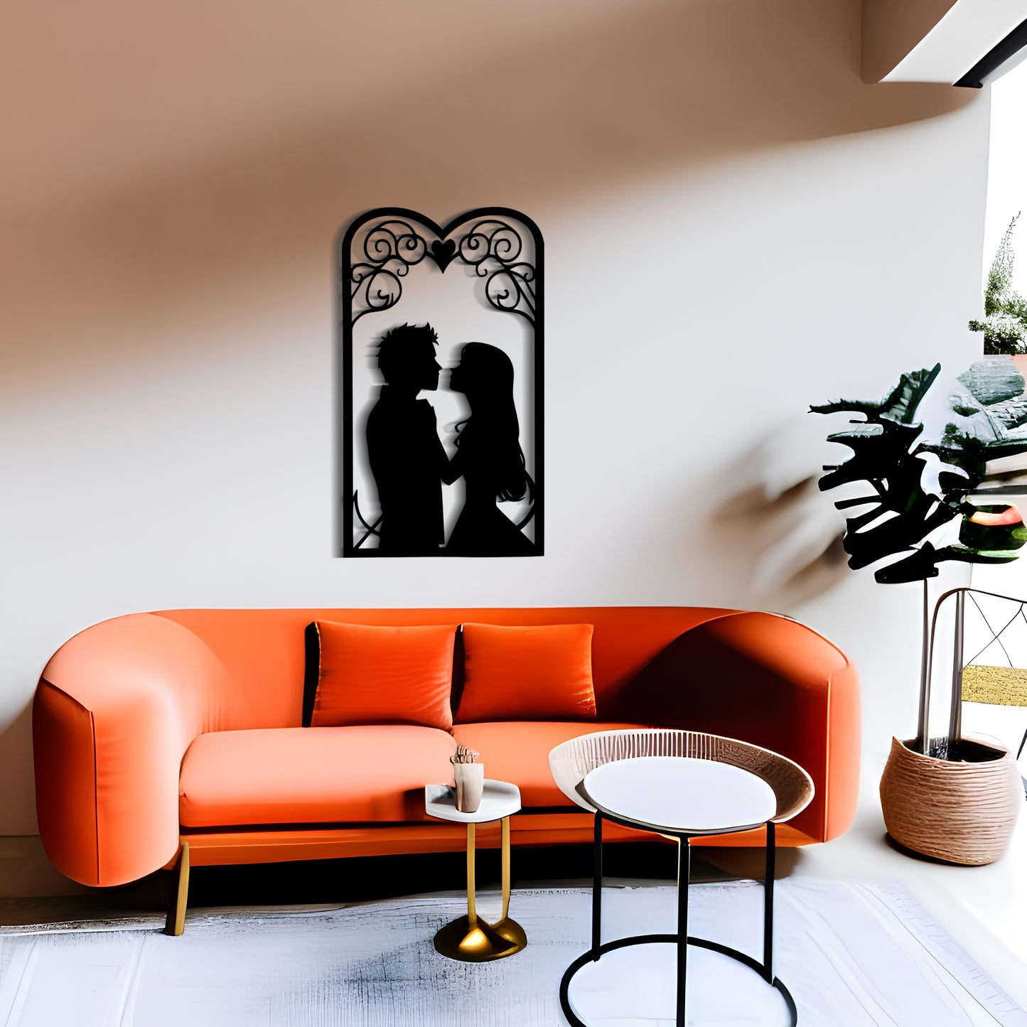 This beautiful metal wall art captures the essence of romanticism and young adult fantasy novels with its stunning silhouette of a man and woman sharing a sweet kiss. The intricate details of the art nouveau ornament and tarot card frame add a touch of mystery and enchantment to the design, making it perfect for wedding or weeding decor. The golden hue of the metal artwork makes it an eye-catching piece that will elevate any living room or outdoor space. Get this as a wedding gift or a stunning wall decor piece for your own home!