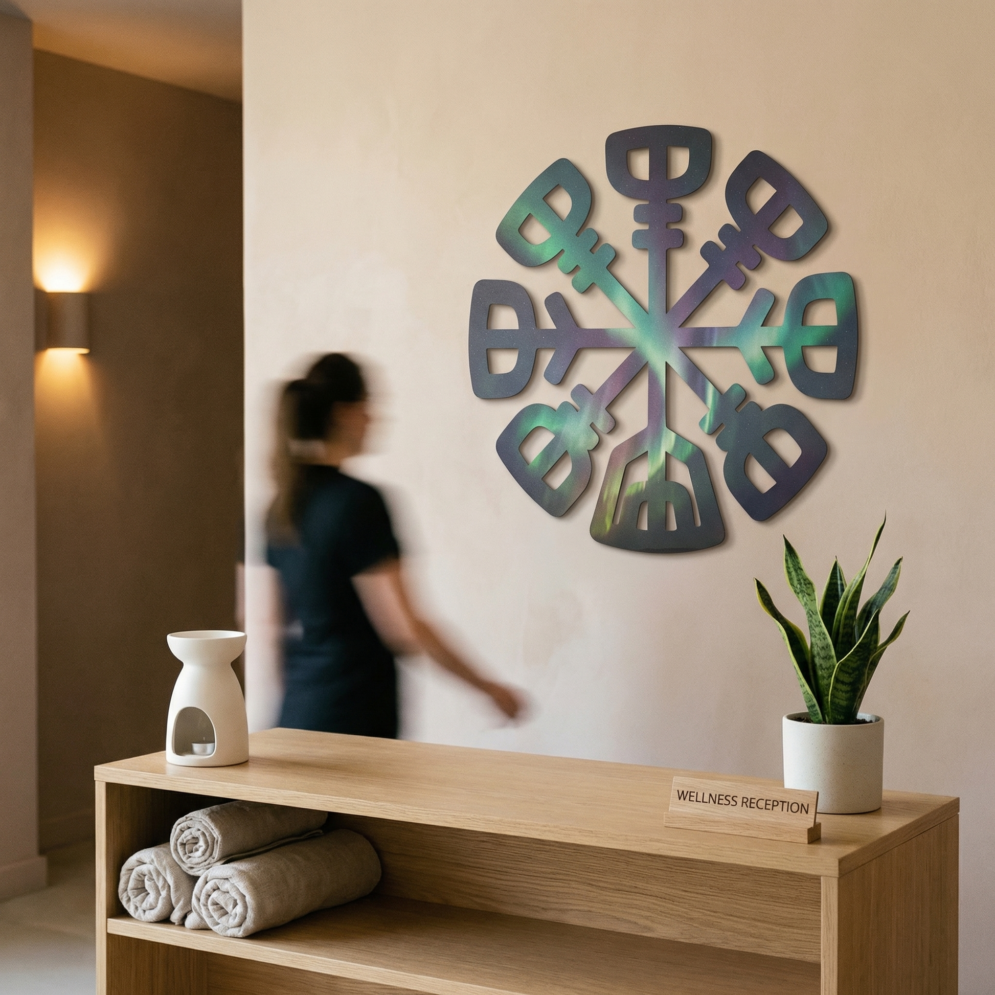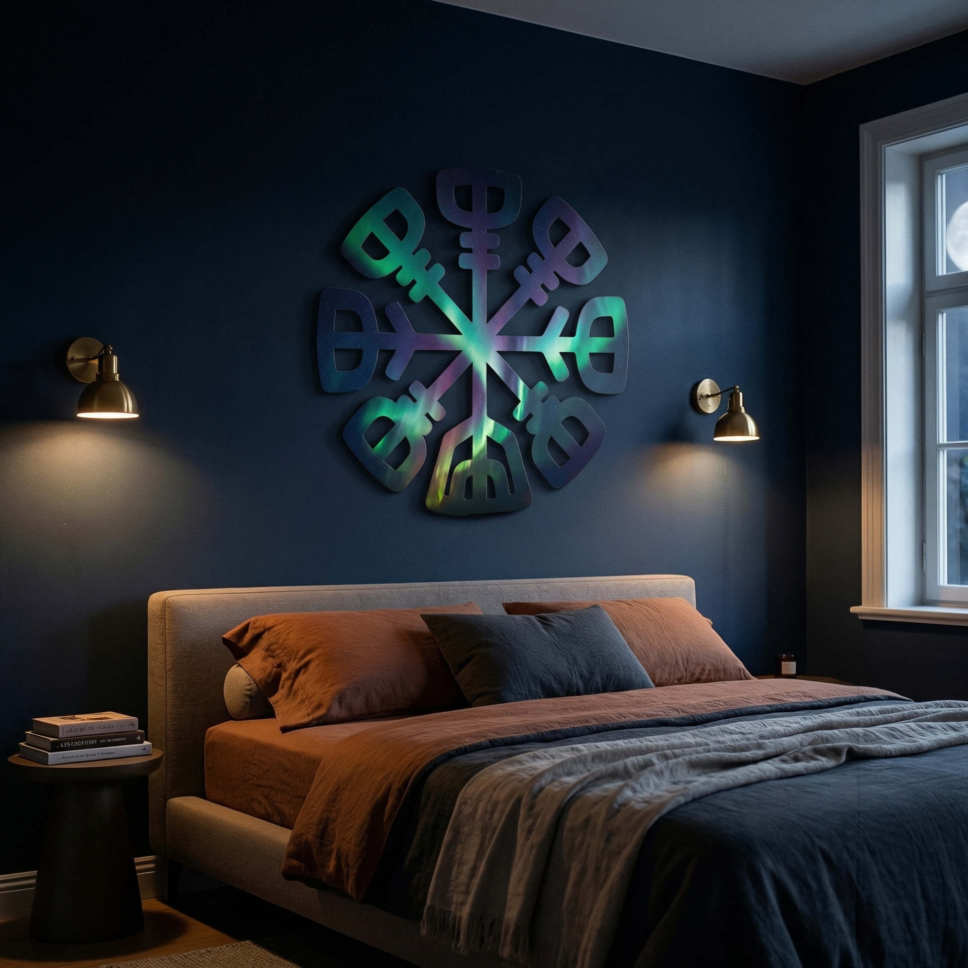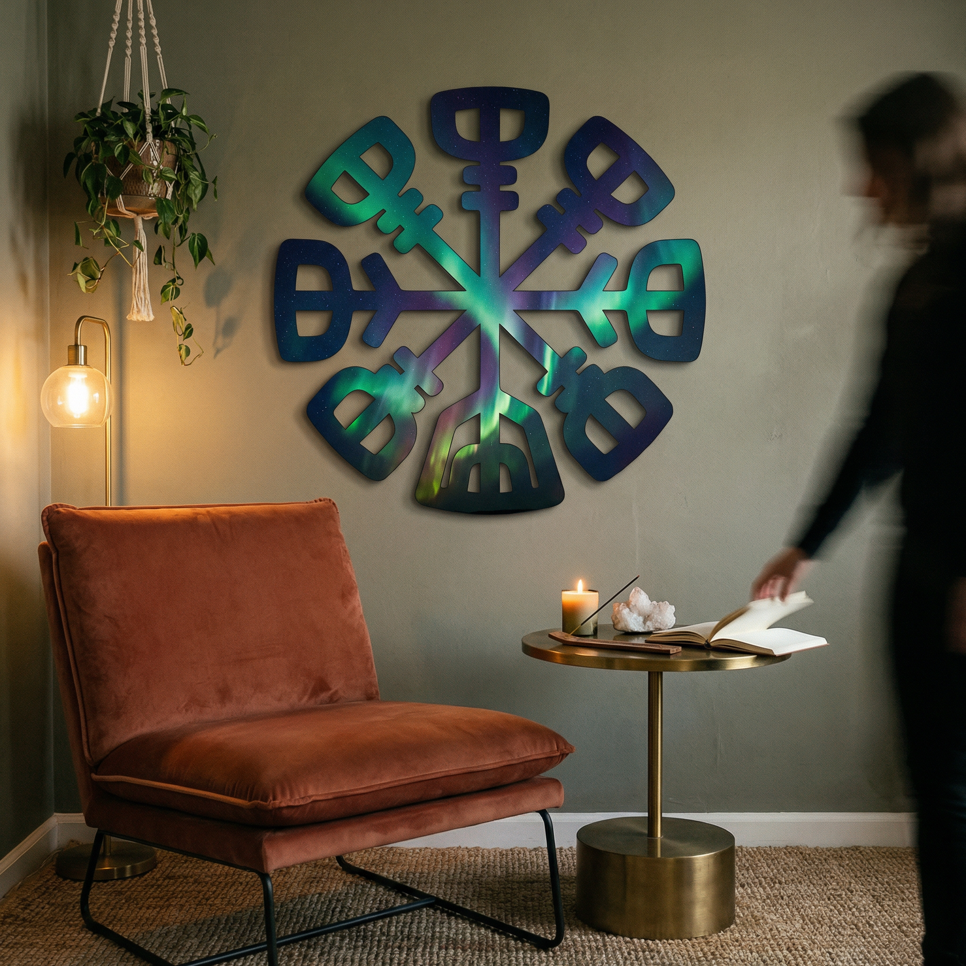 Often associated with the Vegvisir or Helm of Awe, this symmetrical emblem serves as a focal point of esoteric symbolism and geometric balance.