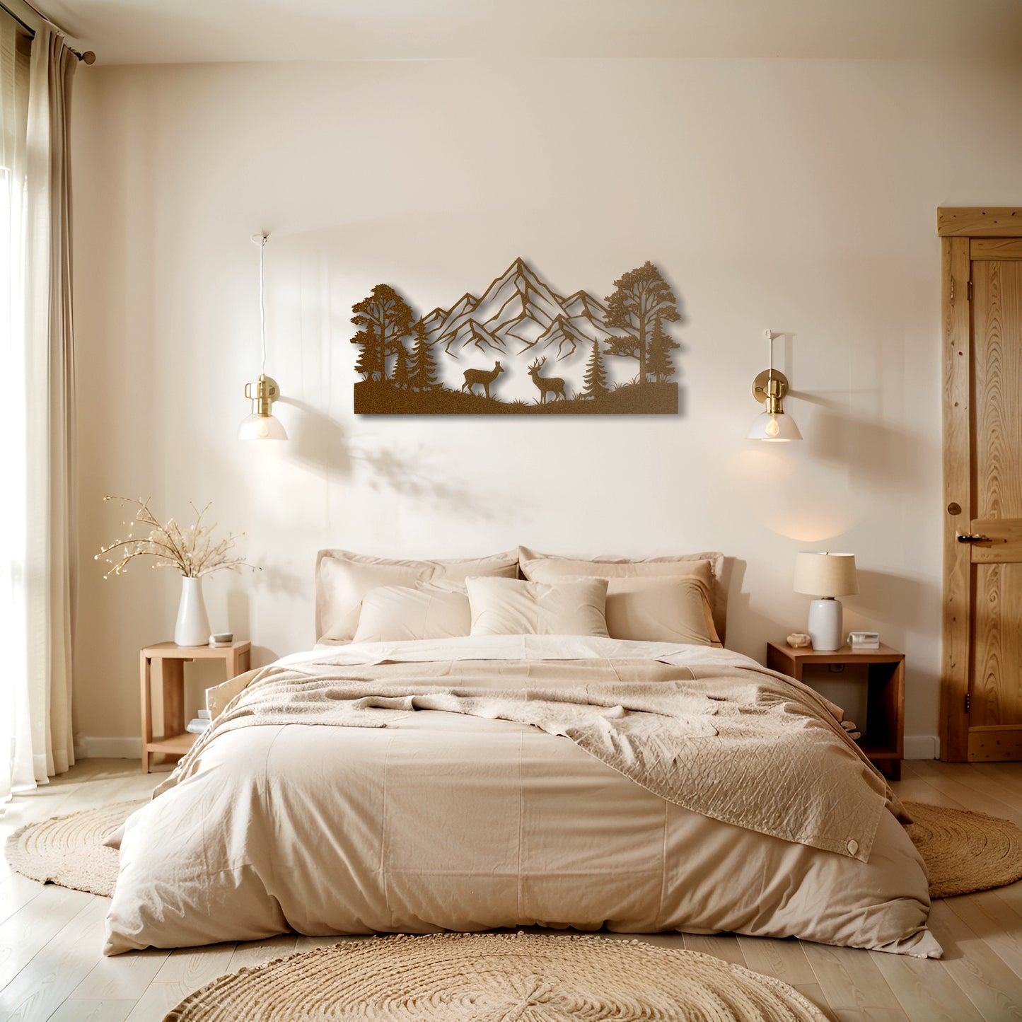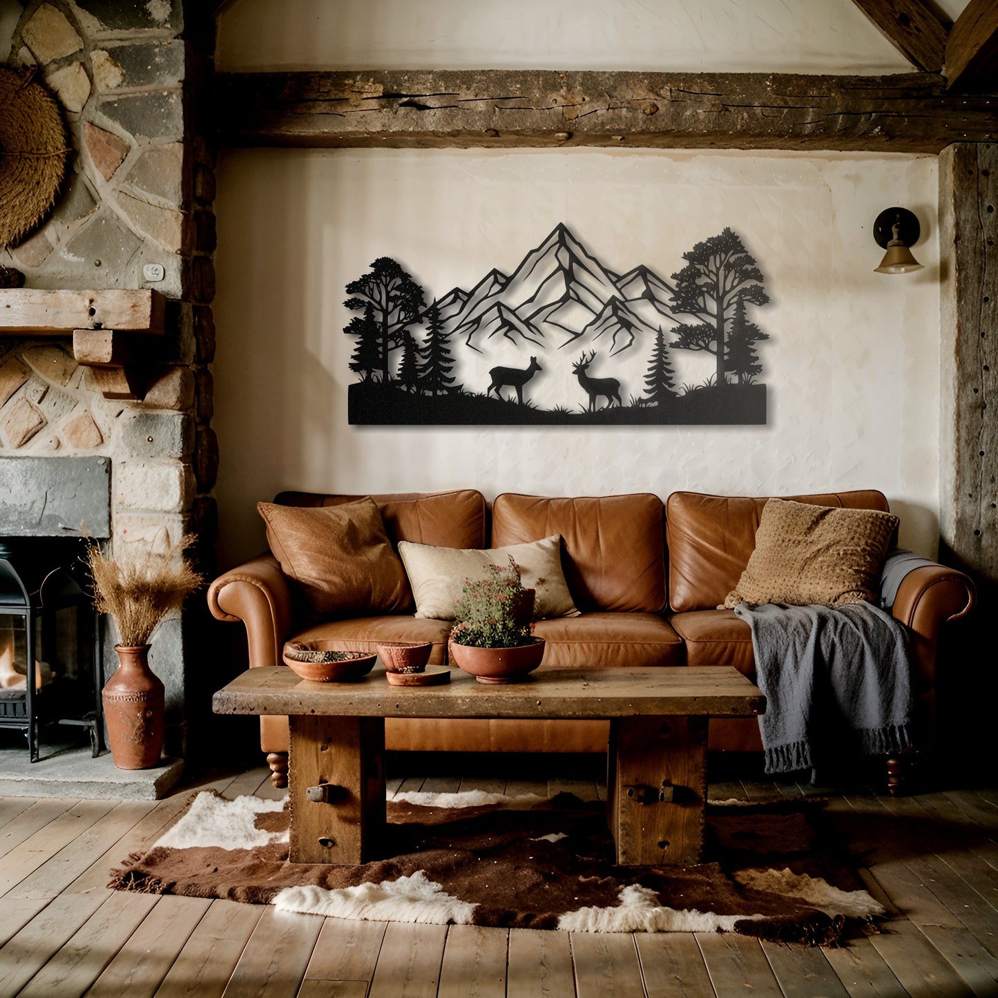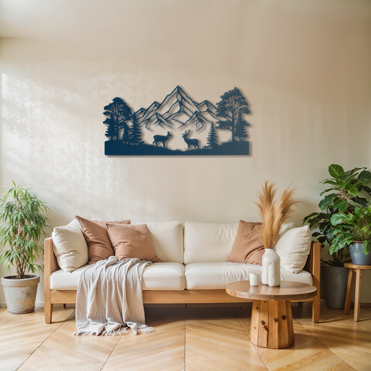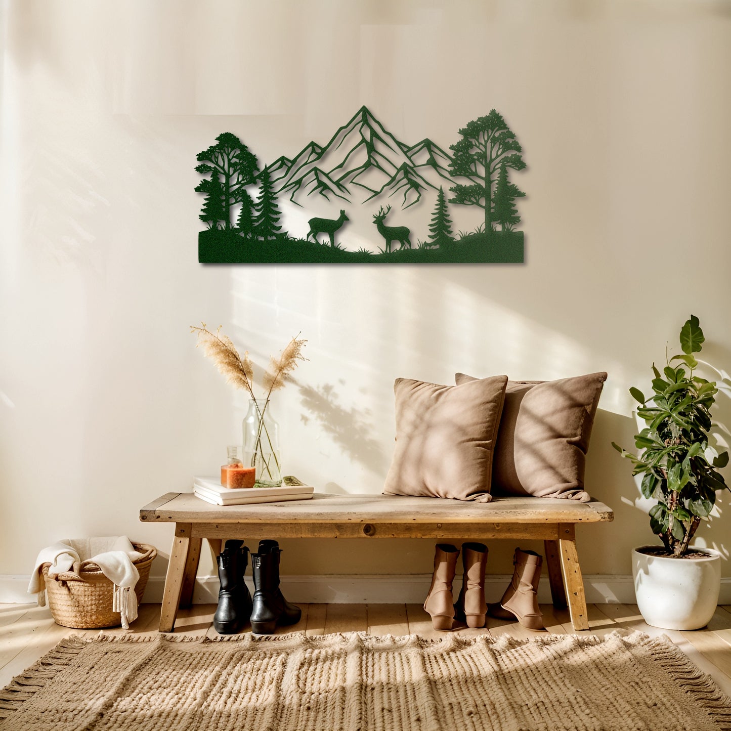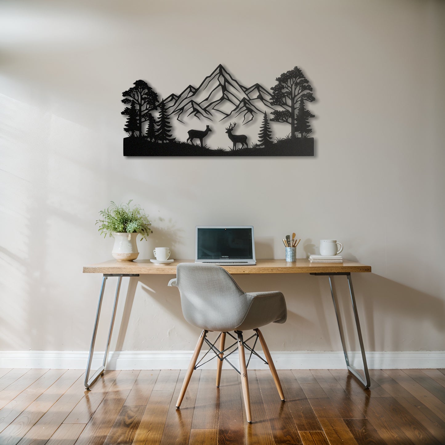 Create a peaceful and elegant atmosphere with this stunning deer and mountain metal wall art. This nature-inspired design features a serene forest scene with deer amidst majestic mountains, making it the perfect addition to rustic or modern decor.