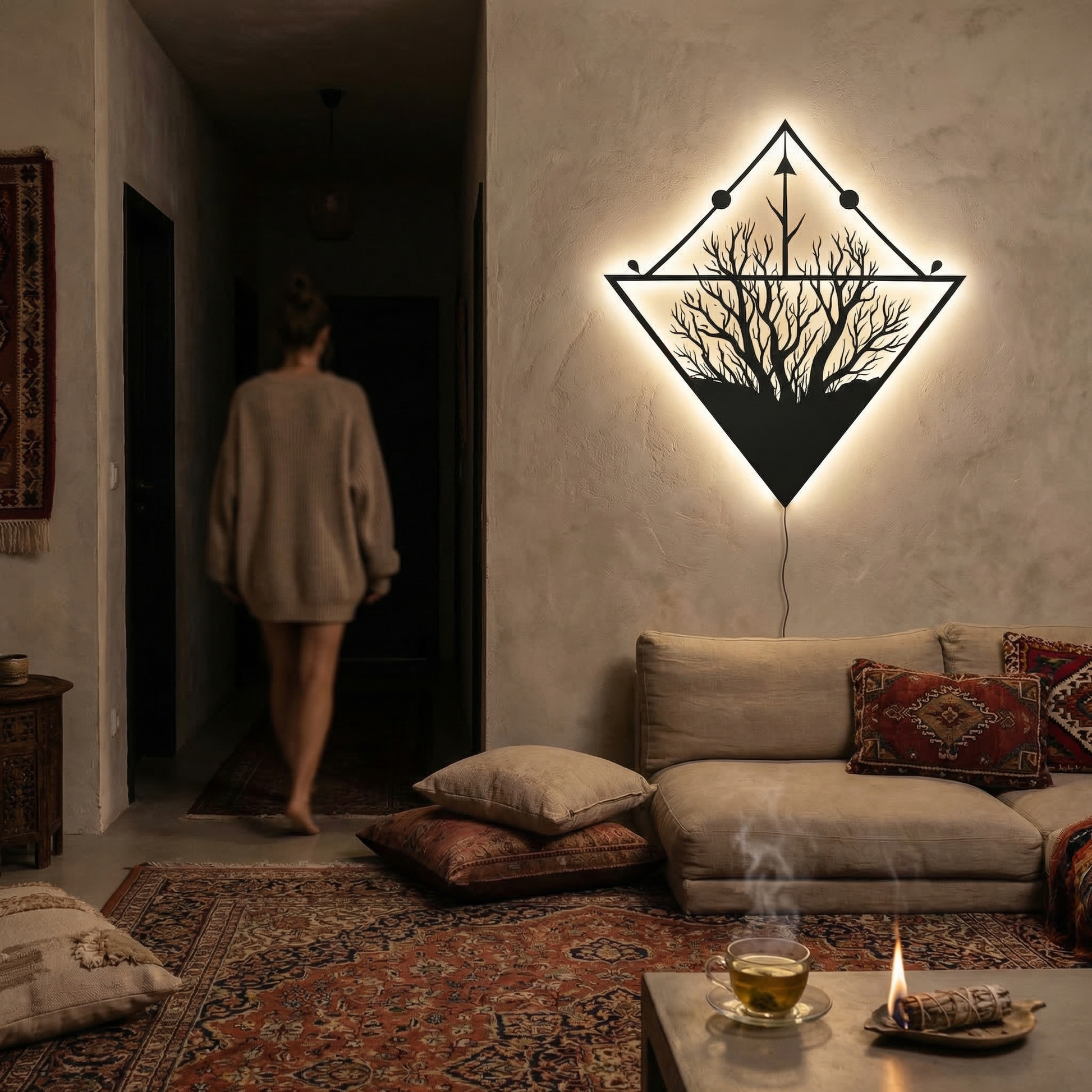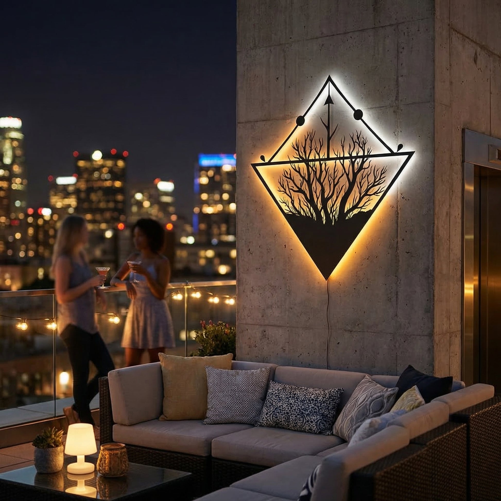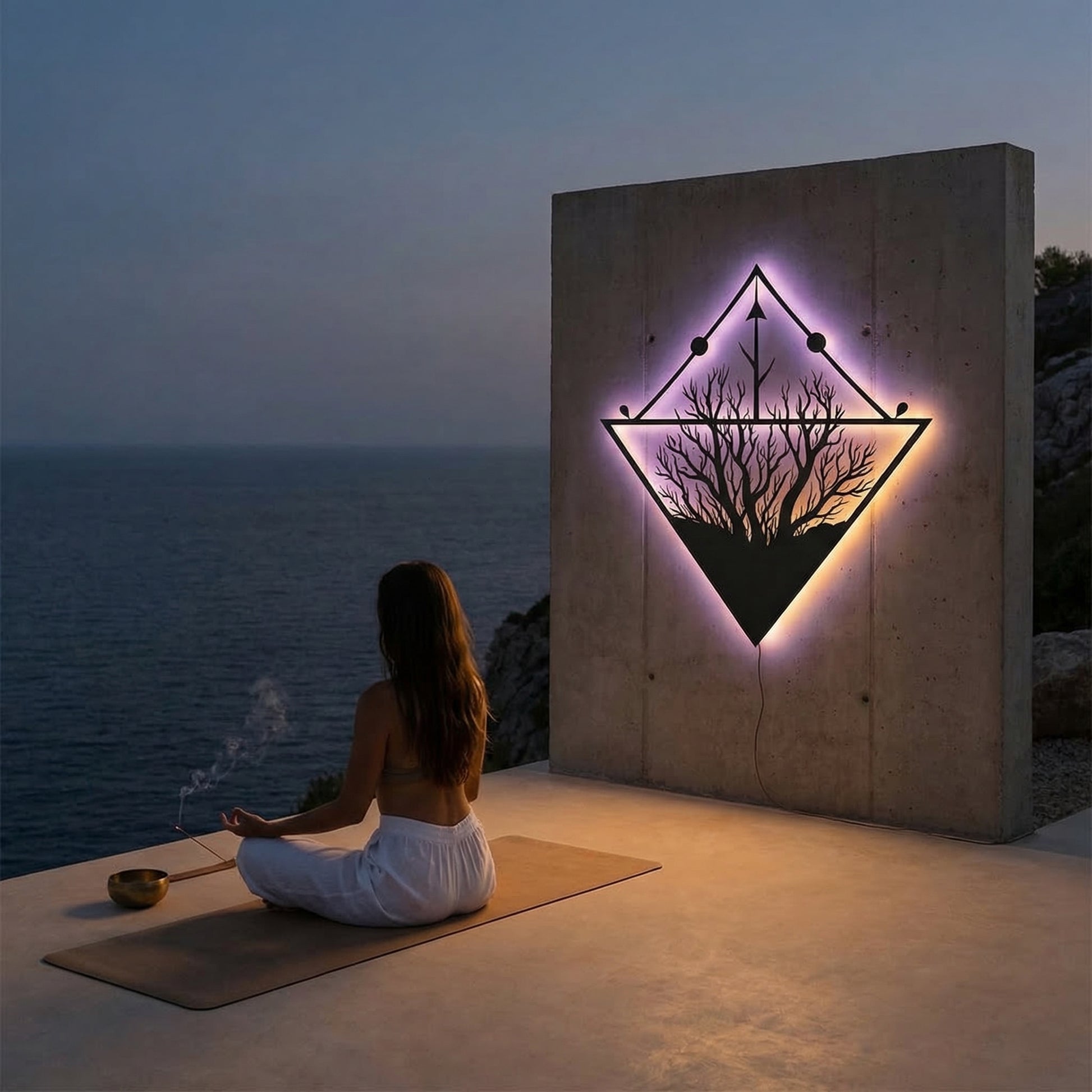 This composition captures a dense cluster of leafless trees silhouetted against a structured geometric framework. The juxtaposition of organic, branching forms against sharp, linear boundaries creates a compelling visual tension, merging the natural world with abstract mathematical precision. Fabricated from precisely cut metal, the complex linework of the branches and the rigid outer framing create a striking interplay of positive and negative space. Designed to float slightly off the wall, the silhouette casts sharp, shifting shadows that enhance the piece's dimensional presence. The integration of the upward arrow, overlapping triangles, and celestial nodes draws heavily from alchemical and esoteric symbolism. It functions as a contemporary emblem of growth, grounding, and the structural laws governing the natural universe.