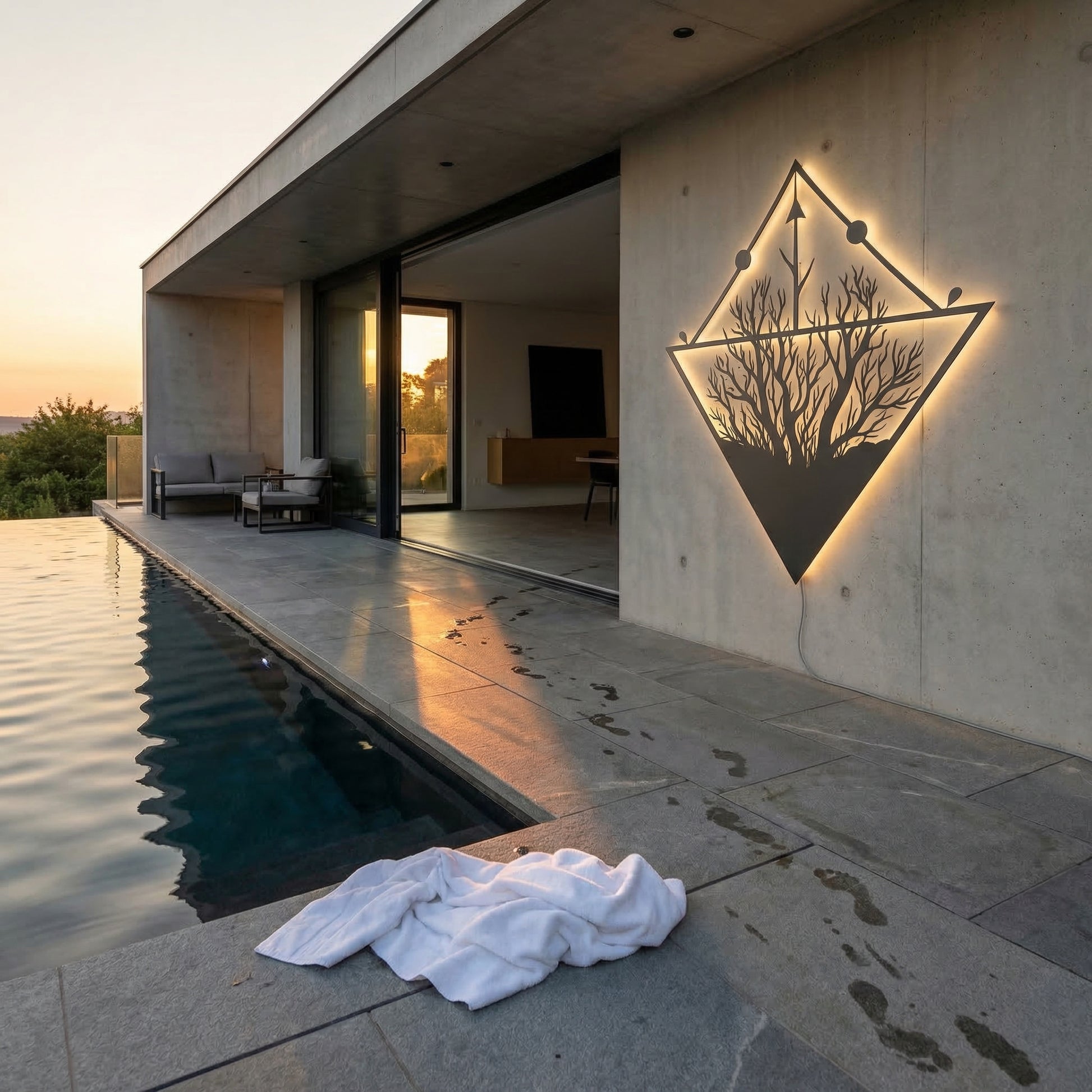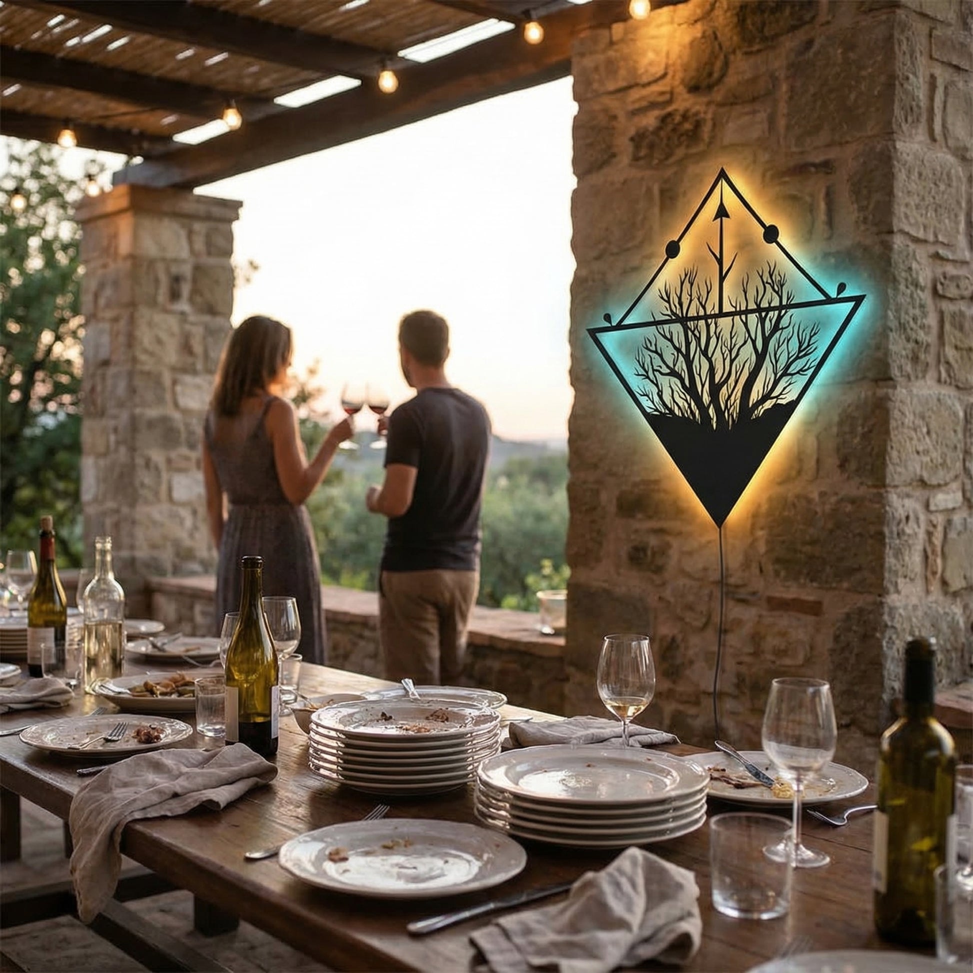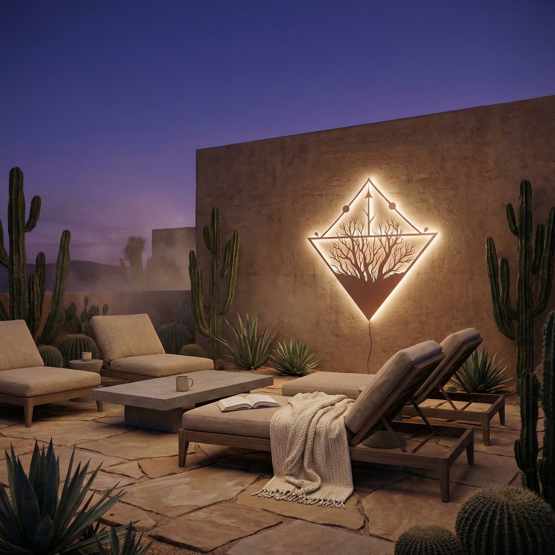 This composition captures a dense cluster of leafless trees silhouetted against a structured geometric framework. The juxtaposition of organic, branching forms against sharp, linear boundaries creates a compelling visual tension, merging the natural world with abstract mathematical precision. Fabricated from precisely cut metal, the complex linework of the branches and the rigid outer framing create a striking interplay of positive and negative space. Designed to float slightly off the wall, the silhouette casts sharp, shifting shadows that enhance the piece's dimensional presence. The integration of the upward arrow, overlapping triangles, and celestial nodes draws heavily from alchemical and esoteric symbolism. It functions as a contemporary emblem of growth, grounding, and the structural laws governing the natural universe.