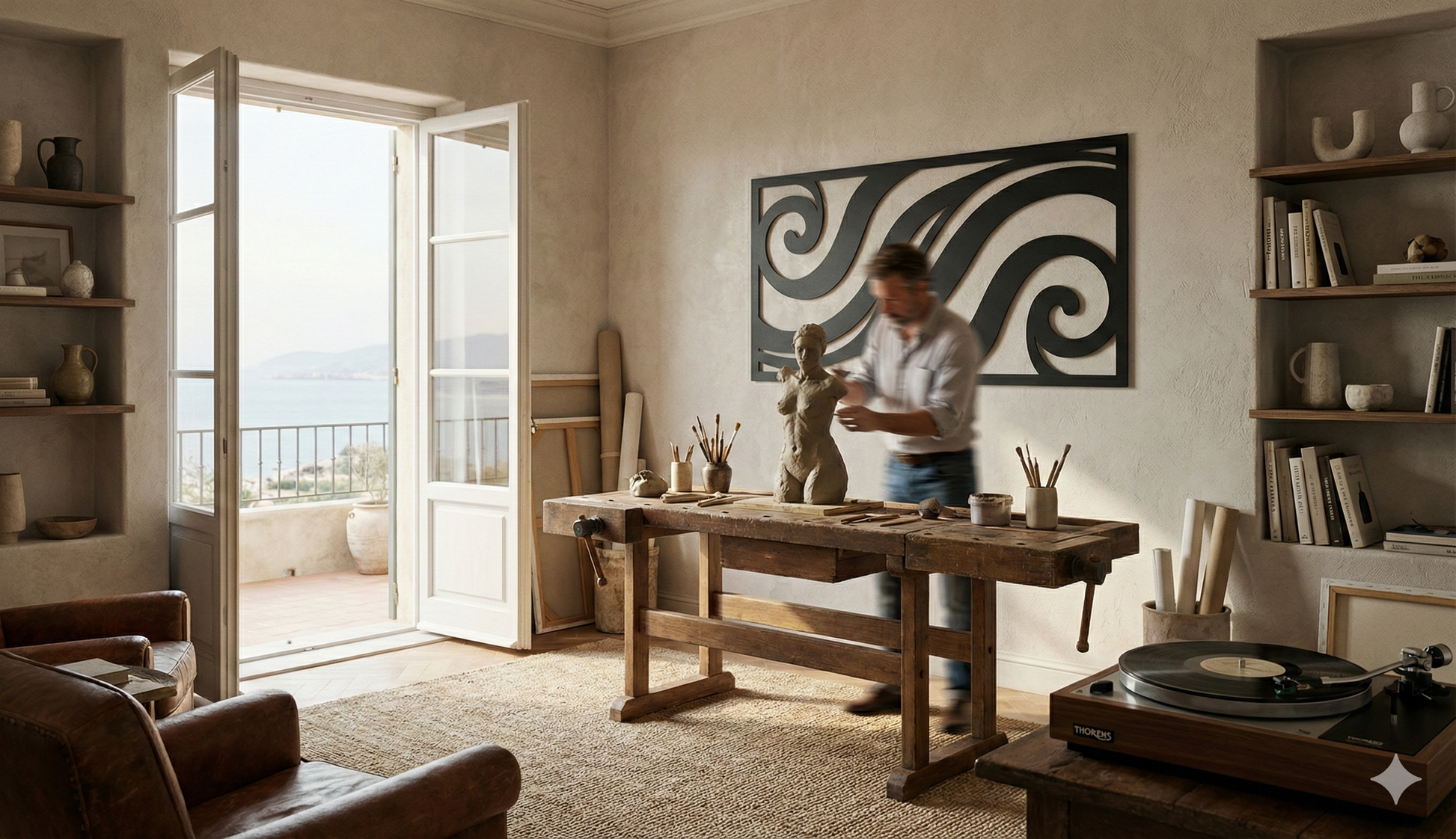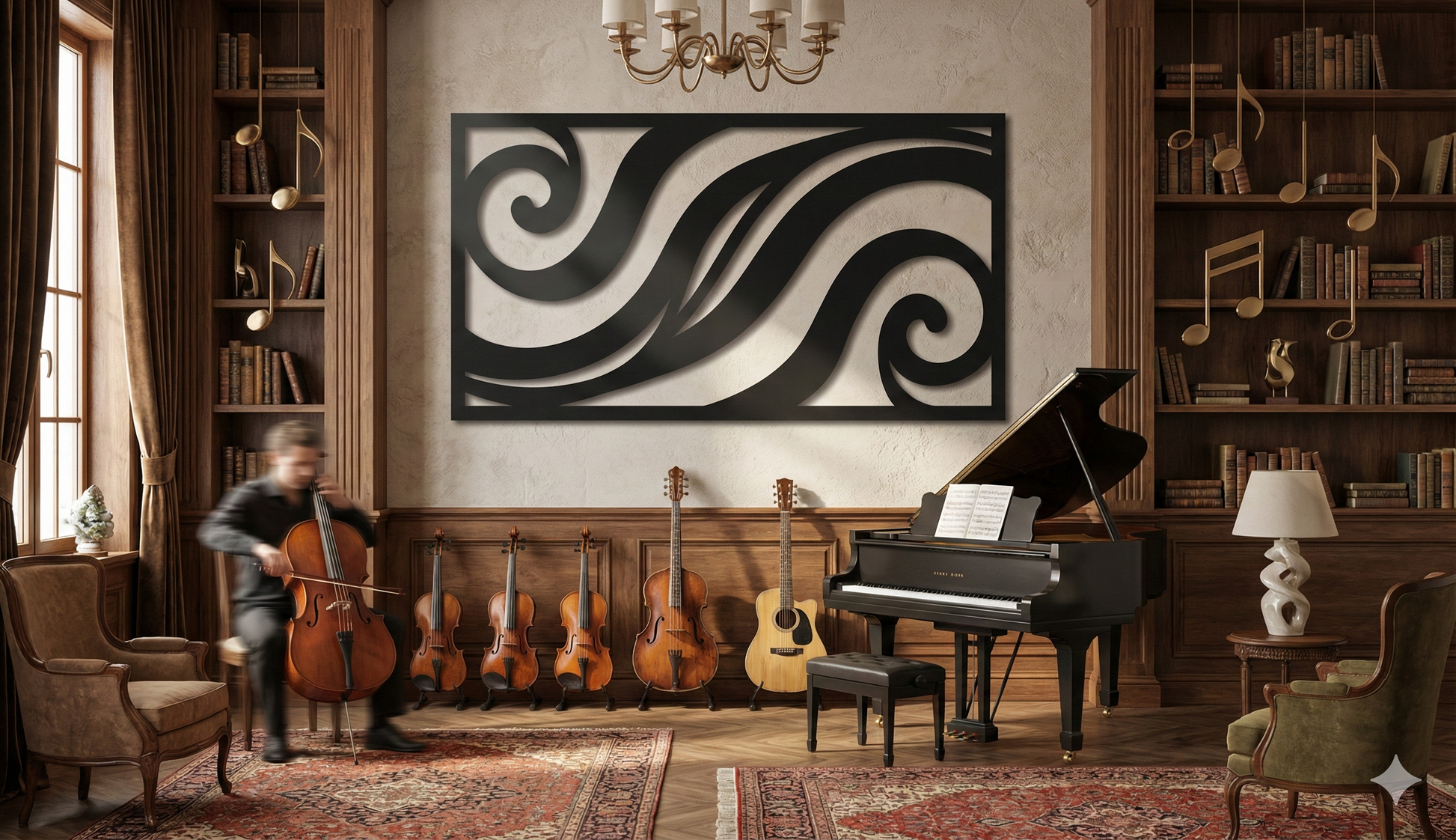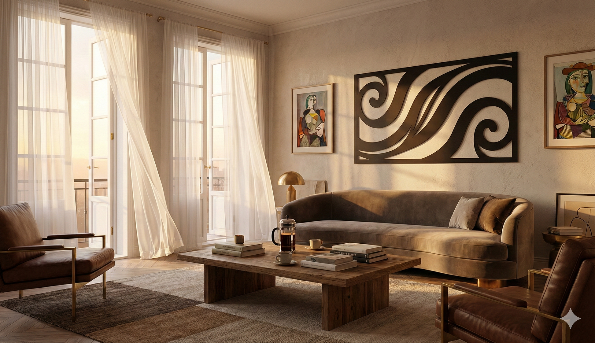 In metal, the thick arcs and smooth channels are translated into confident cutlines that preserve strong negative space for high contrast. The broad curves are designed to cast a pronounced floating shadow effect, so the spirals feel deeper and more dimensional as light travels across the surface.