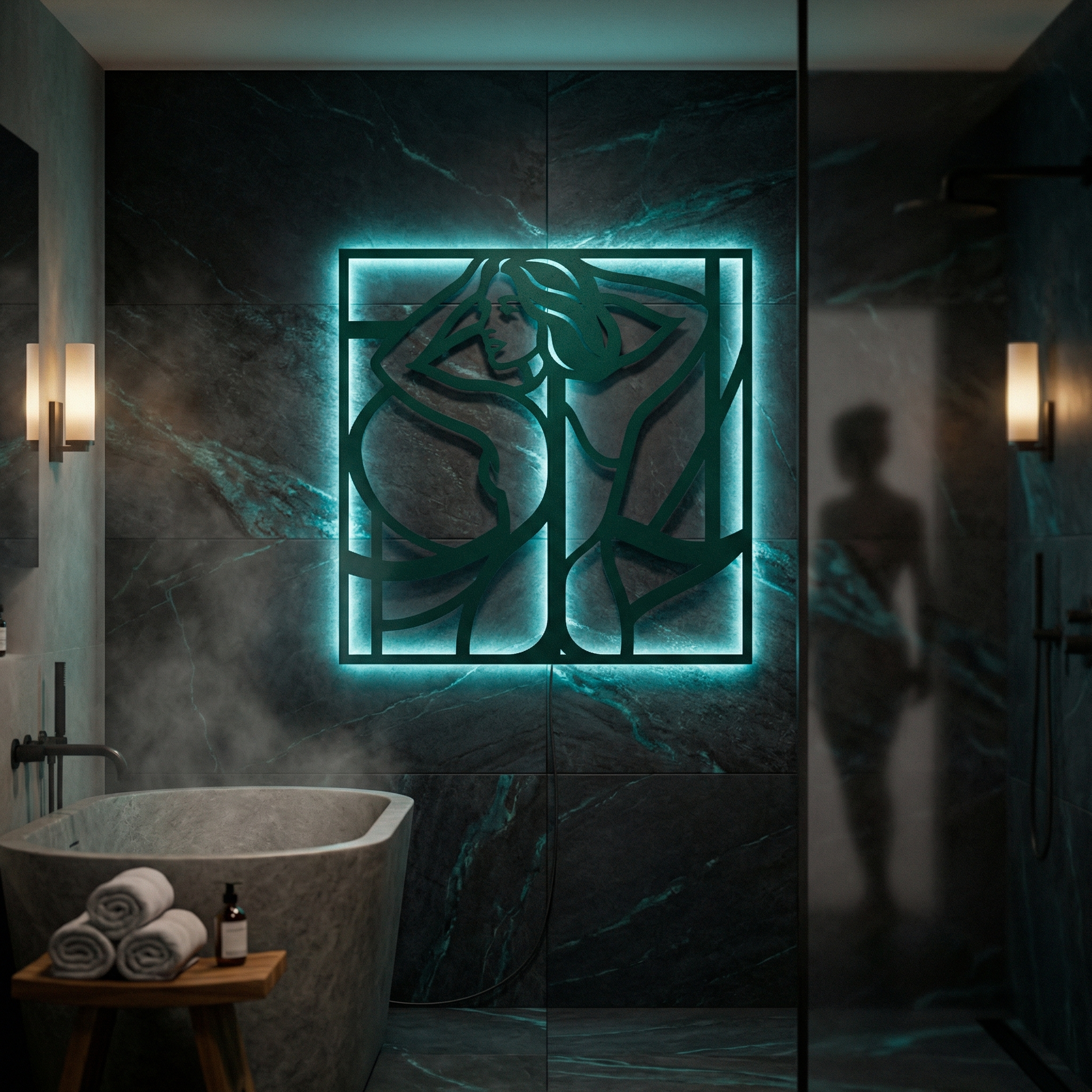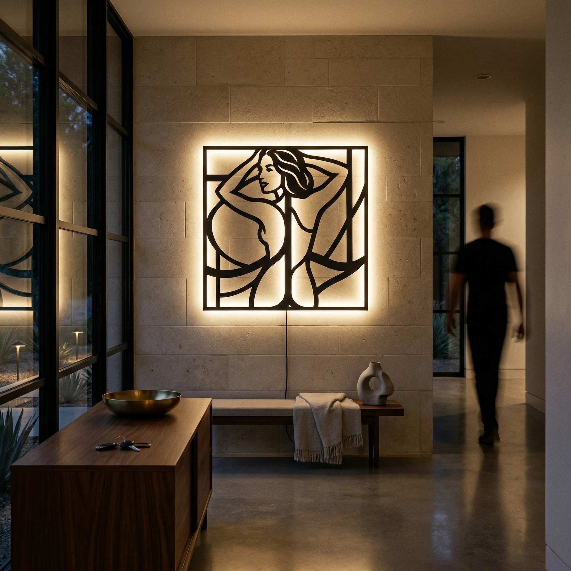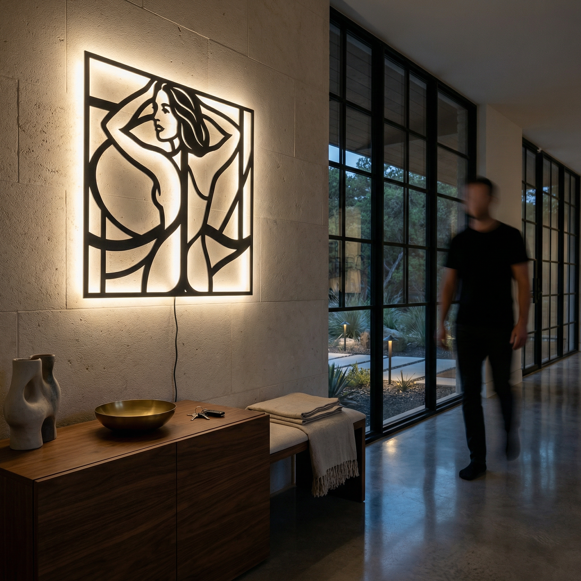 Flowing metal contours define hair, shoulders, and body lines while generous negative space keeps the image light and graphic. The framed structure sharpens the composition, and the offset mounting creates a floating halo of shadow that becomes especially vivid when backlit.