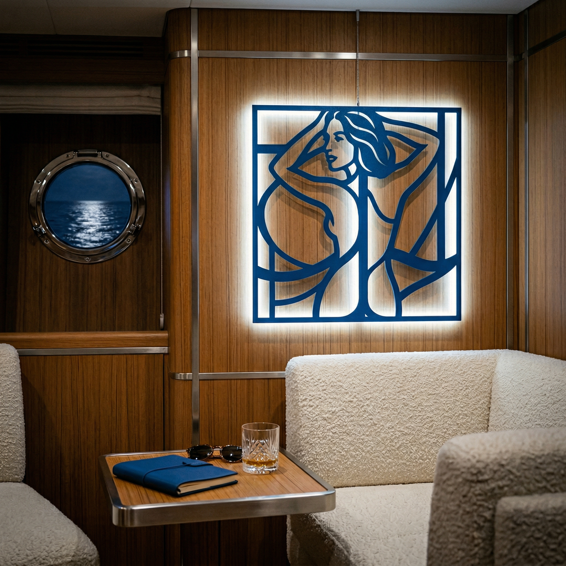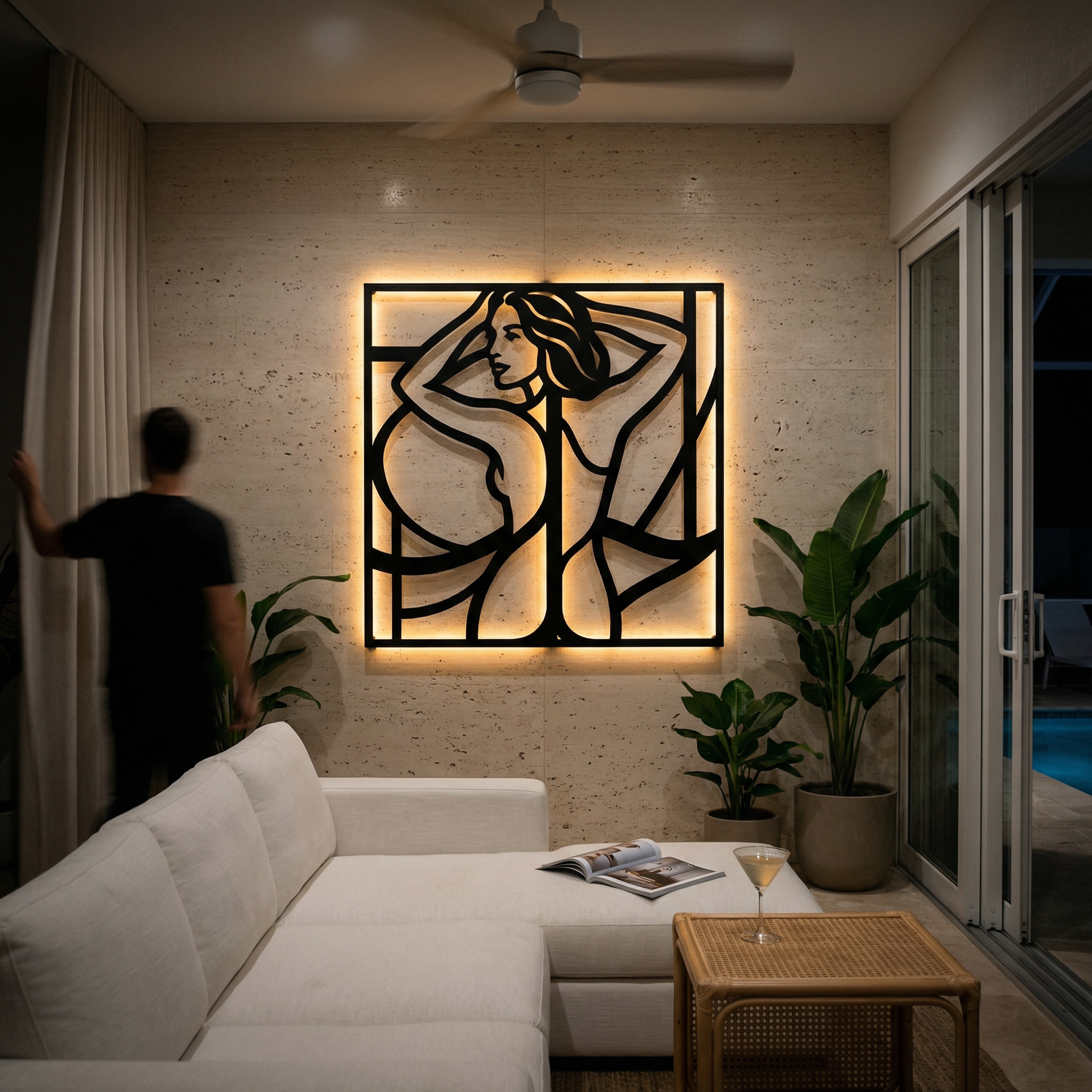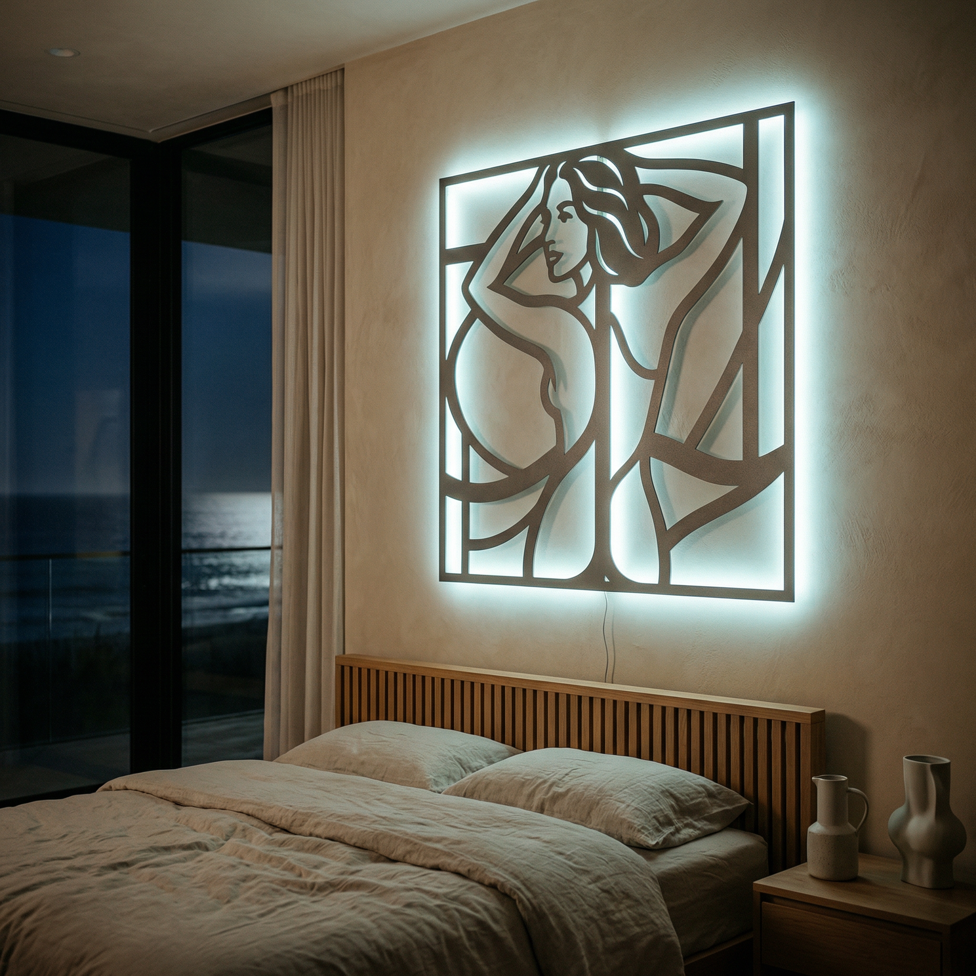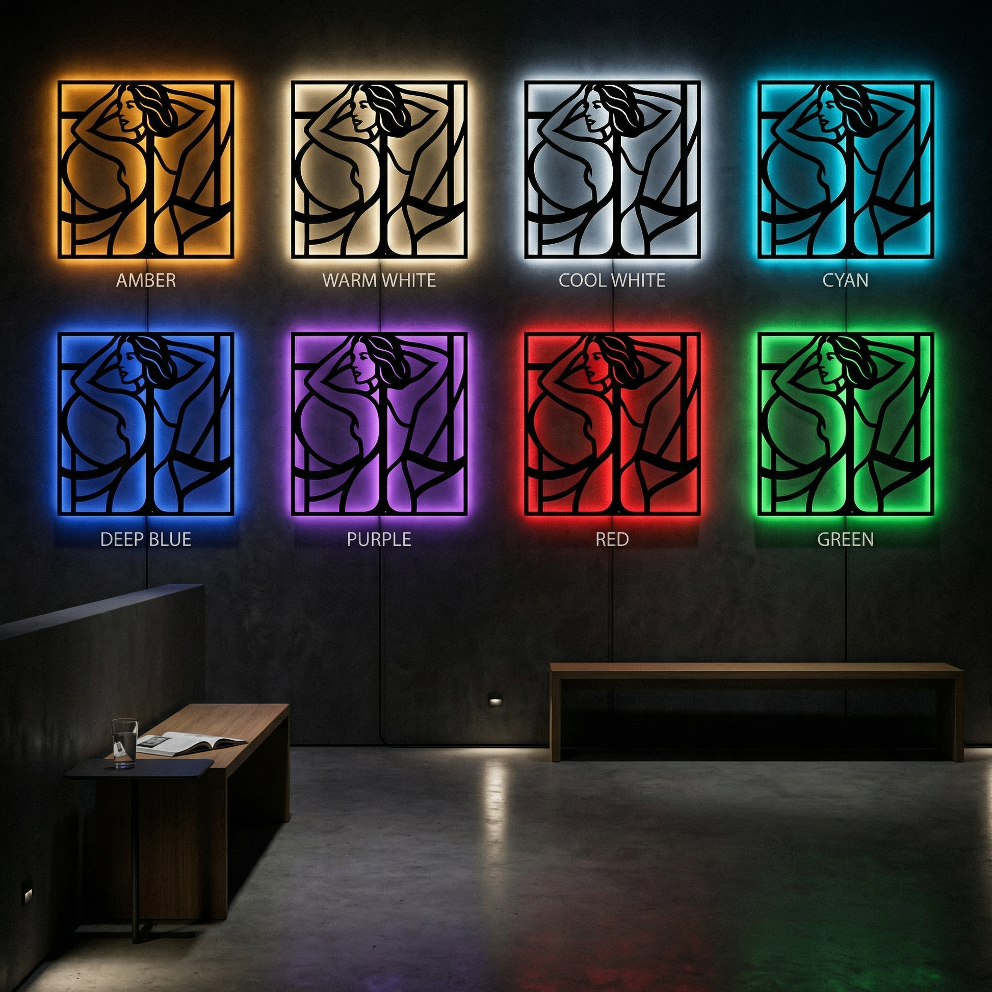 Flowing metal contours define hair, shoulders, and body lines while generous negative space keeps the image light and graphic. The framed structure sharpens the composition, and the offset mounting creates a floating halo of shadow that becomes especially vivid when backlit.