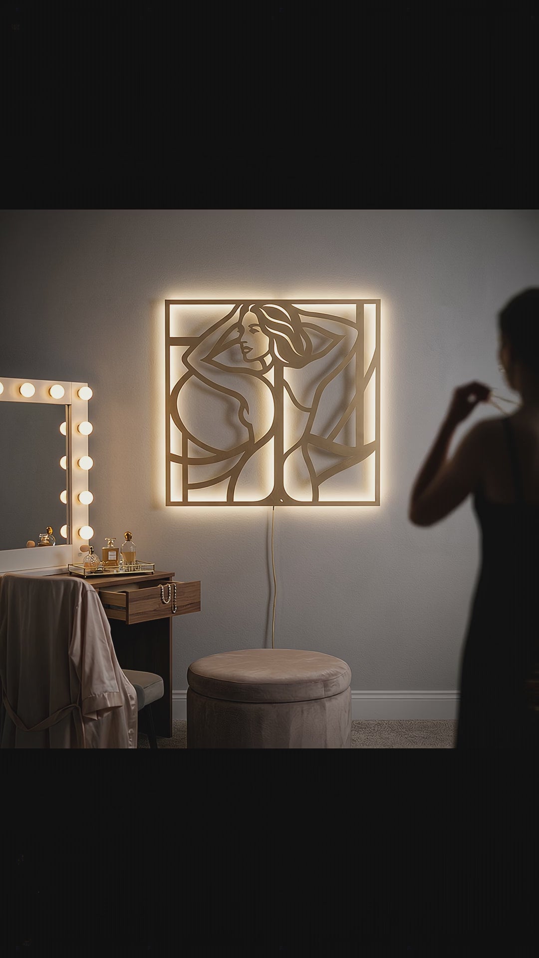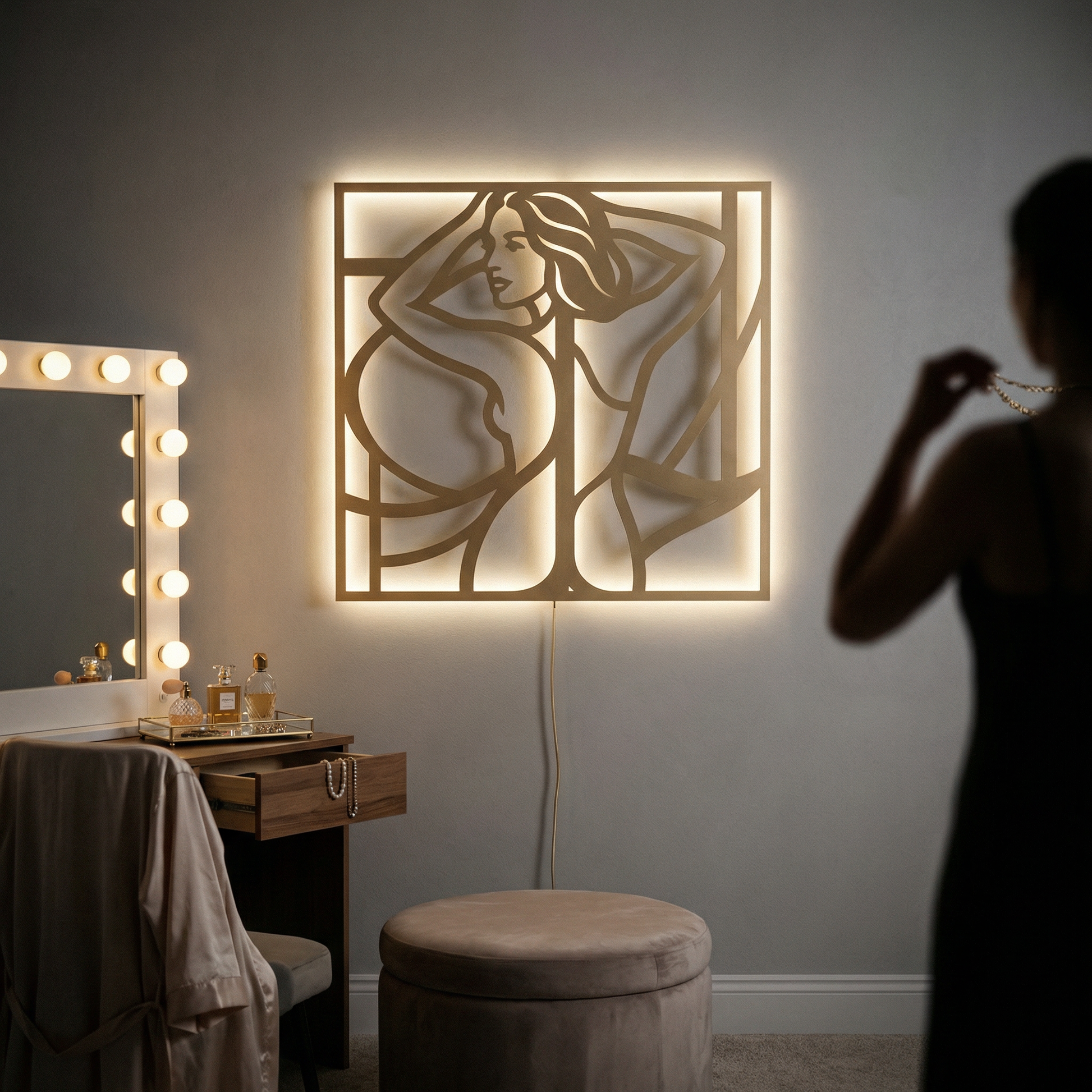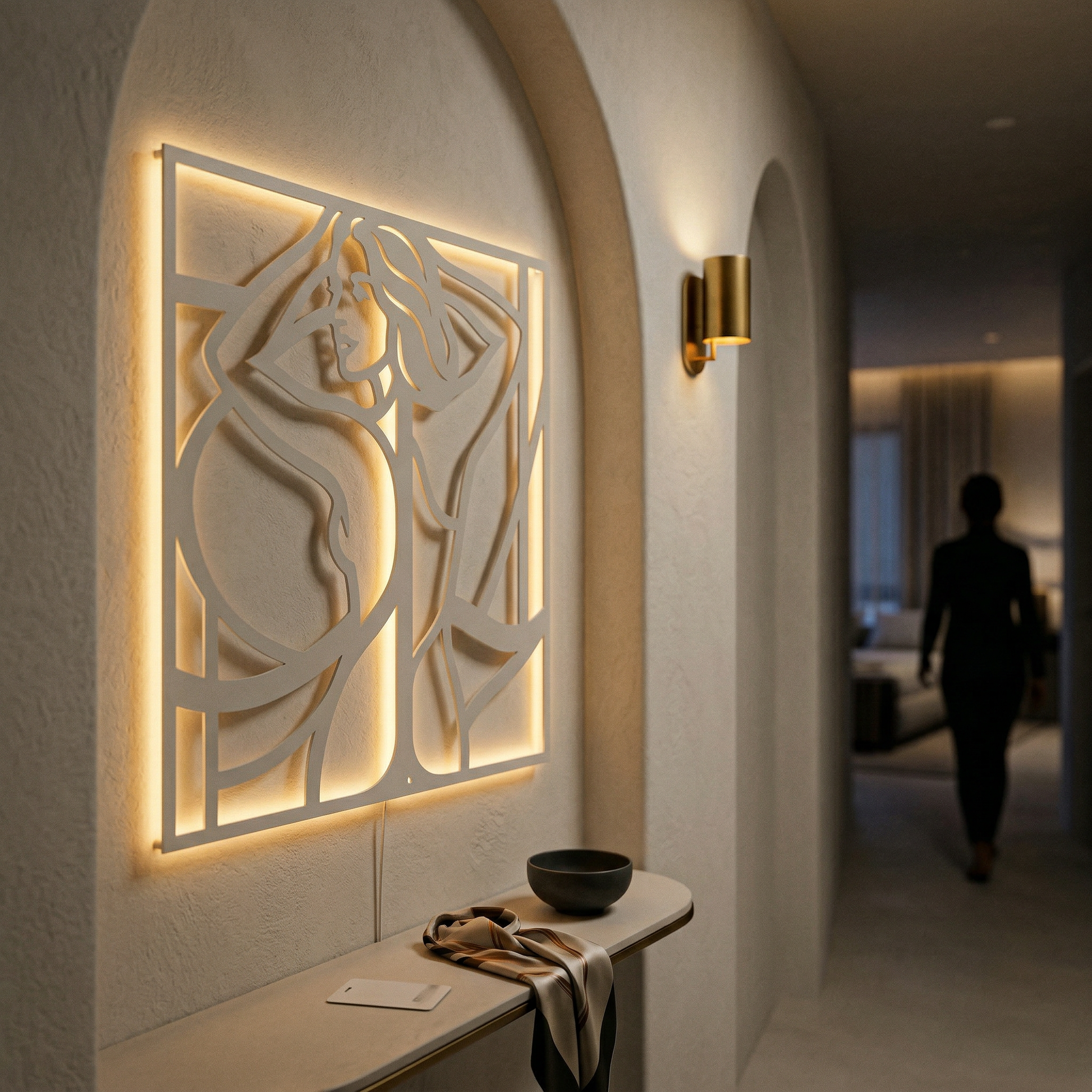 Figure silhouettes are often read as symbols of self-possession and elegance, using anonymity to keep the meaning open. The blend of soft curves and hard framing creates a poised, emblem-like portrait that balances intimacy with restraint.