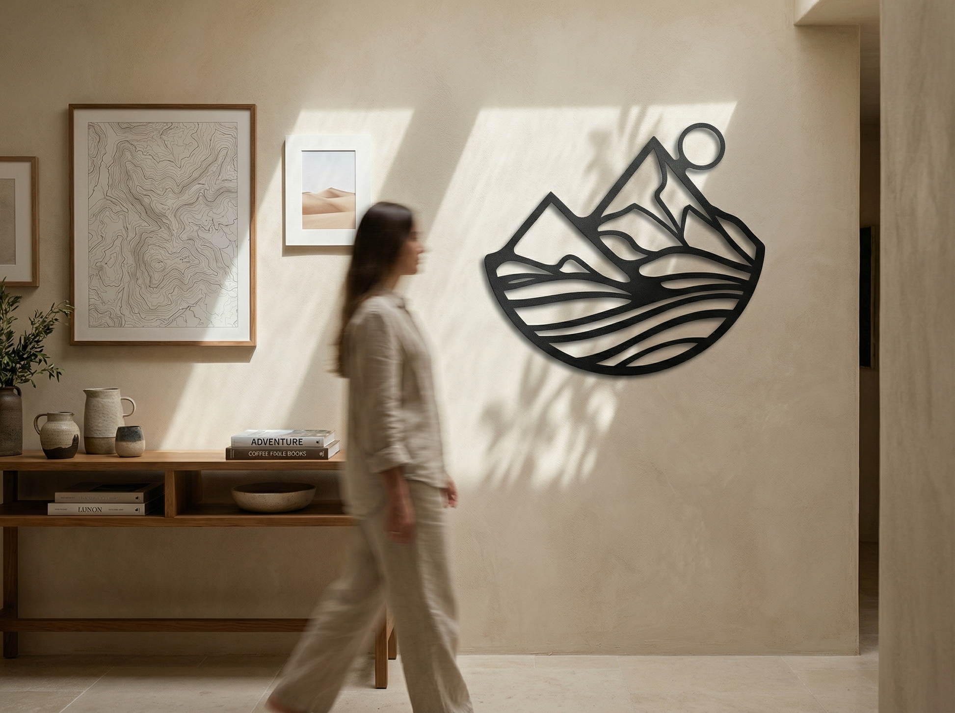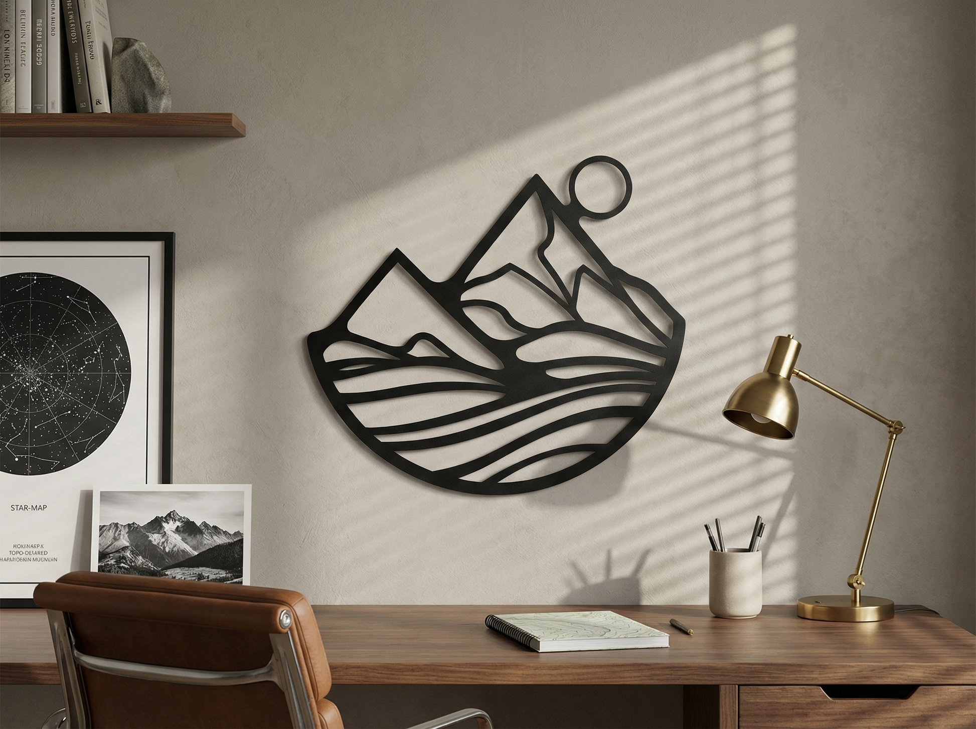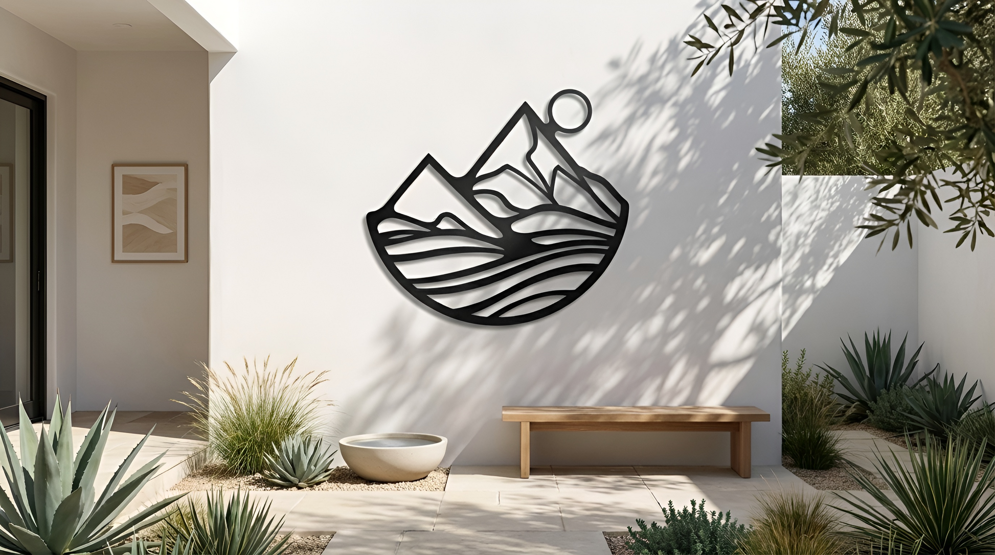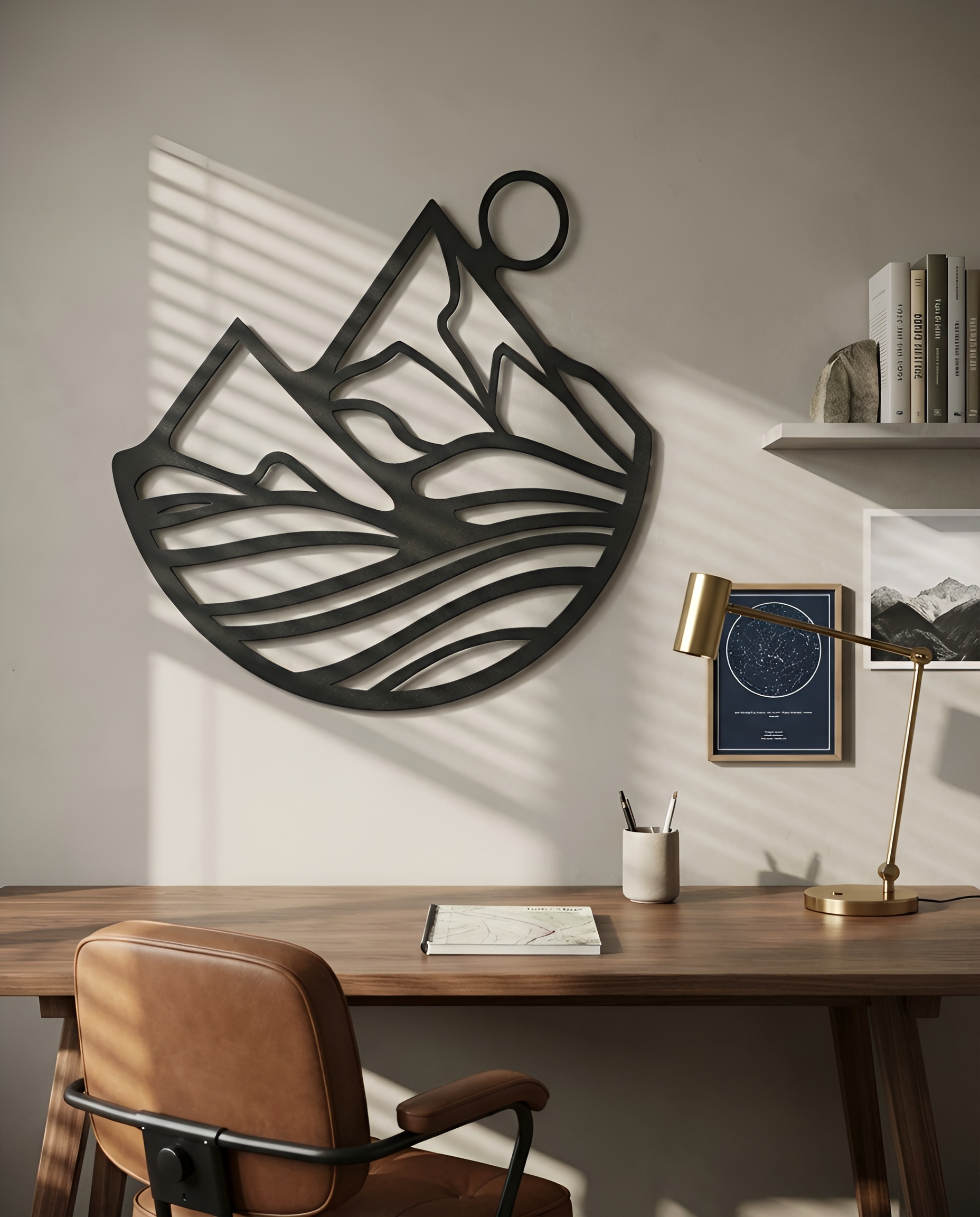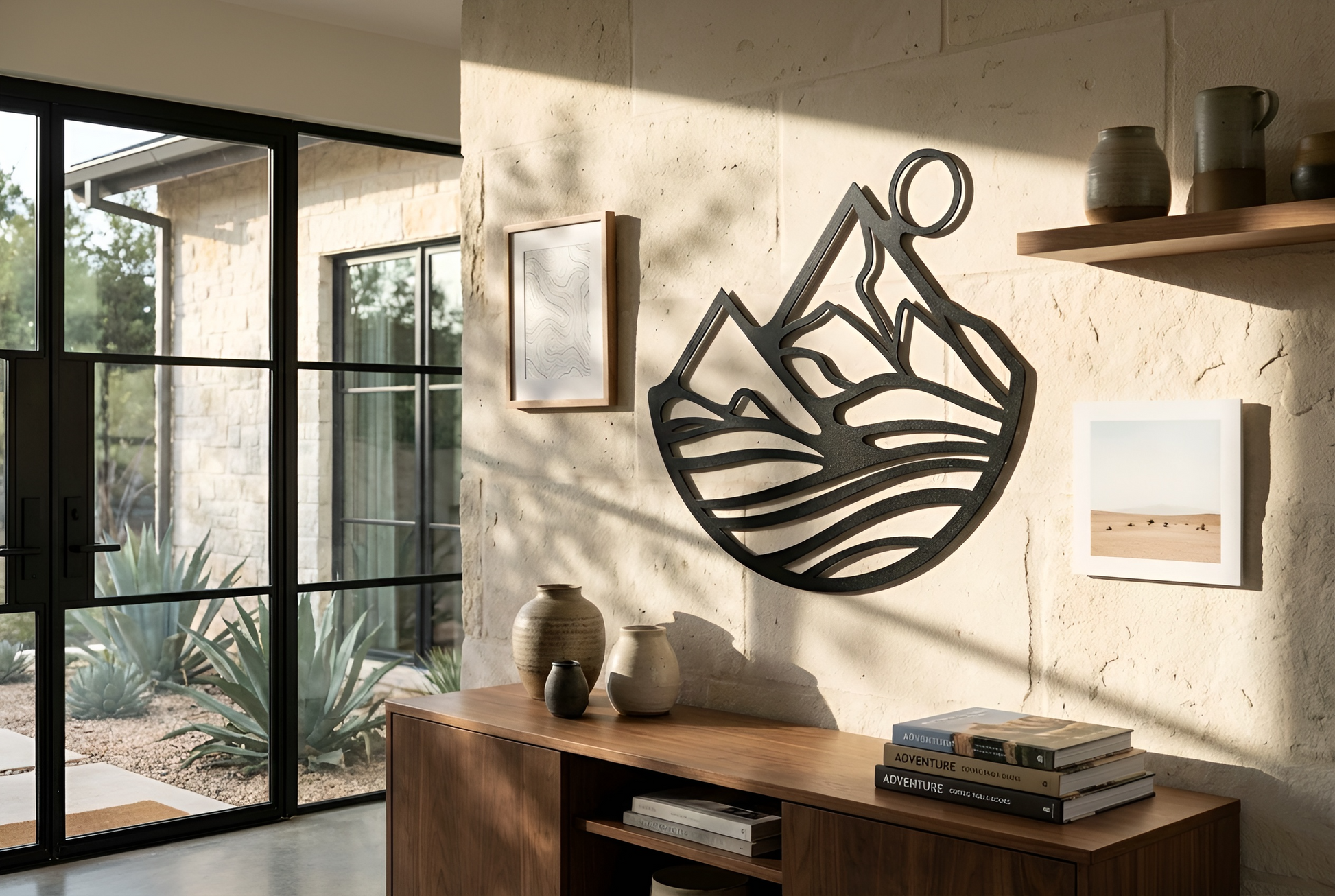 The design is translated into powder coated metal through crisp peaks, a clean solar circle, and layered cutout bands that create depth through negative space. The floating standoff brings a shadow-line separation between each contour, reinforcing the sense of terrain and motion without adding visual noise.