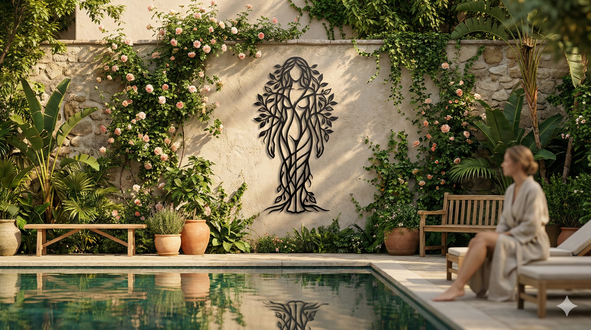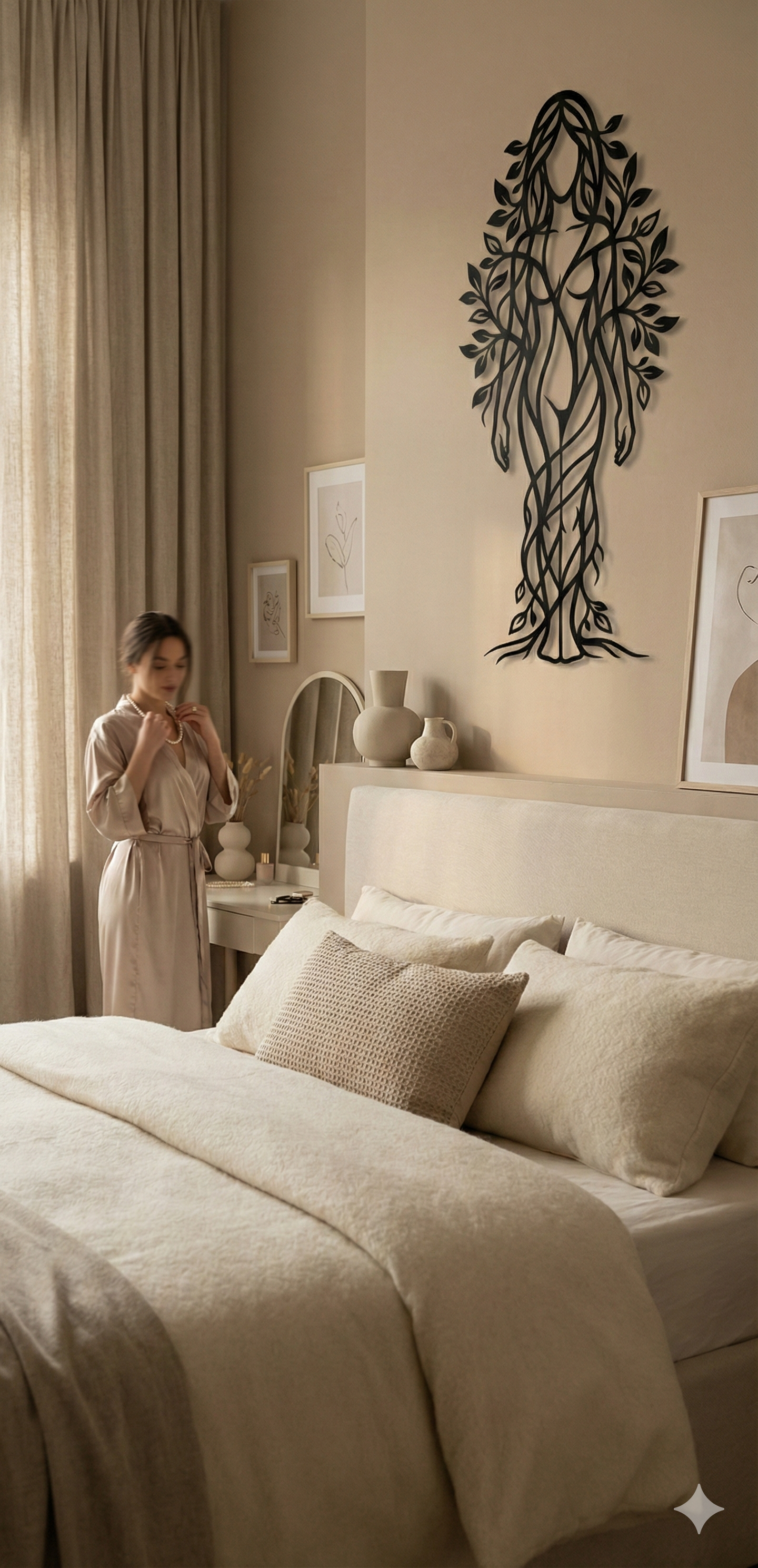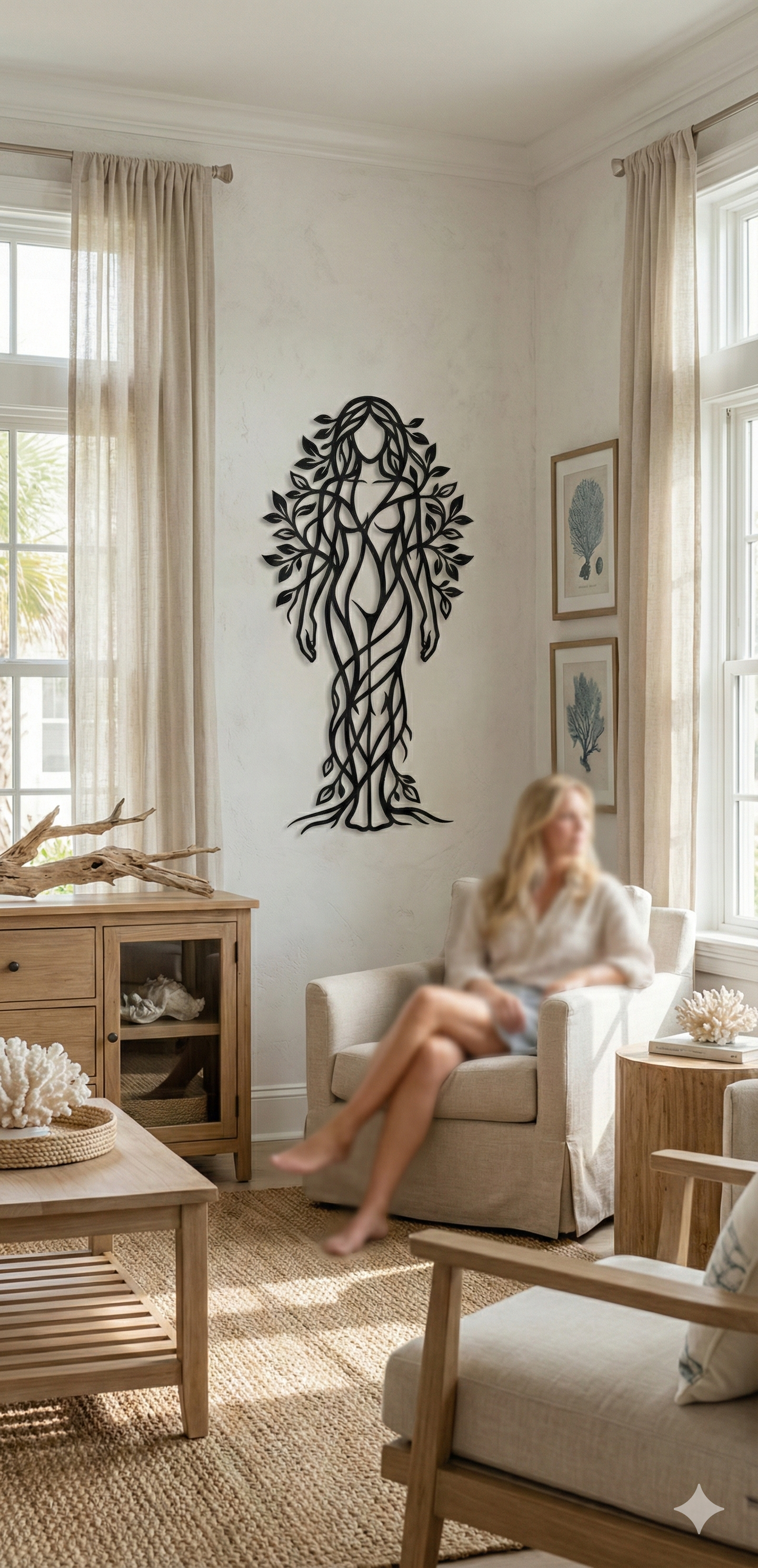 In metal, the silhouette is translated through layered, flowing cutlines that keep the body airy while preserving a clear, elegant form. Leaf clusters create rhythmic negative space around the shoulders and hair-like canopy, while root lines extend downward to anchor the composition. The standoff mount heightens the floating shadow effect, allowing the vinework to cast intricate, shifting outlines.