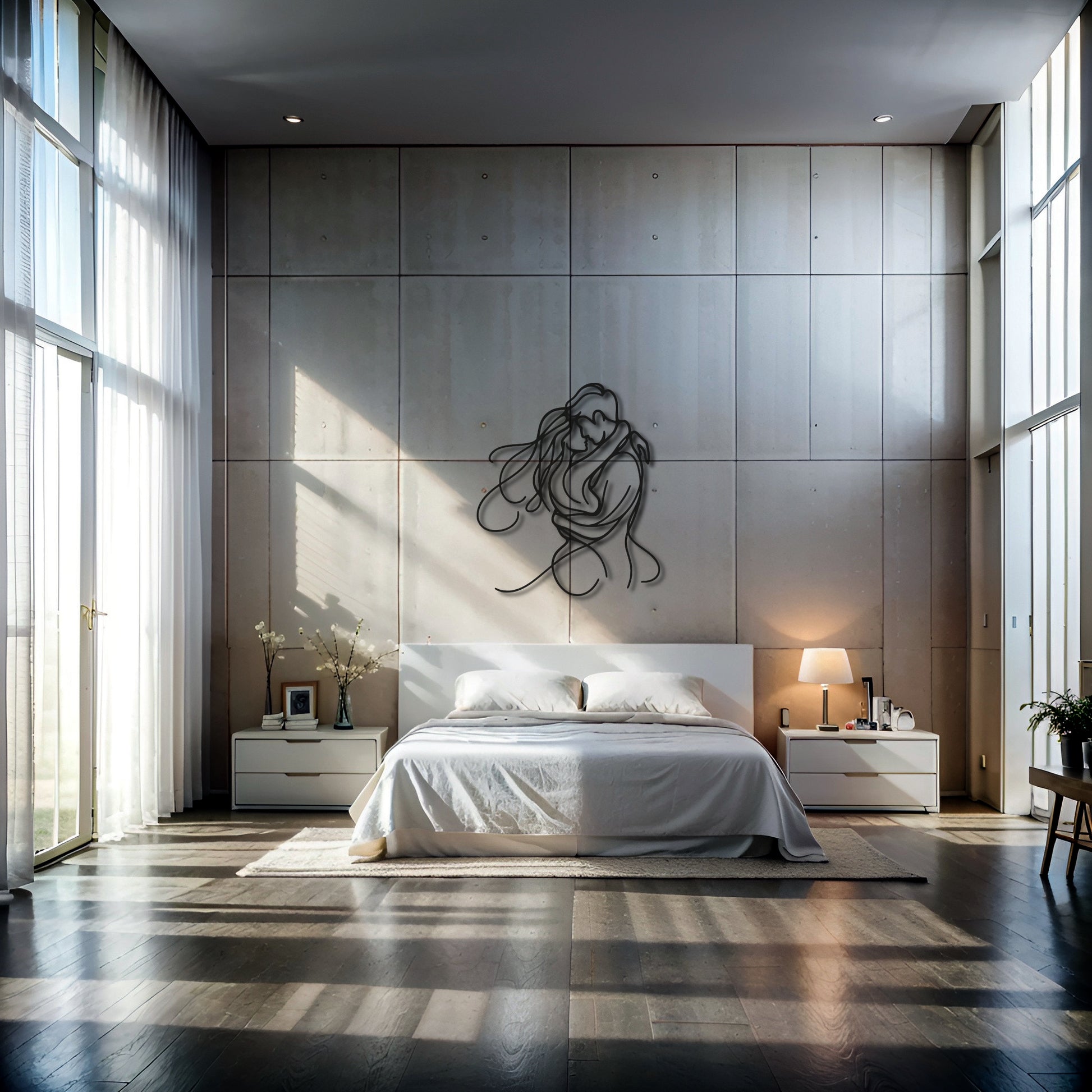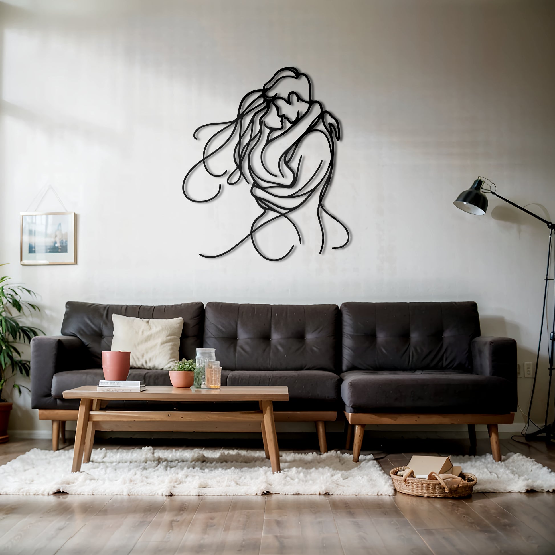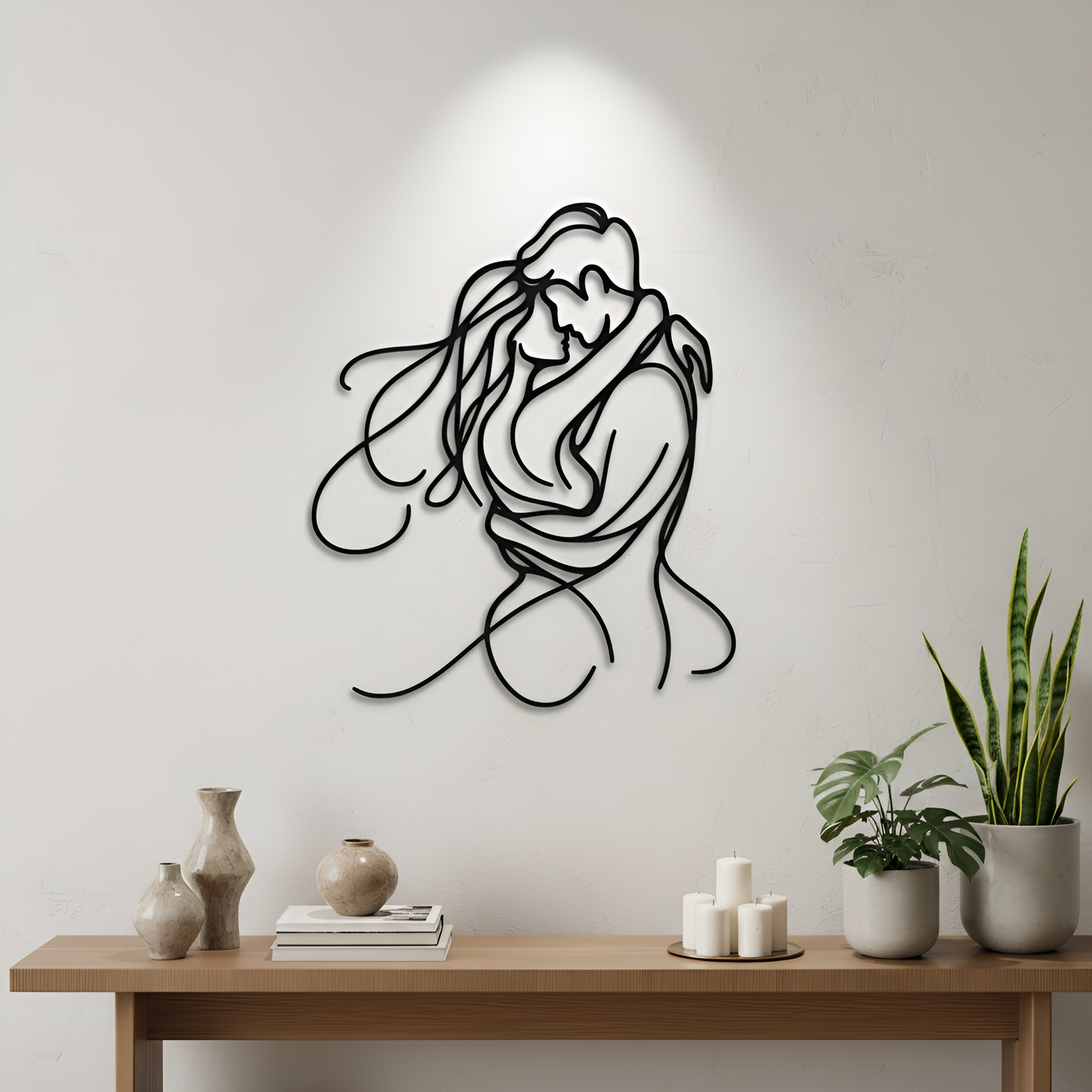 The design is translated through continuous, unbroken metal lines that flow effortlessly from one figure into the other. Faces are suggested rather than defined, allowing negative space to carry emotion. The intertwining contours create depth and movement, while the floating installation casts soft shadows that change throughout the day—making the piece feel alive, intimate, and architectural.