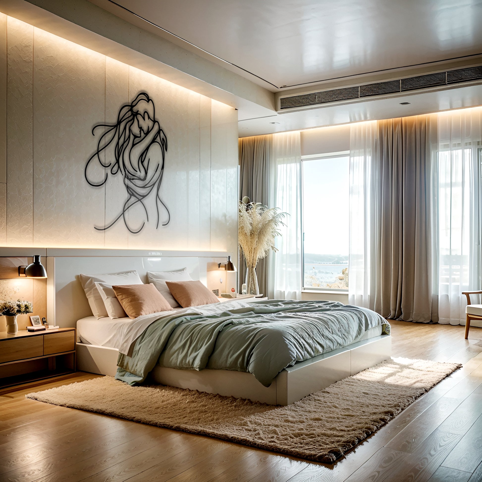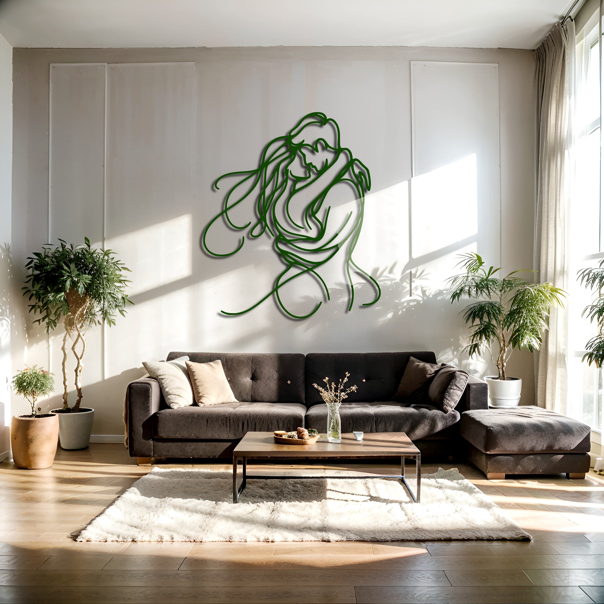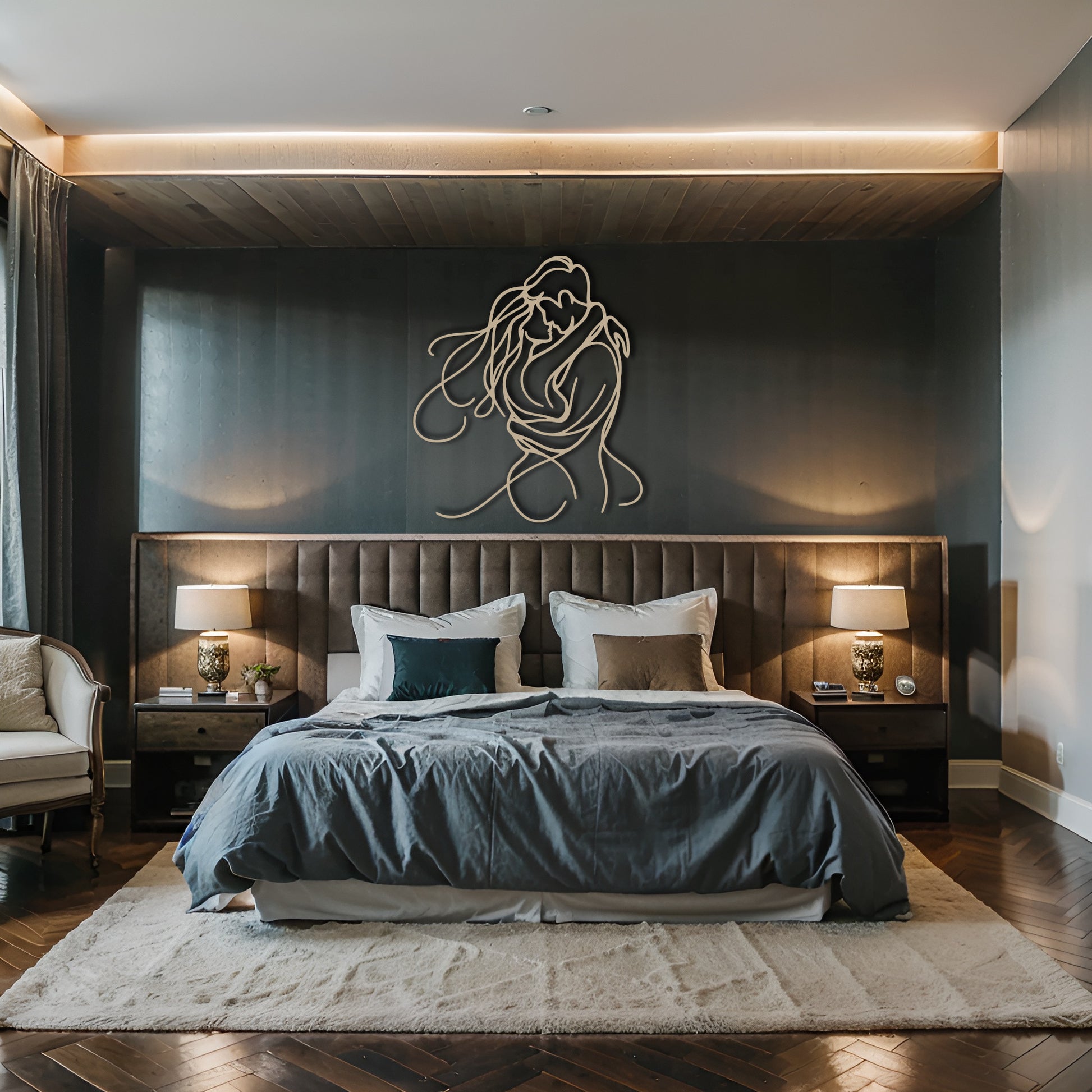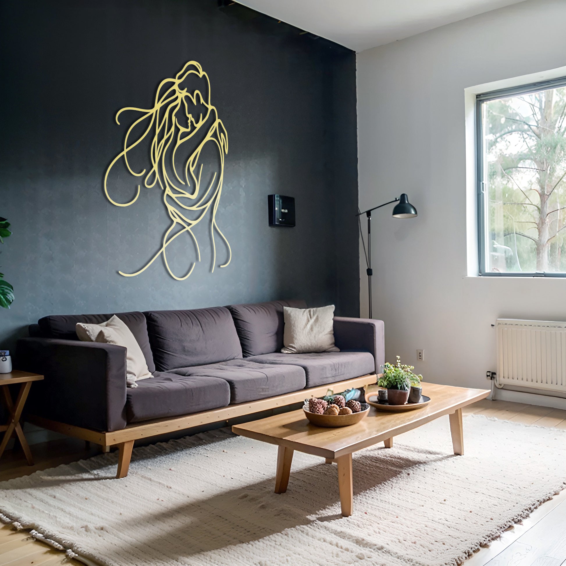 The design is translated through continuous, unbroken metal lines that flow effortlessly from one figure into the other. Faces are suggested rather than defined, allowing negative space to carry emotion. The intertwining contours create depth and movement, while the floating installation casts soft shadows that change throughout the day—making the piece feel alive, intimate, and architectural.