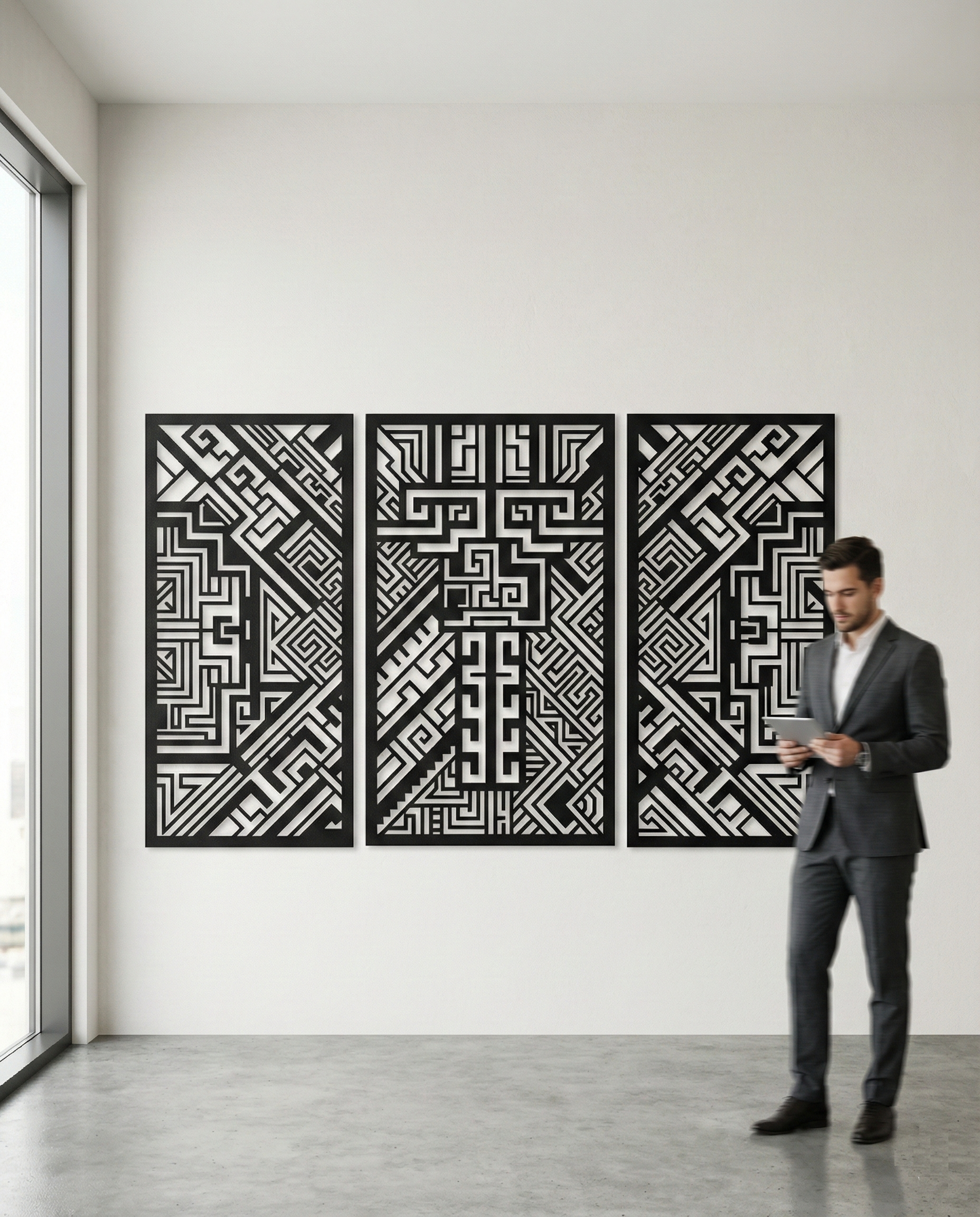 Each panel carries a dense labyrinth of stepped turns, diagonal cuts, and ceremonial border rhythms—brutalist geometry with a Mesoamerican pulse. The center panel locks the composition with a totem-like axis, while the side panels fracture and echo the motif, creating a controlled tension across the triptych. Negative space is treated as a material: it pulls light through the corridors and returns it as crisp, shifting shadow channels that deepen the relief throughout the day. Softened radius corners keep the edges calm and refined—river-worn, not mechanical.