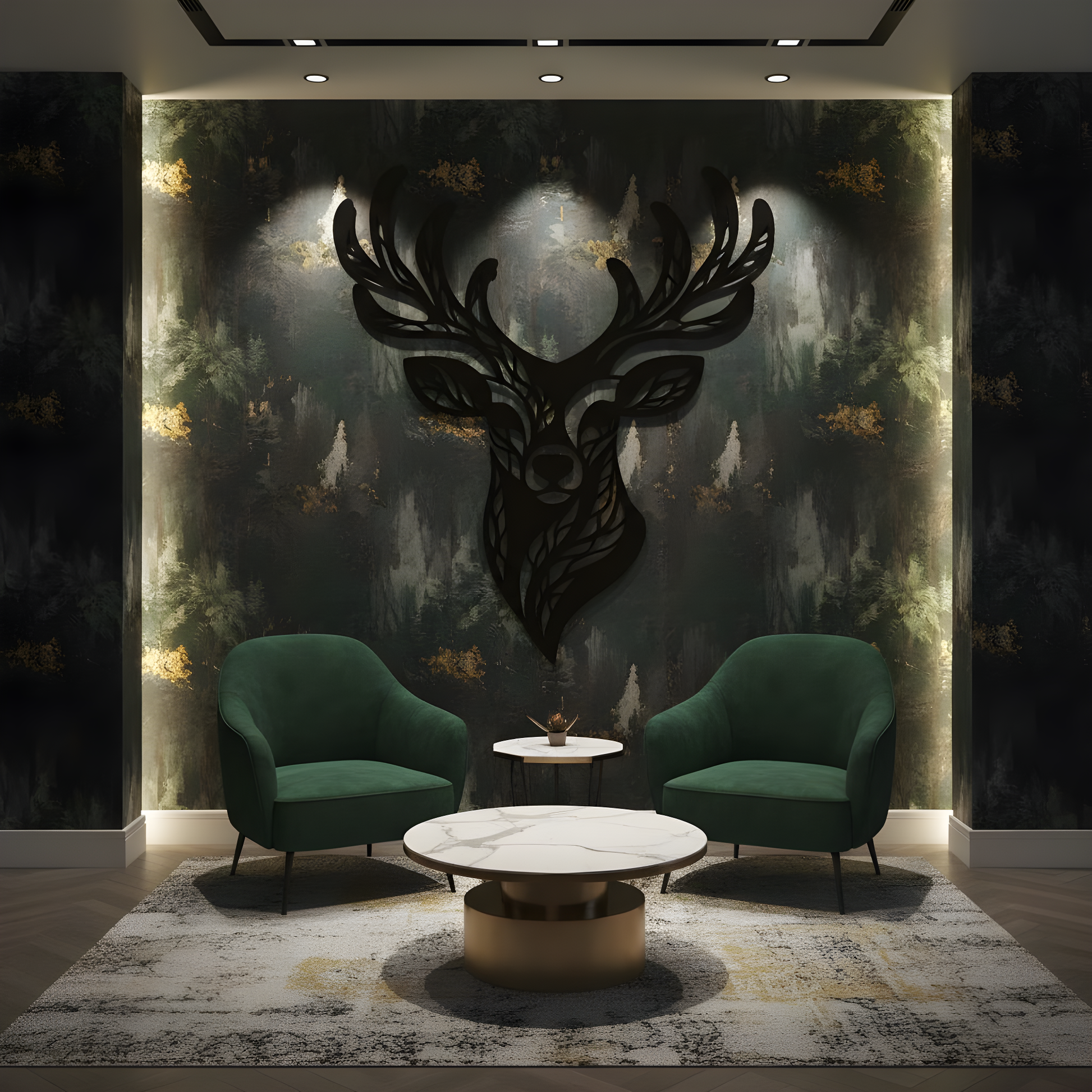A crowned stag emerges in high-contrast silhouette, its antlers branching outward like a living canopy. Within the form, flowing leaf-vein cutwork carves light into motion—organic detail held inside a disciplined outline. The negative space is intentional: it allows daylight to pass through and return as layered shadow patterns that feel calm, gallery-like, and ever-changing. Softened radius corners keep the presence balanced—more river-worn obsidian than rustic ornament.