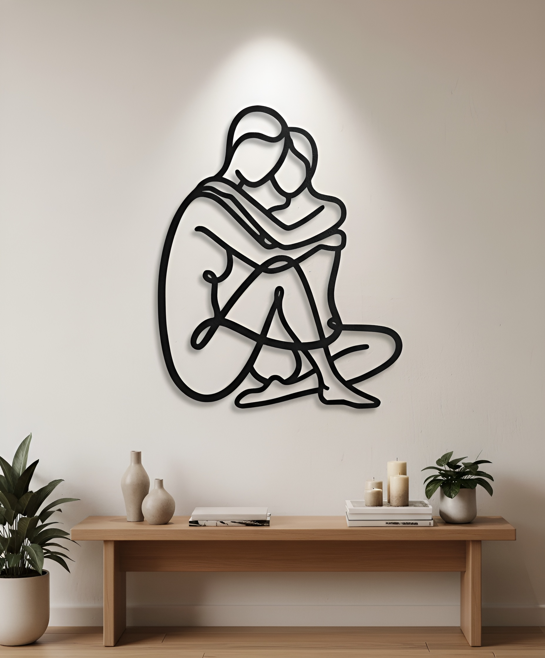 This piece is drawn as a single, unbroken contour: two figures folded into one silhouette, knees tucked, arms wrapped, the line turning with softened, river-worn radiuses. In matte black, the form reads like a modern glyph—bold from a distance, intimate up close—while the negative space becomes its own architecture. As light moves, the outline throws a slow ribbon of shadow that changes the mood without changing the room.