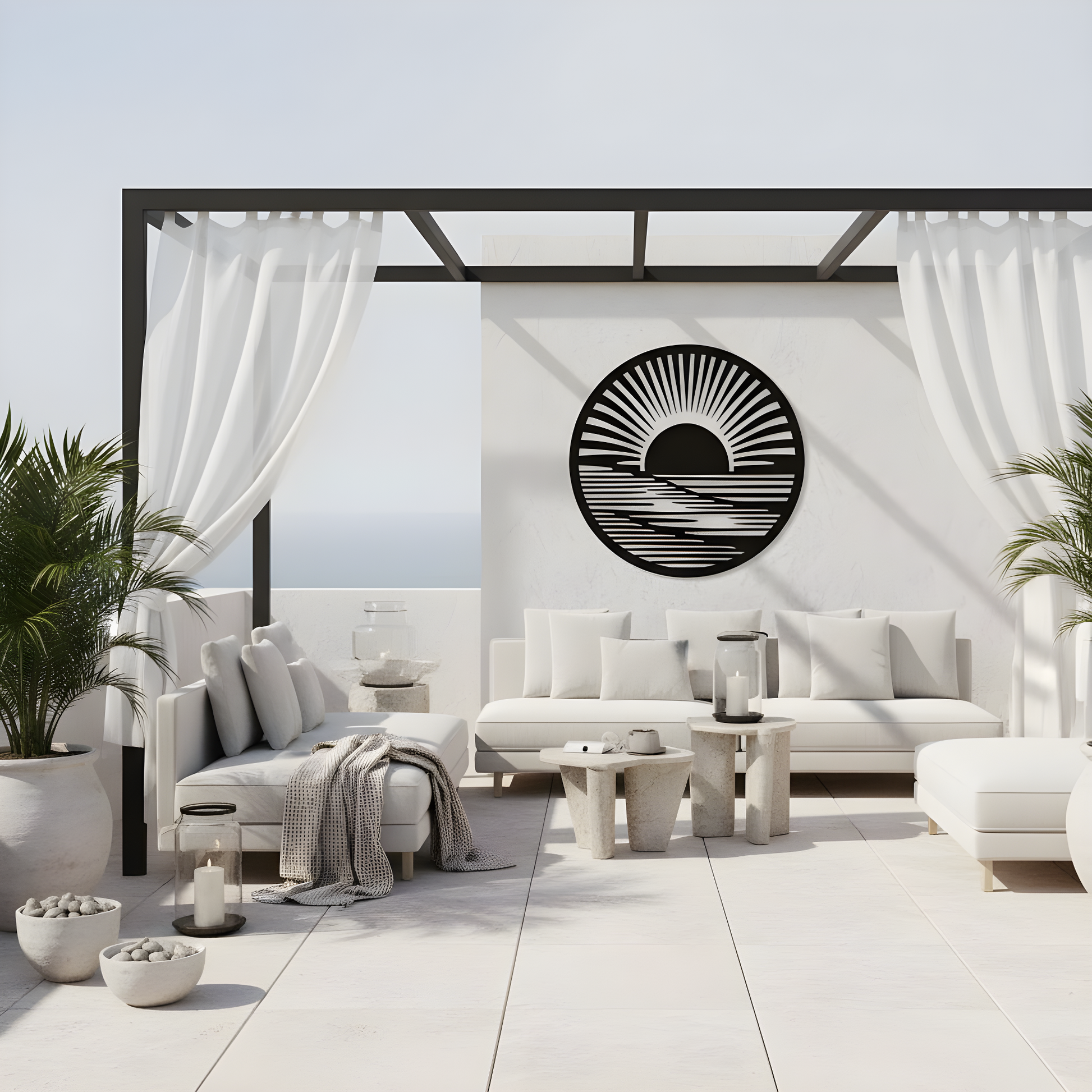 The form is a sealed circle: a half-sun anchored to a hard horizon, with long rays fanning outward like a measured crown. Below, the sea is cut into layered bands—quiet, intentional, and spacious—so the wall breathes through the negative space. In daylight, the rays read crisp and ceremonial; as the angle shifts, the waterlines cast a slow, horizontal shadow rhythm that turns stillness into motion.