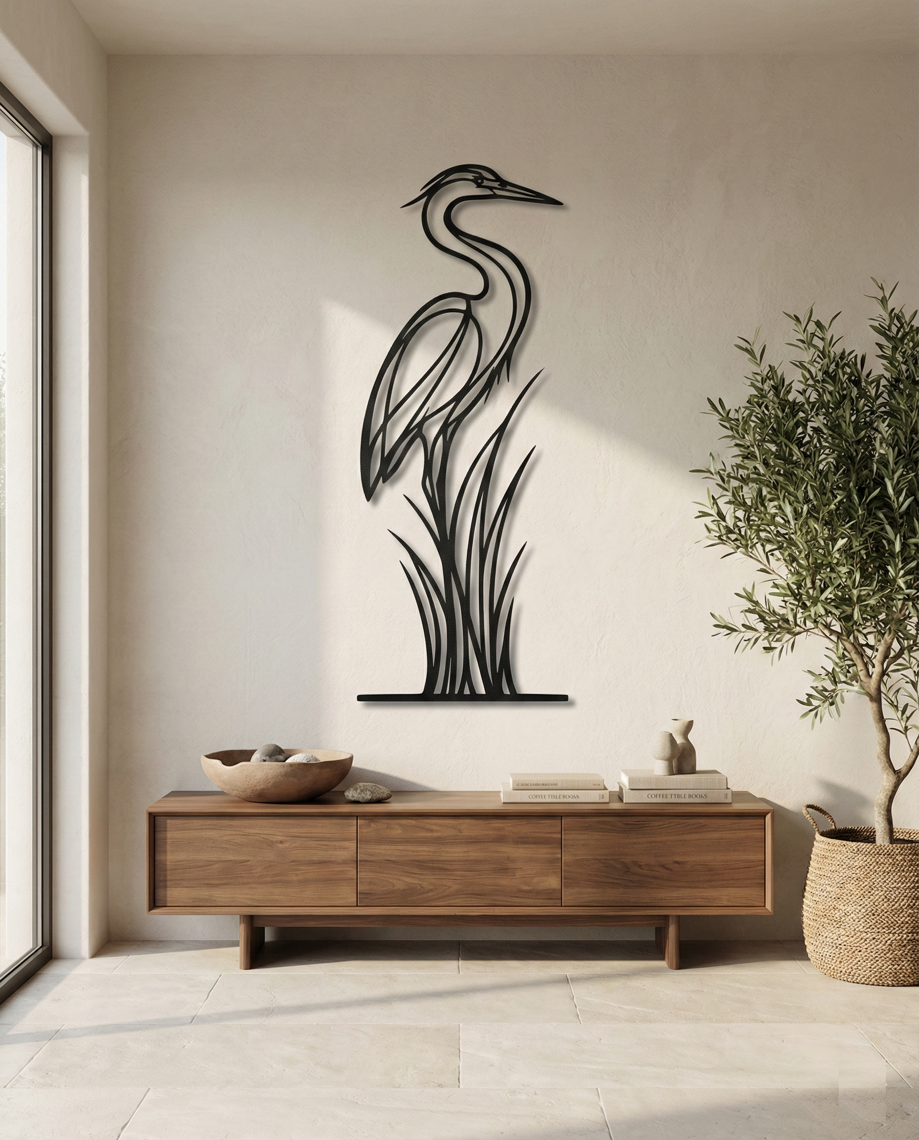 A long neck draws an elegant S-curve like carved calligraphy, while the reeds rise in clean, intentional strokes. The silhouette is minimal but commanding: open negative space, razor-precise linework, and a stance that feels like a guardian at the edge of water. When light hits it, the form doesn’t just sit on the wall—it projects, creating a slow, reed-like shadow rhythm that turns a blank surface into atmosphere.