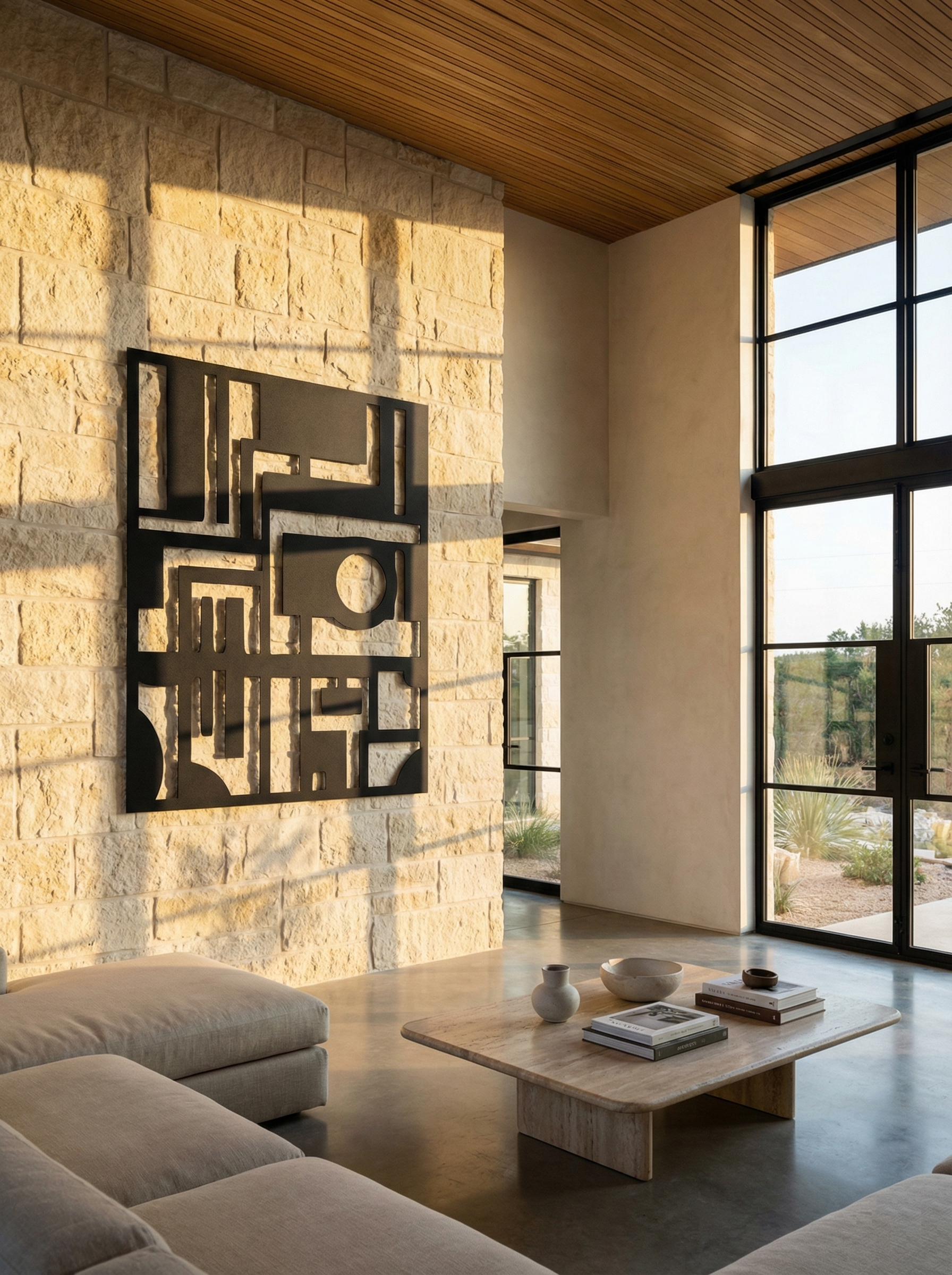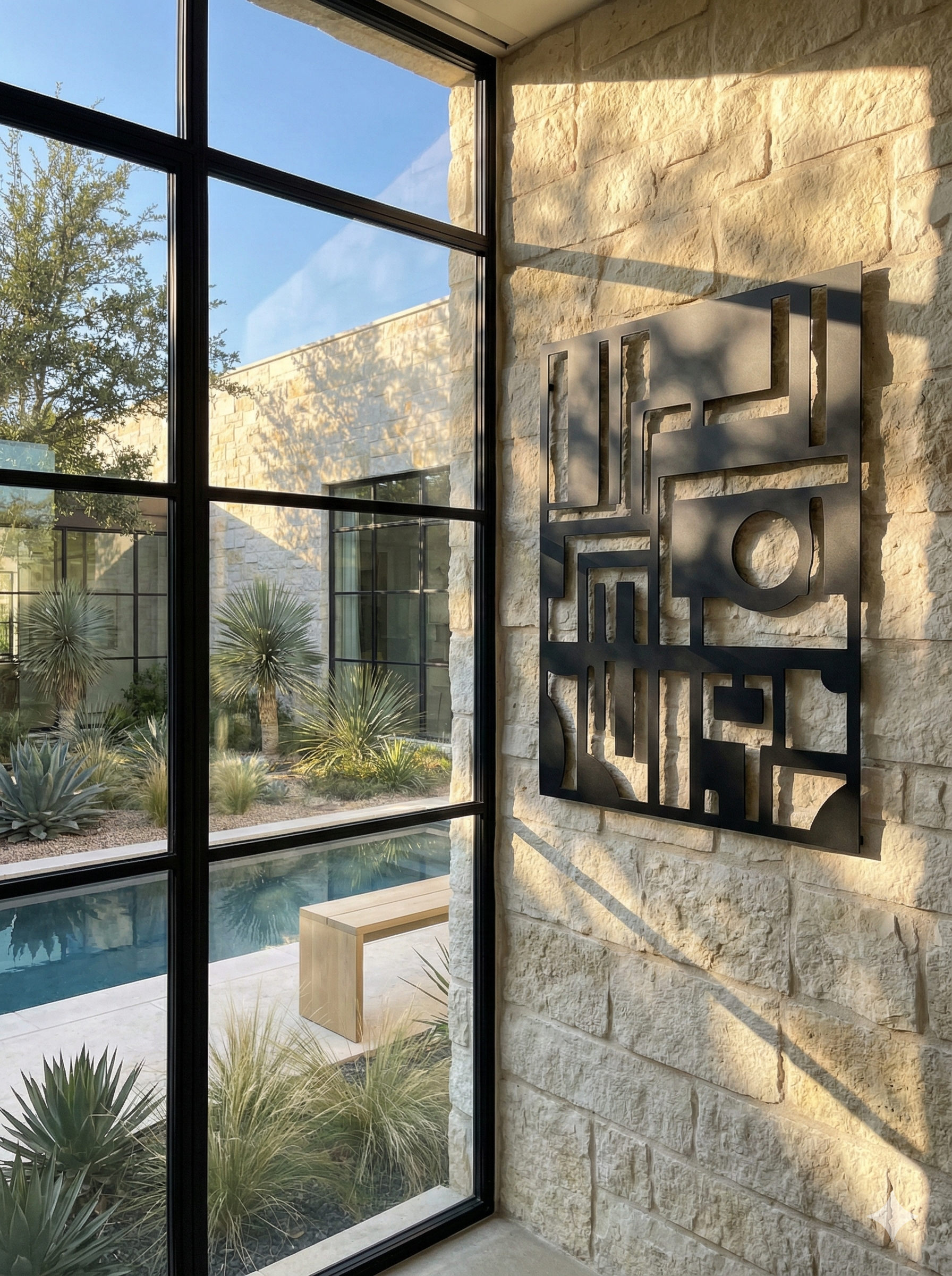 This is a brutalist maze of thick beams and softened turns, a geometry that feels ancient in spirit and modern in precision. Hard right angles meet rounded inner corners like river-worn obsidian, creating corridors of negative space that read as pathways, thresholds, and gates. The central circle acts like a sealed sun—an anchor point—while the surrounding blocks hold tension like architectural buttresses. On a textured wall, it doesn’t just hang; it casts. Shadows land in crisp bands, shifting the composition throughout the day.