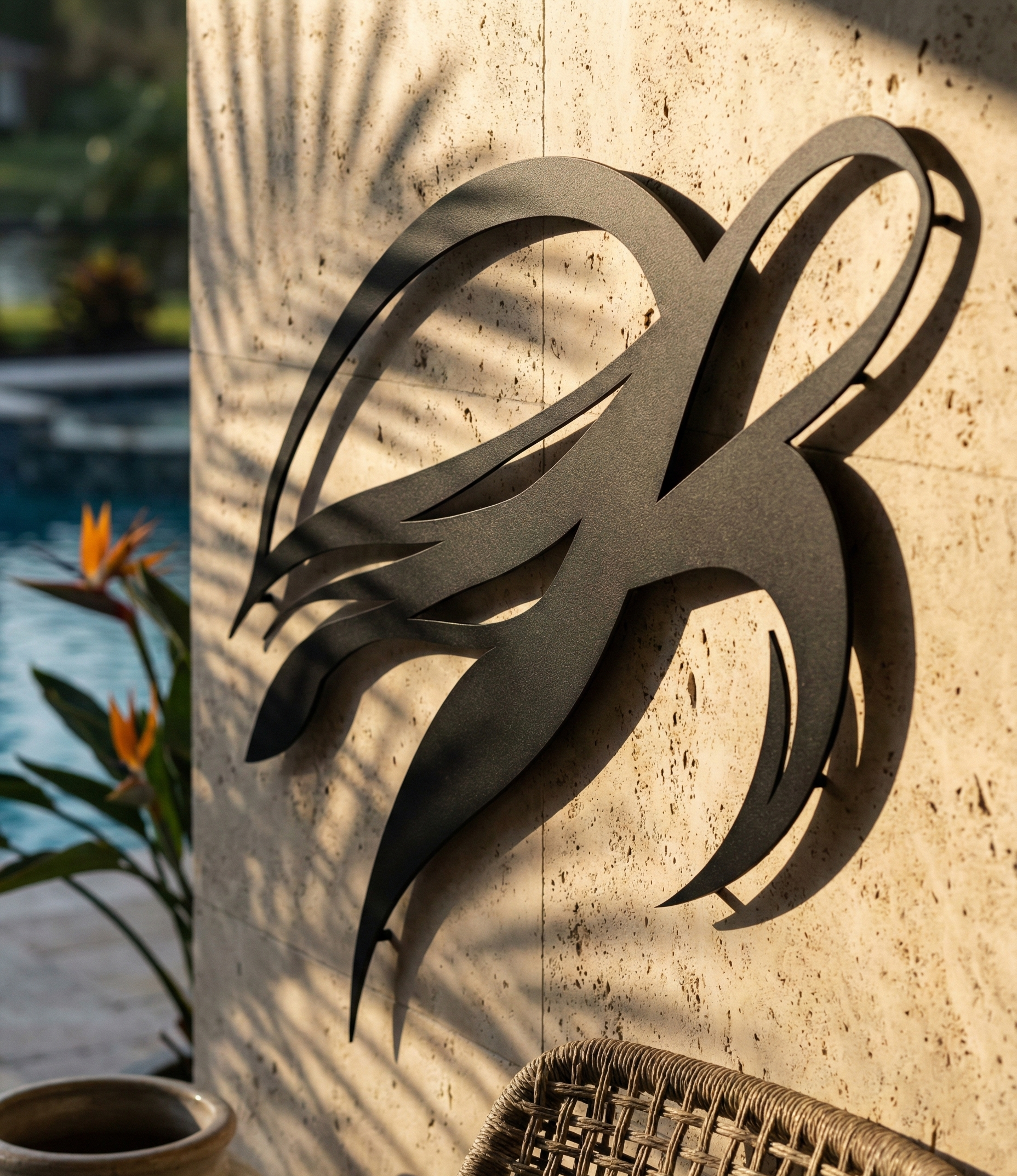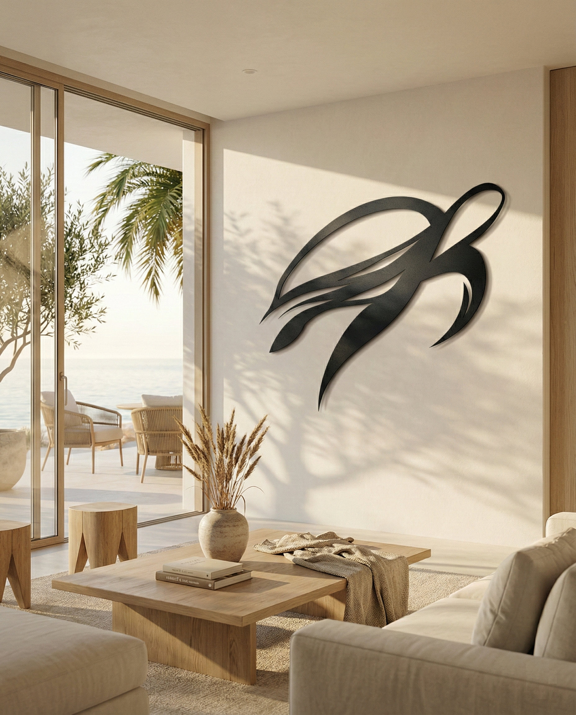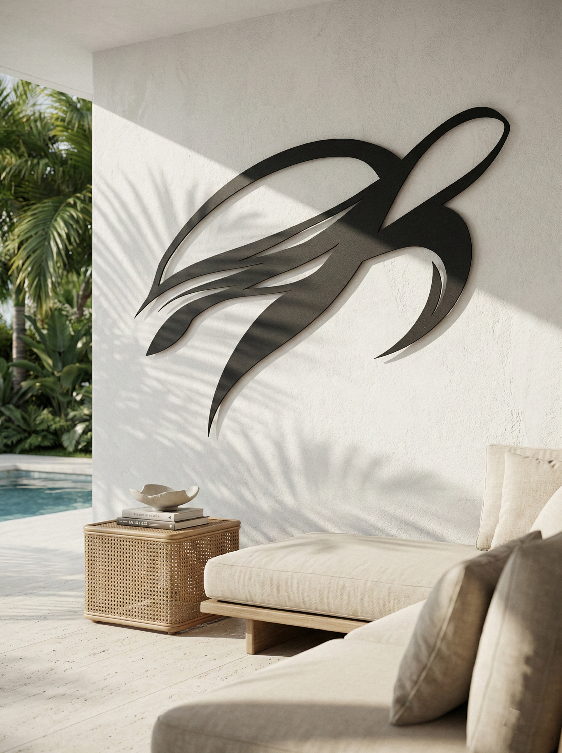 The silhouette is reduced to pure flow: a smooth shell arc, two long forward strokes, and a trailing fin line that reads like a wake. It feels ancient in spirit—totemic, protective—yet modern in its restraint. The negative space does the lifting here; when light hits, the body throws a clean, sweeping shadow that makes the wall feel like water in motion.