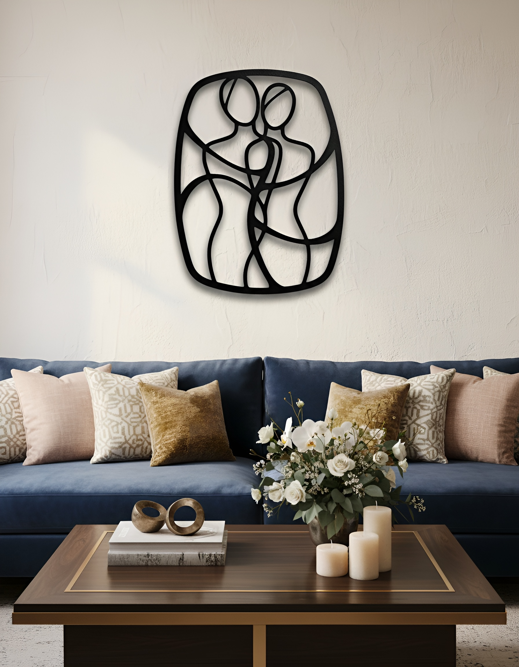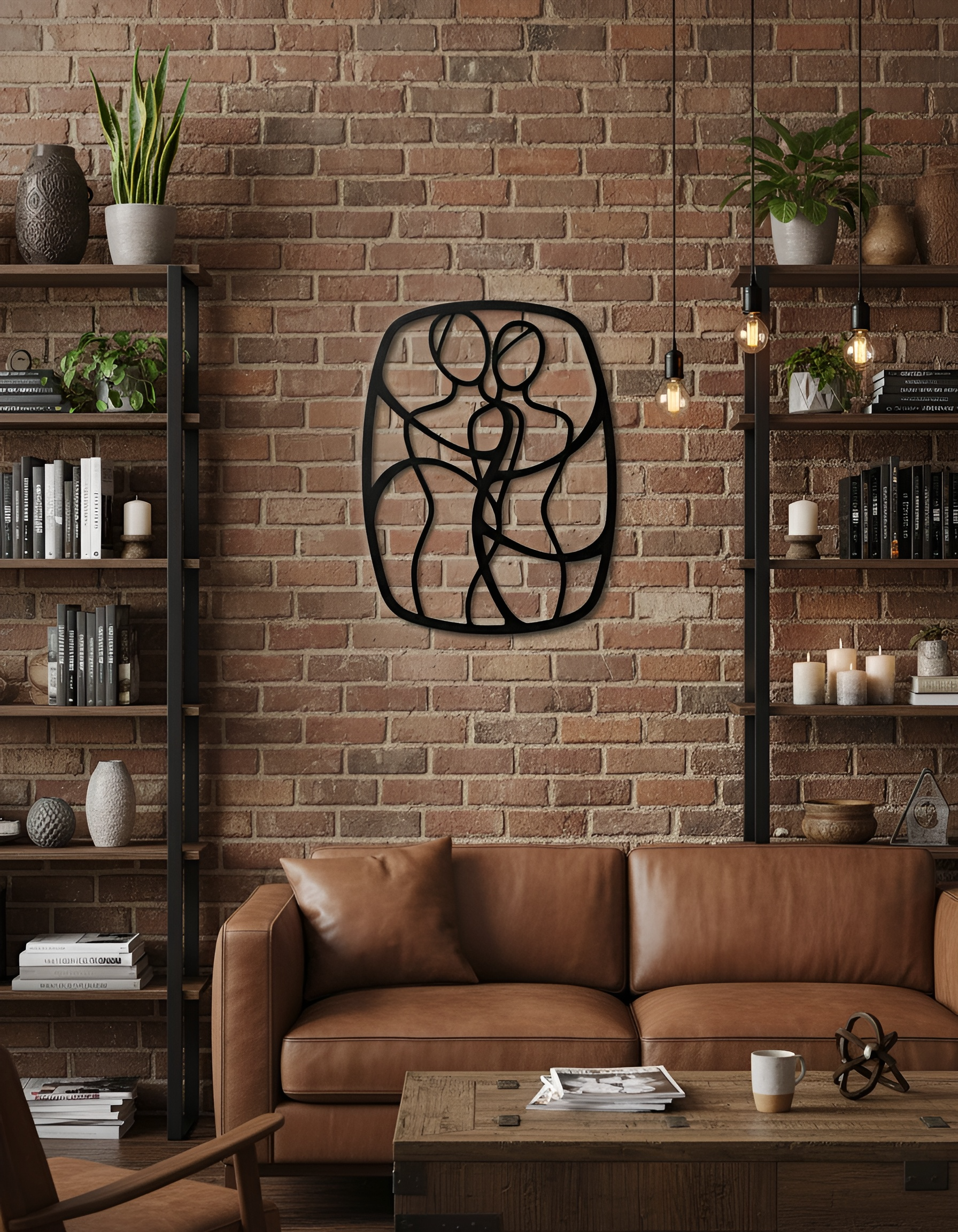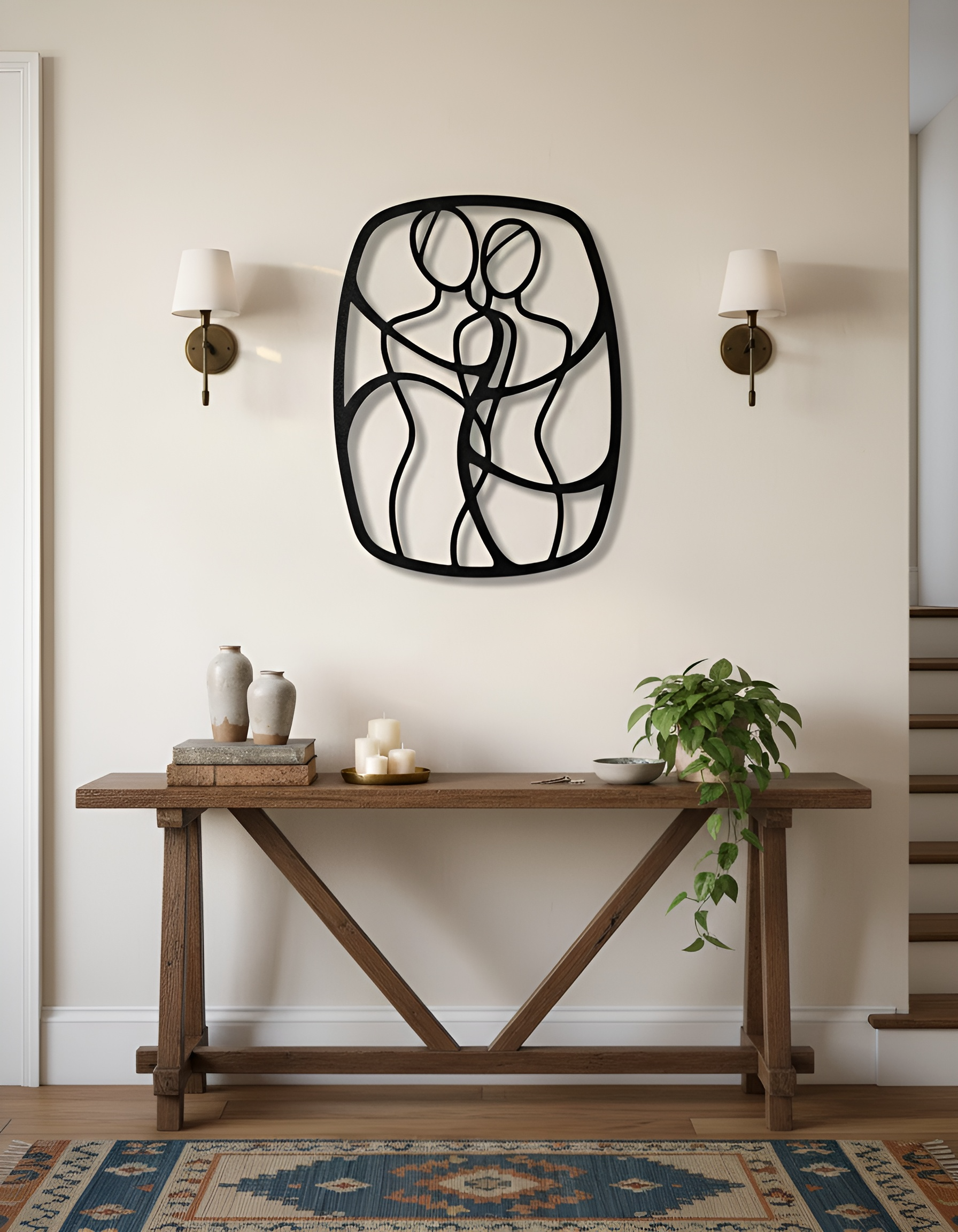 Two figures stand as one continuous gesture, drawn with calm, deliberate linework. A softened rectangular frame surrounds them like a modern portal—part boundary, part sanctuary. The negative space does the real work: it opens a quiet corridor for light to pass through, letting the piece cast a slow, architectural shadow that changes throughout the day. Every corner is gently radiused—river-worn, obsidian-smooth—so the form feels balanced, grounded, and intentional.