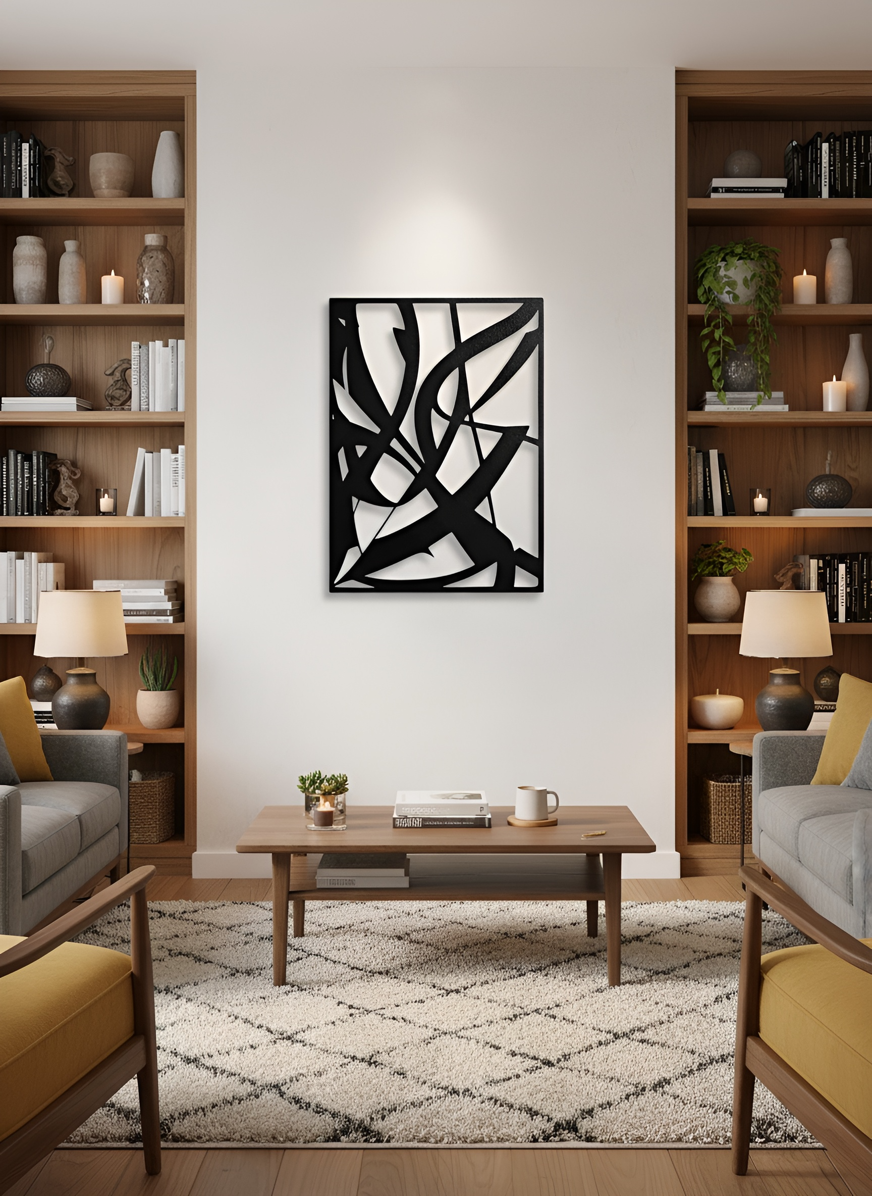 This piece is pure tension: sweeping arcs, intersecting corridors, and a decisive centerline that reads like a carved glyph. The composition is intentionally asymmetrical—brutalist in weight, calligraphic in flow—where negative space becomes the architecture. Up close, you feel the softened radiuses and clean cut paths; from across the room, it lands like a modern sigil. As light shifts, the open channels and thick strokes cast bold, layered shadows—turning the wall into a quiet, changing field.