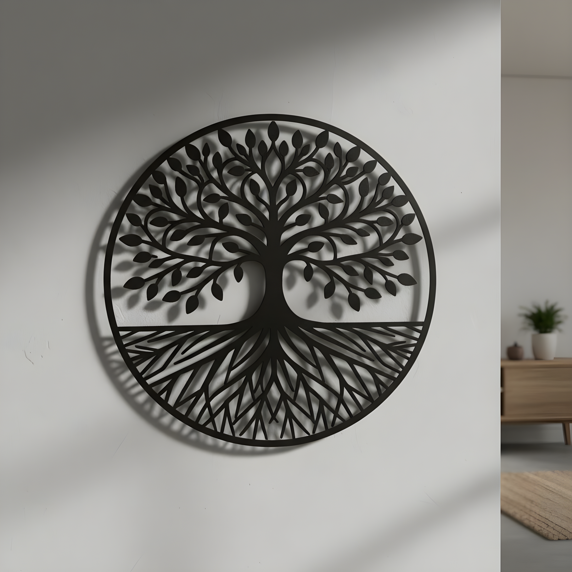 A full-circle medallion frames a tree in perfect balance: a confident trunk, a disciplined canopy of leaves, and a root system that fans outward like etched strata. The geometry stays clean and deliberate, letting negative space carry the rhythm. In natural light, the canopy and roots cast a layered shadow bloom—soft at dawn, crisp and graphic by late afternoon. Softened radius corners keep the silhouette refined, echoing river-worn obsidian in a calm, modern form.