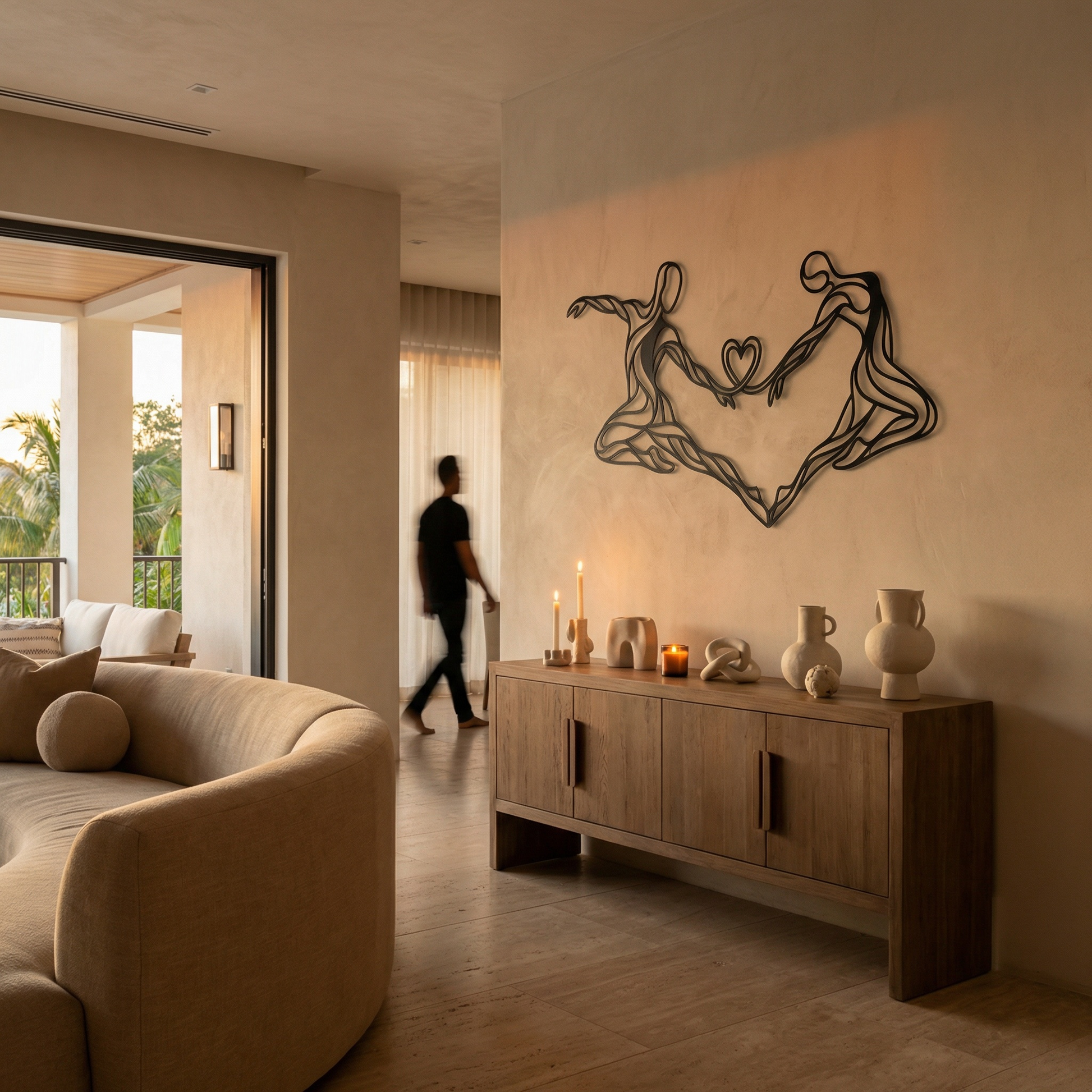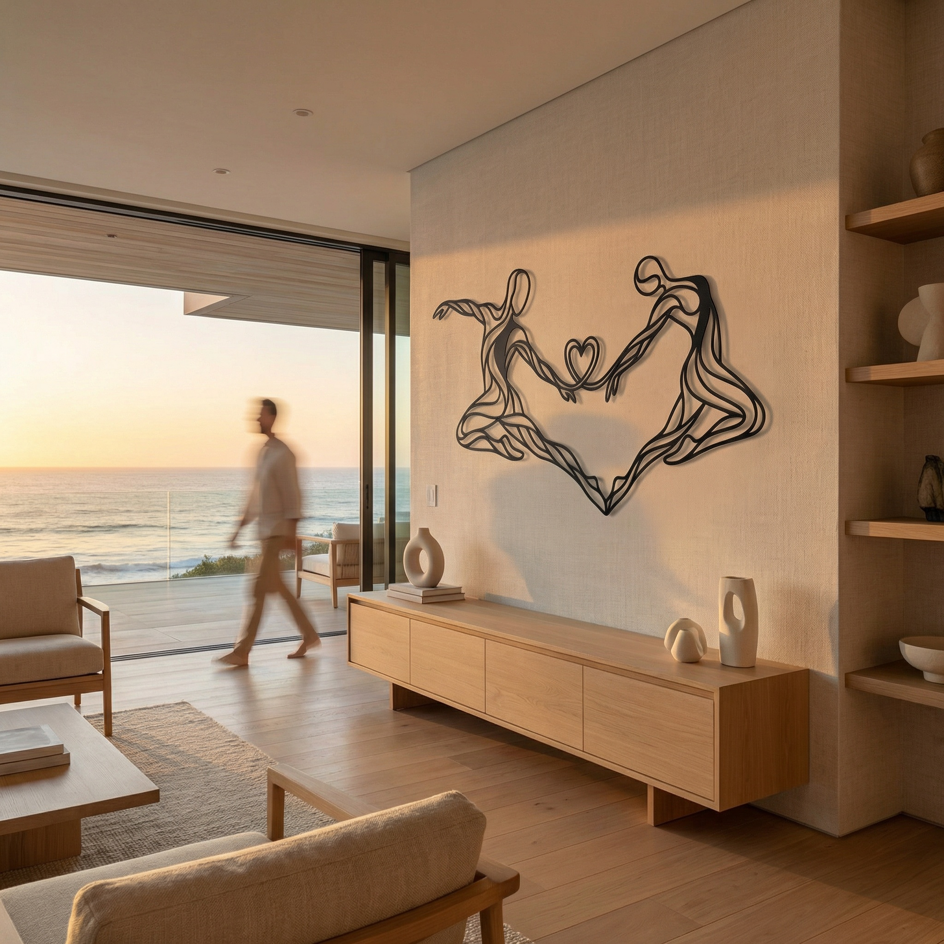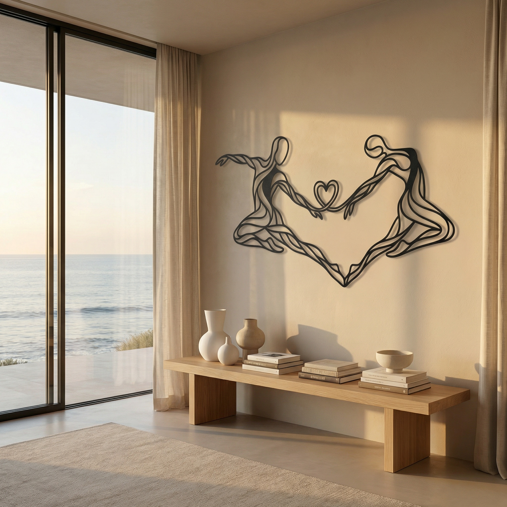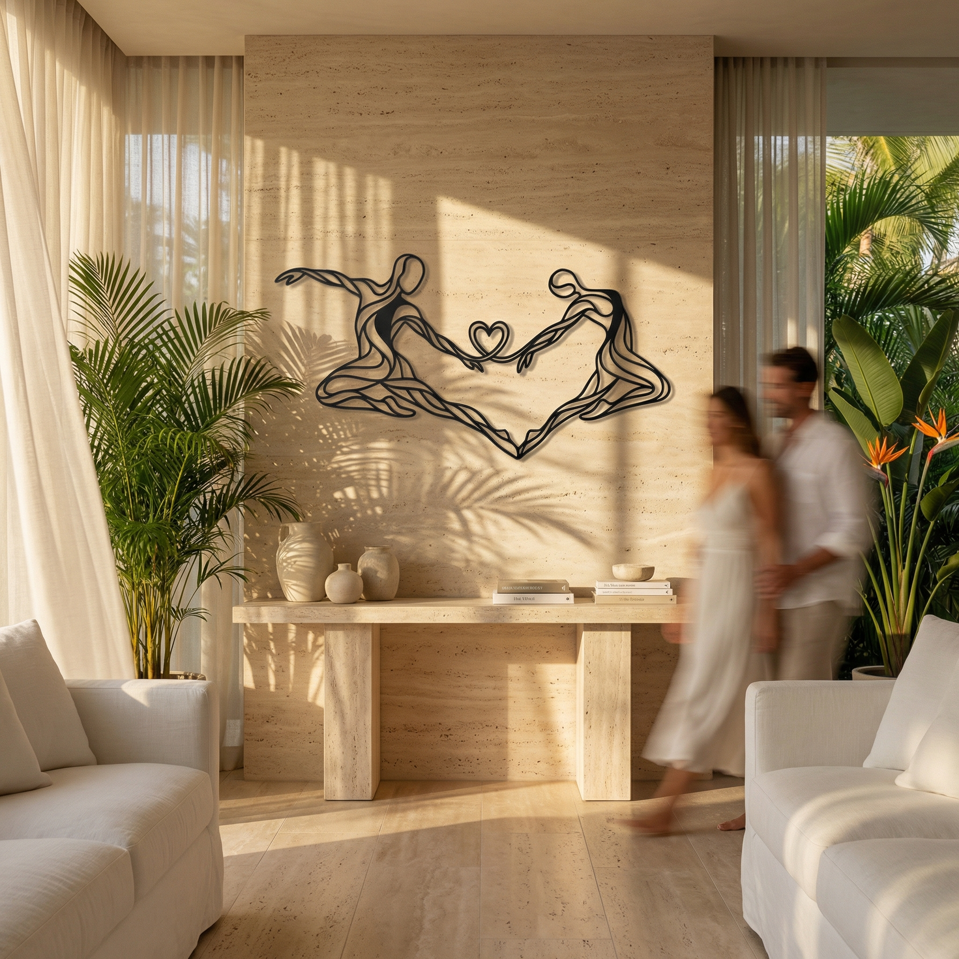 The design translates this idea through continuous, flowing metal lines that never fully separate. Each figure is reduced to essence—gesture, posture, motion—allowing negative space to carry as much emotion as form. The heart suspended between them is not ornamental; it is structural, formed by the same lines that define the bodies, reinforcing the idea that connection is not added, but inherent. When mounted, the raised profile creates soft shadows that animate the piece as light shifts throughout the day.