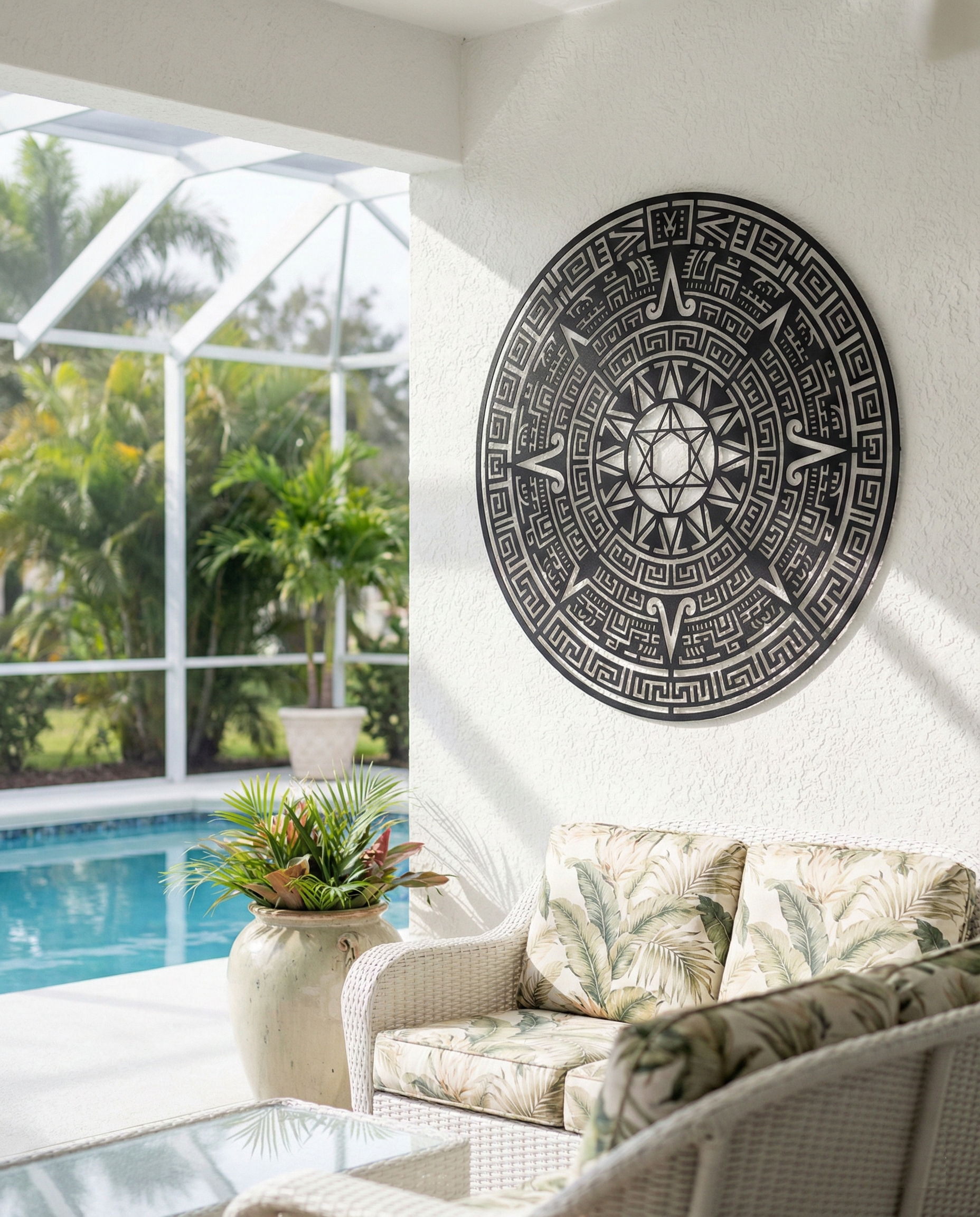 Concentric rings of stepped geometry lock into a ceremonial medallion, while the compass points cut outward like guarded thresholds. At the core, a faceted star sits inside a sealed circle—calm, centered, uncompromising. The pattern is dense by intent: it rewards proximity, then reads as pure authority from across the room. Light threads through the labyrinthine cutwork and throws a shifting halo of shadow—crisp lines in the morning, deeper relief by evening.