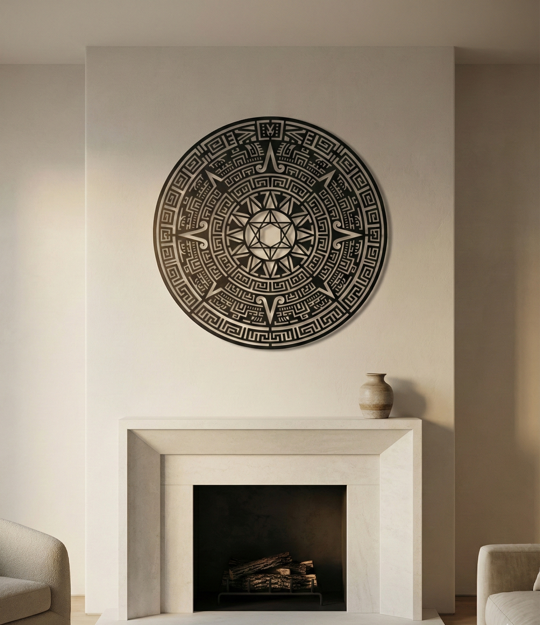 I designed The Sunstone Compass for spaces that demand direction—an architectural anchor that turns a wall into a point of certainty.