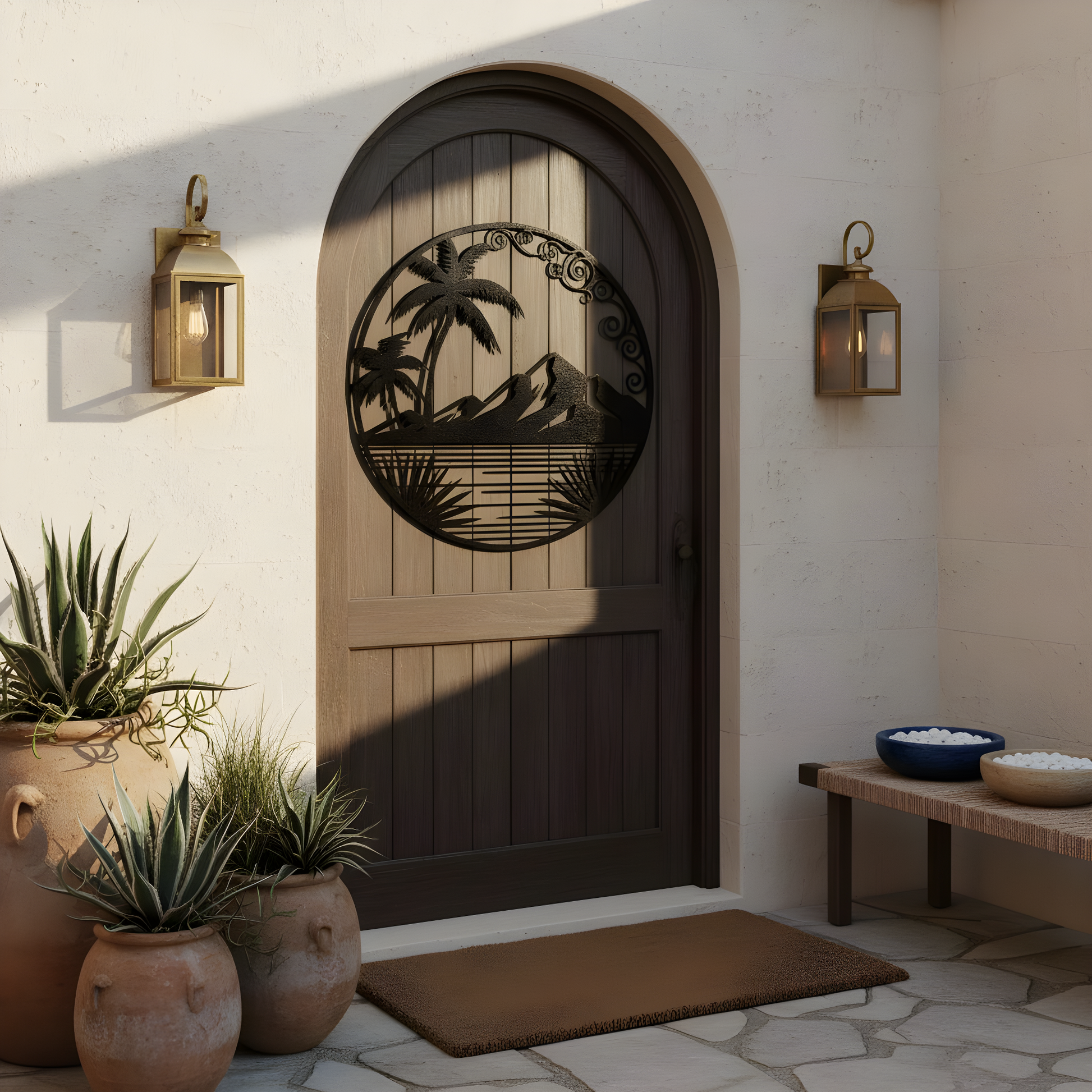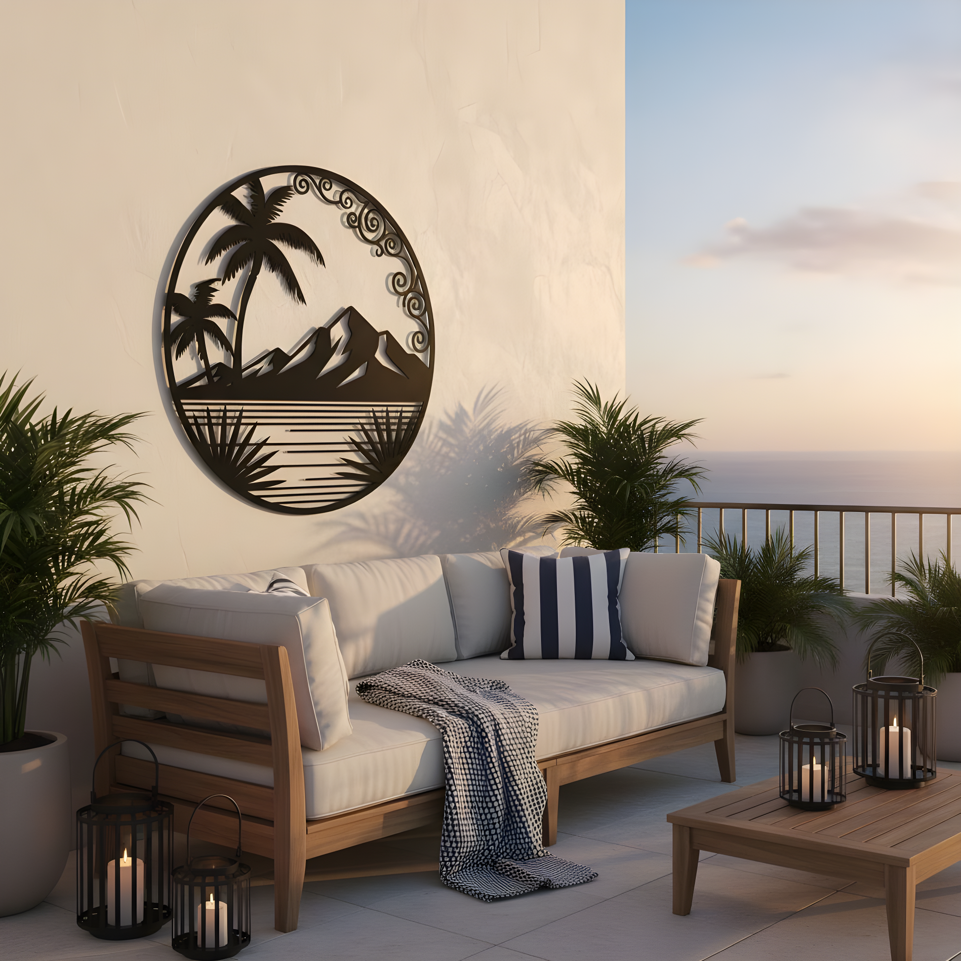 A circular medallion frames palms and a mountain ridge above a banded shoreline, with clean waterline striations that read like drafted contours. A subtle scrollwork arc crowns the scene, adding a ceremonial edge while keeping the silhouette disciplined and modern. The negative space is intentional: it lets light pass through the canopy and shoreline lines, returning as crisp, layered shadows that shift from morning haze to sharp afternoon geometry.