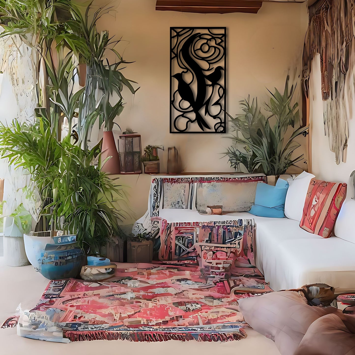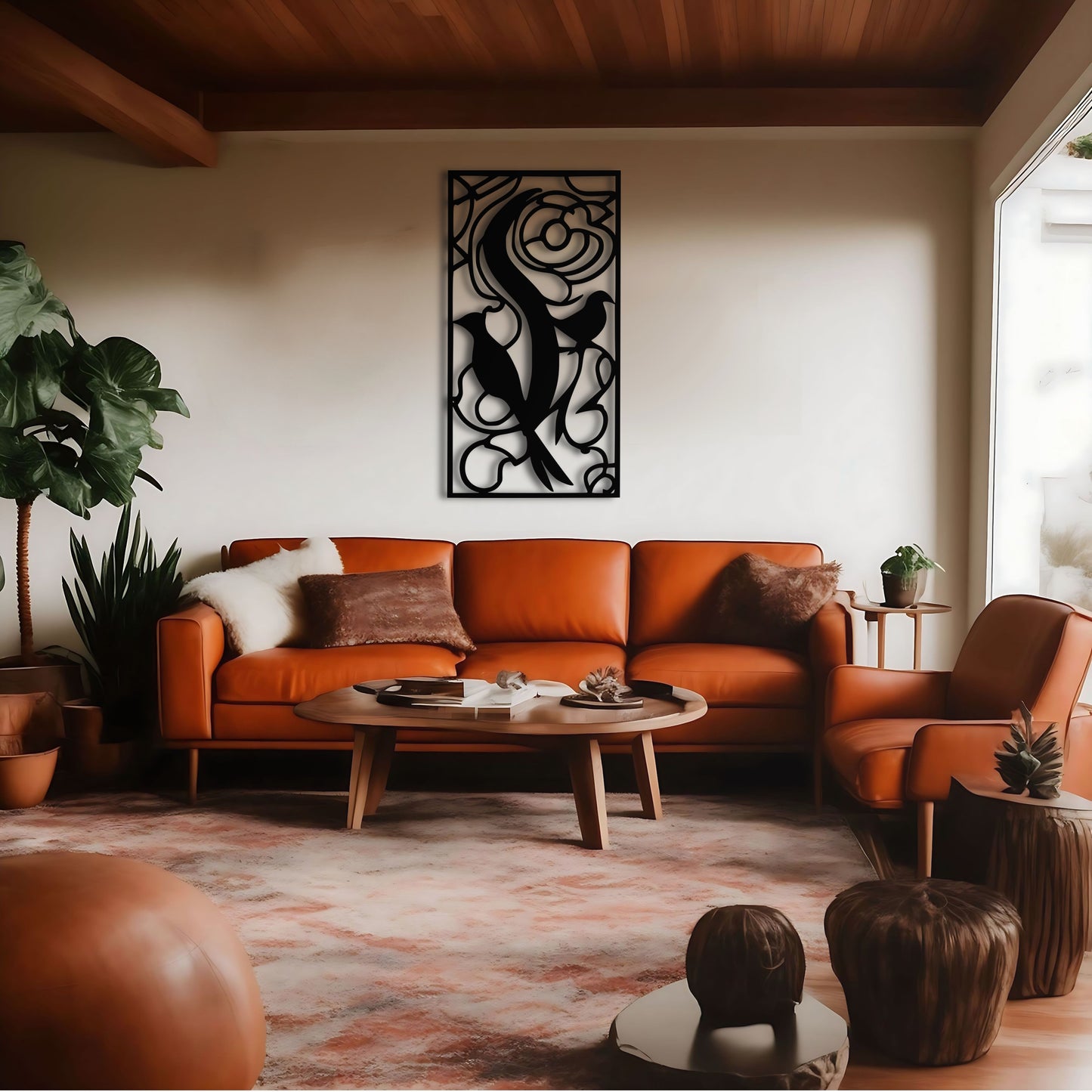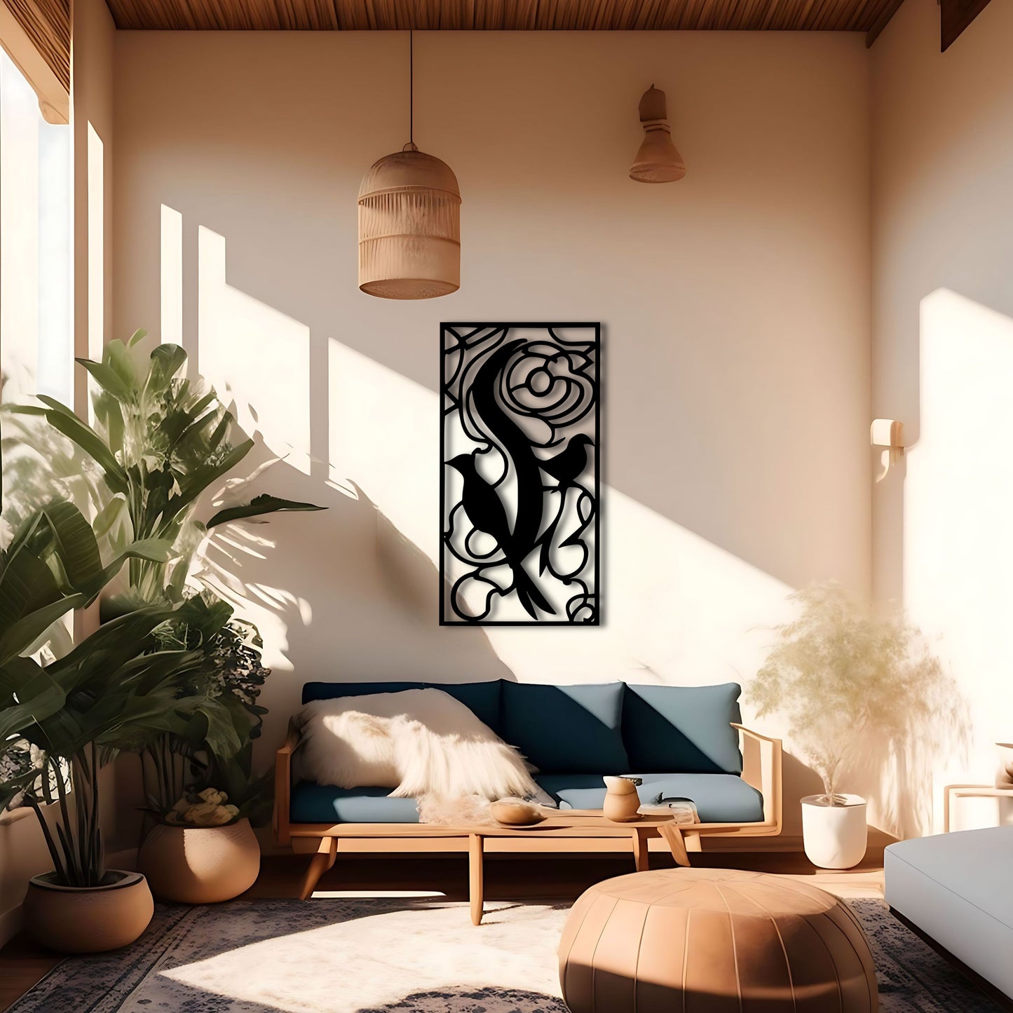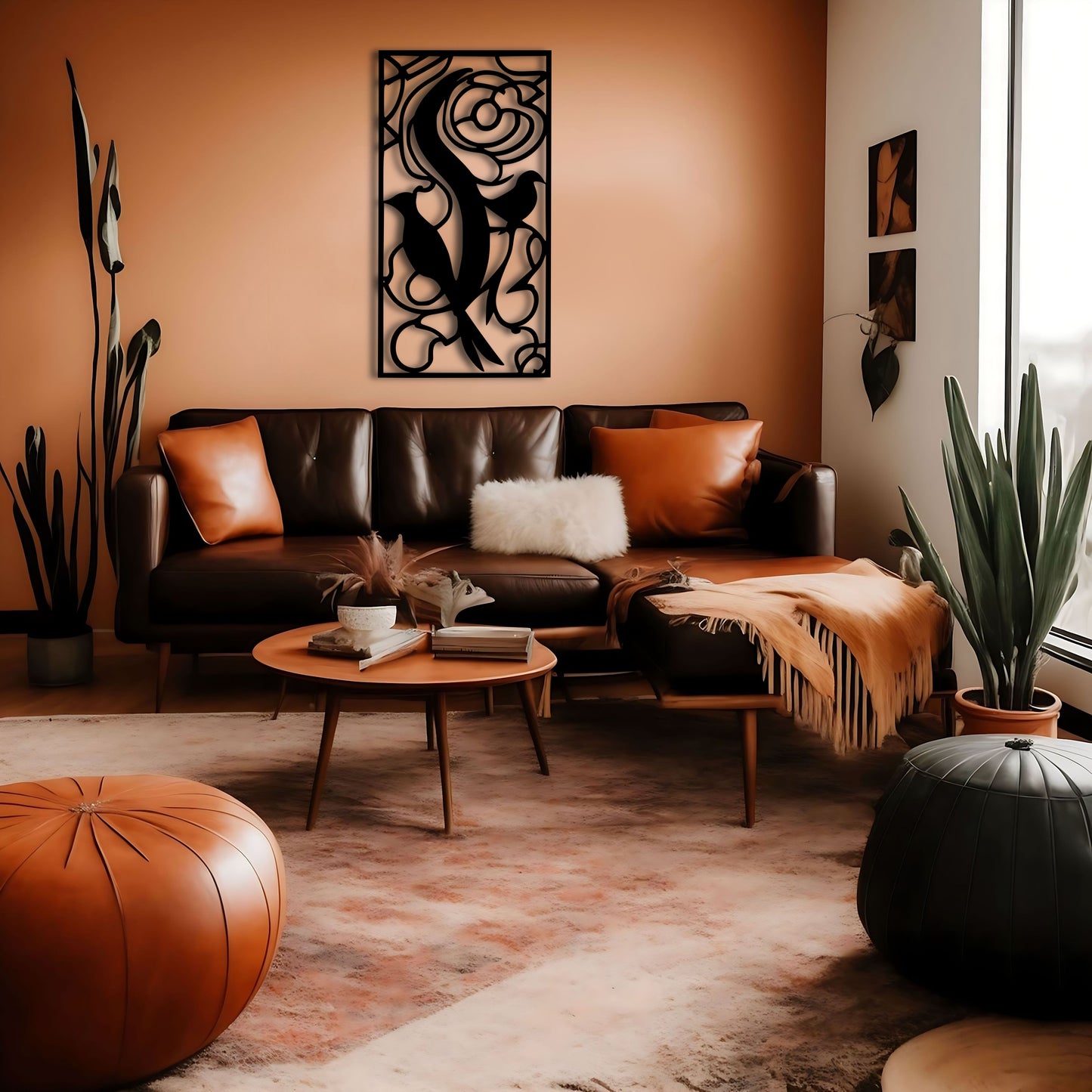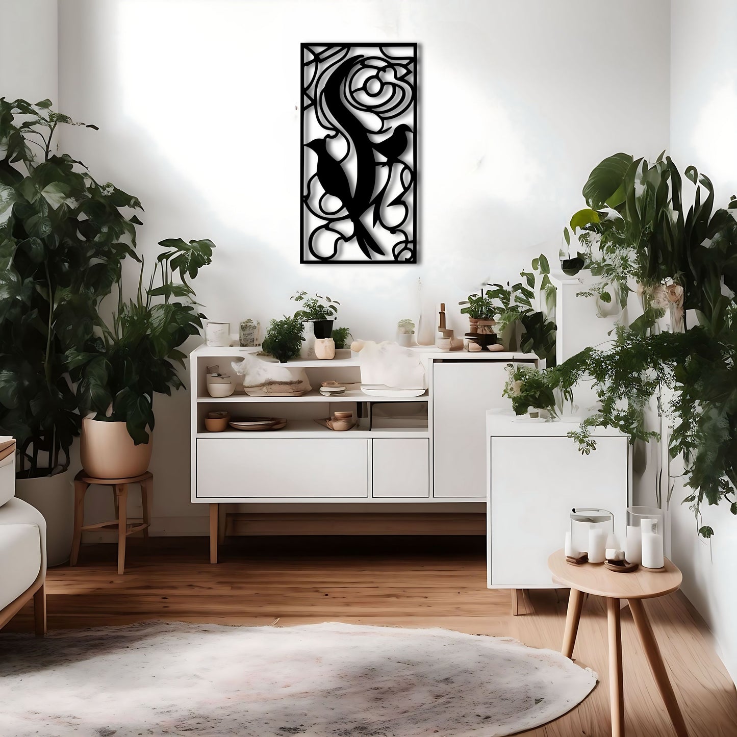 This stunning metal wall art features two birds in a modern art nouveau style, adding a touch of elegance to your space. The rectangular design has a modernistic feel that pairs well with bohemian and global-inspired aesthetics decor. Made from durable metal, this artwork is suitable for both indoor and outdoor use. Choose from a range of custom color options to match your decor. Add this large metal wall art to your living room or any space in need of a unique and eye-catching statement piece.