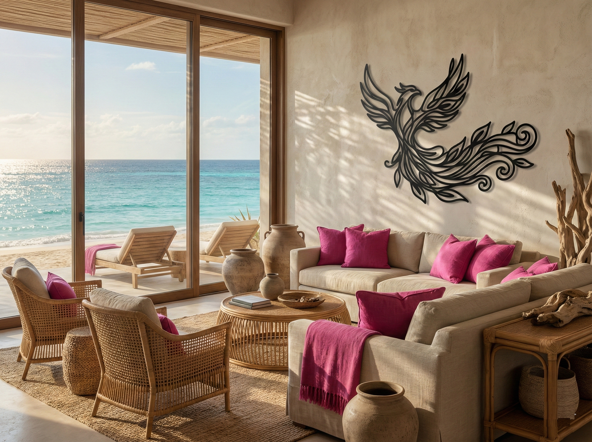 In metal, the form is translated into layered contour ribbons that keep the bird airy while preserving a bold, readable silhouette. The wing feathers and flowing tail lines are shaped to create dynamic negative space, and the leaf motifs add a grounded botanical counterpoint. With standoff mounting, the extended curves cast a pronounced floating shadow effect that reinforces the sense of motion.