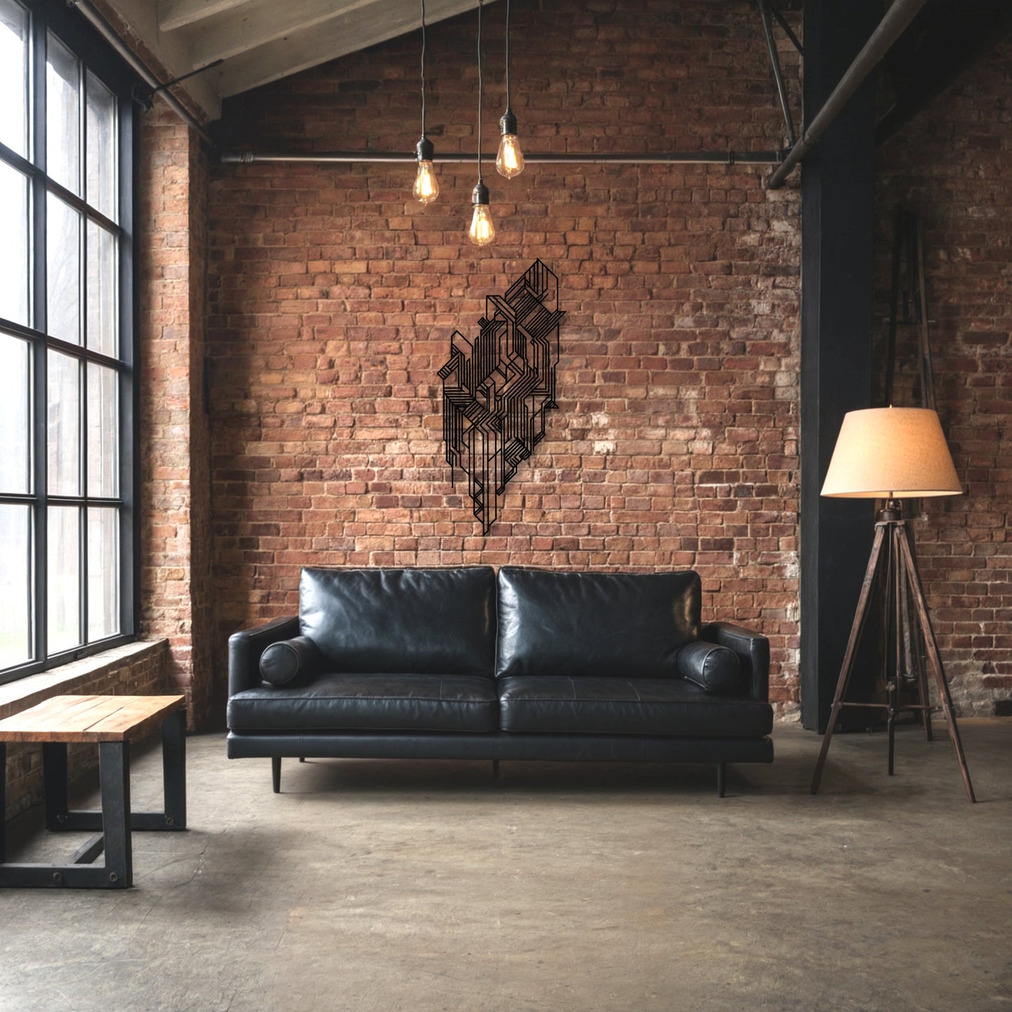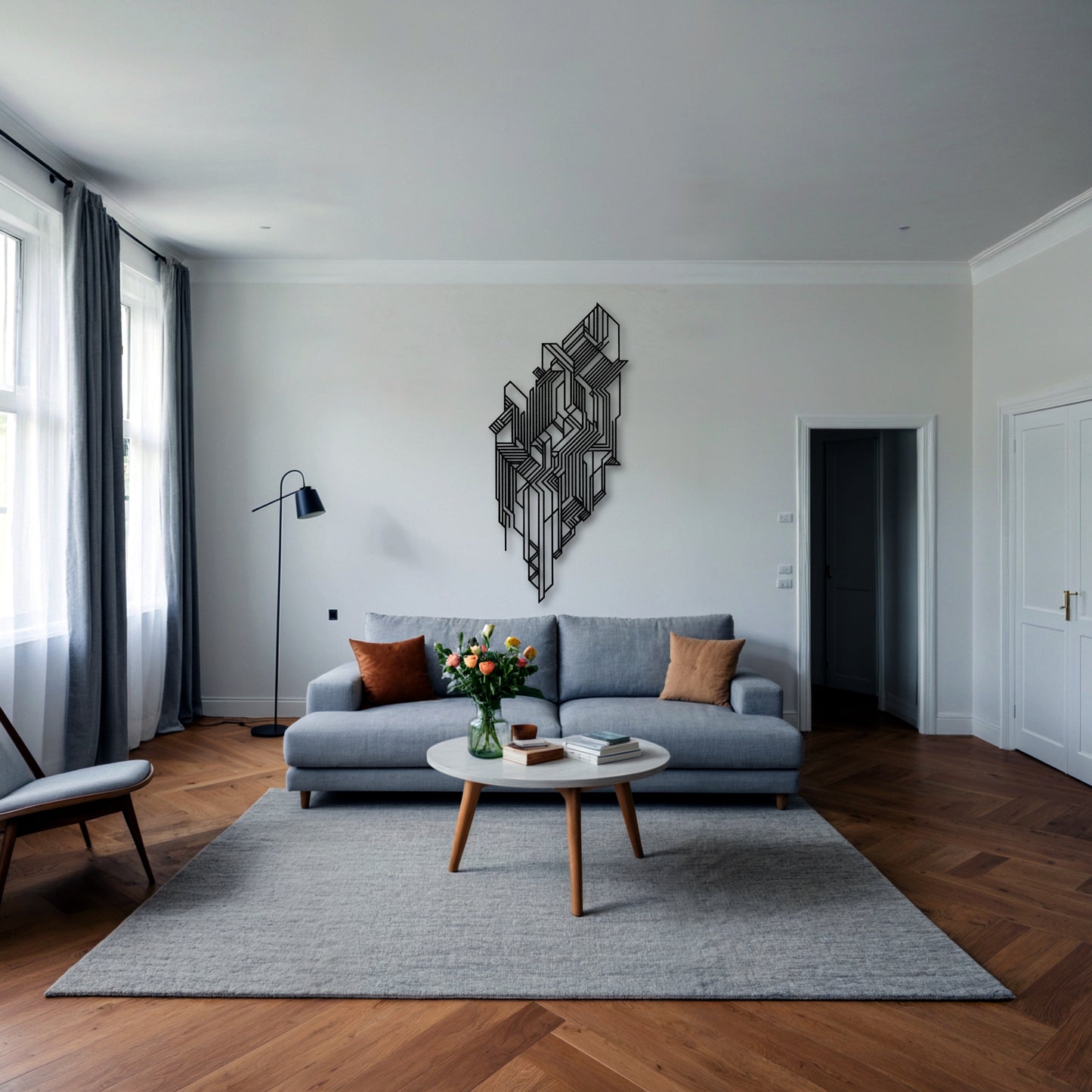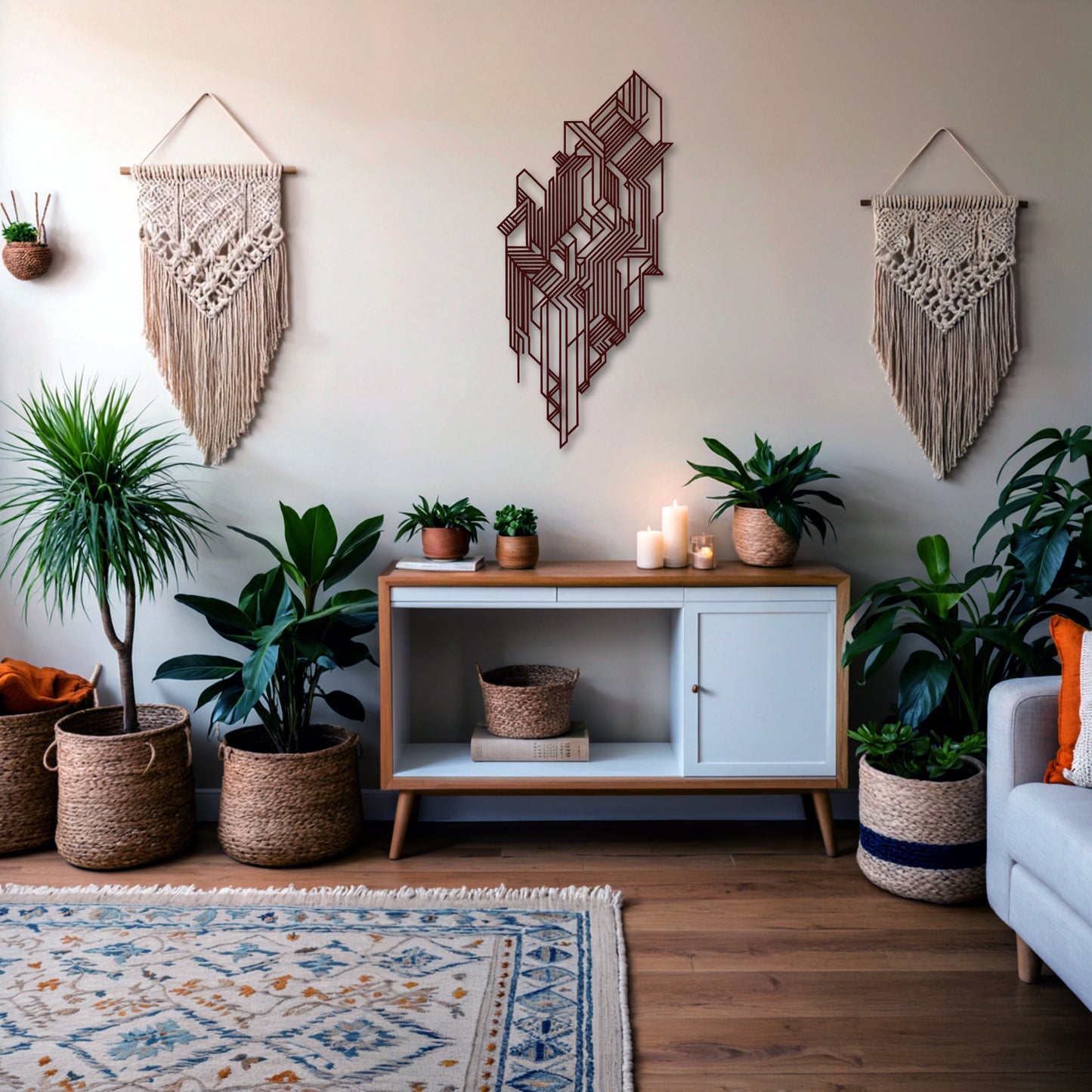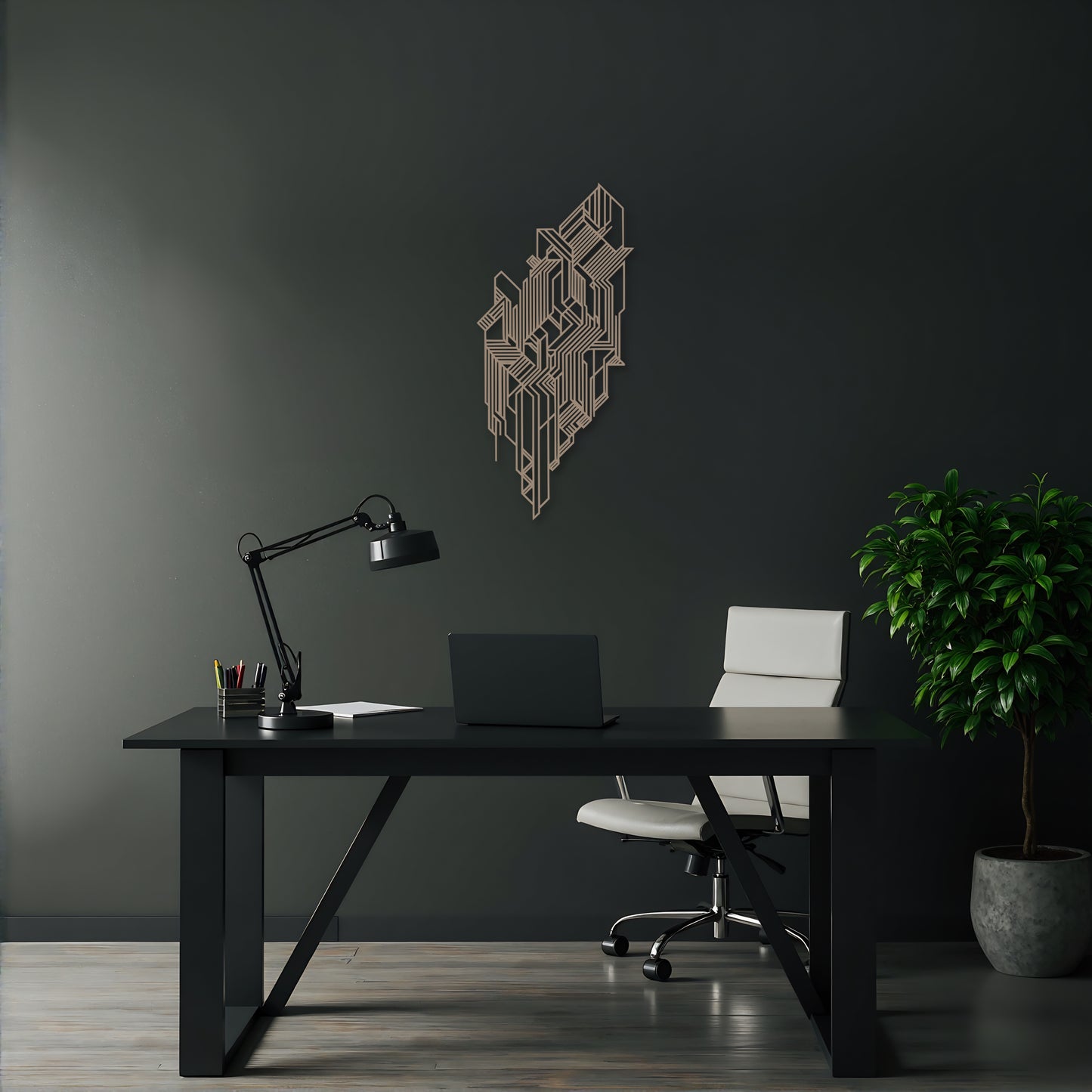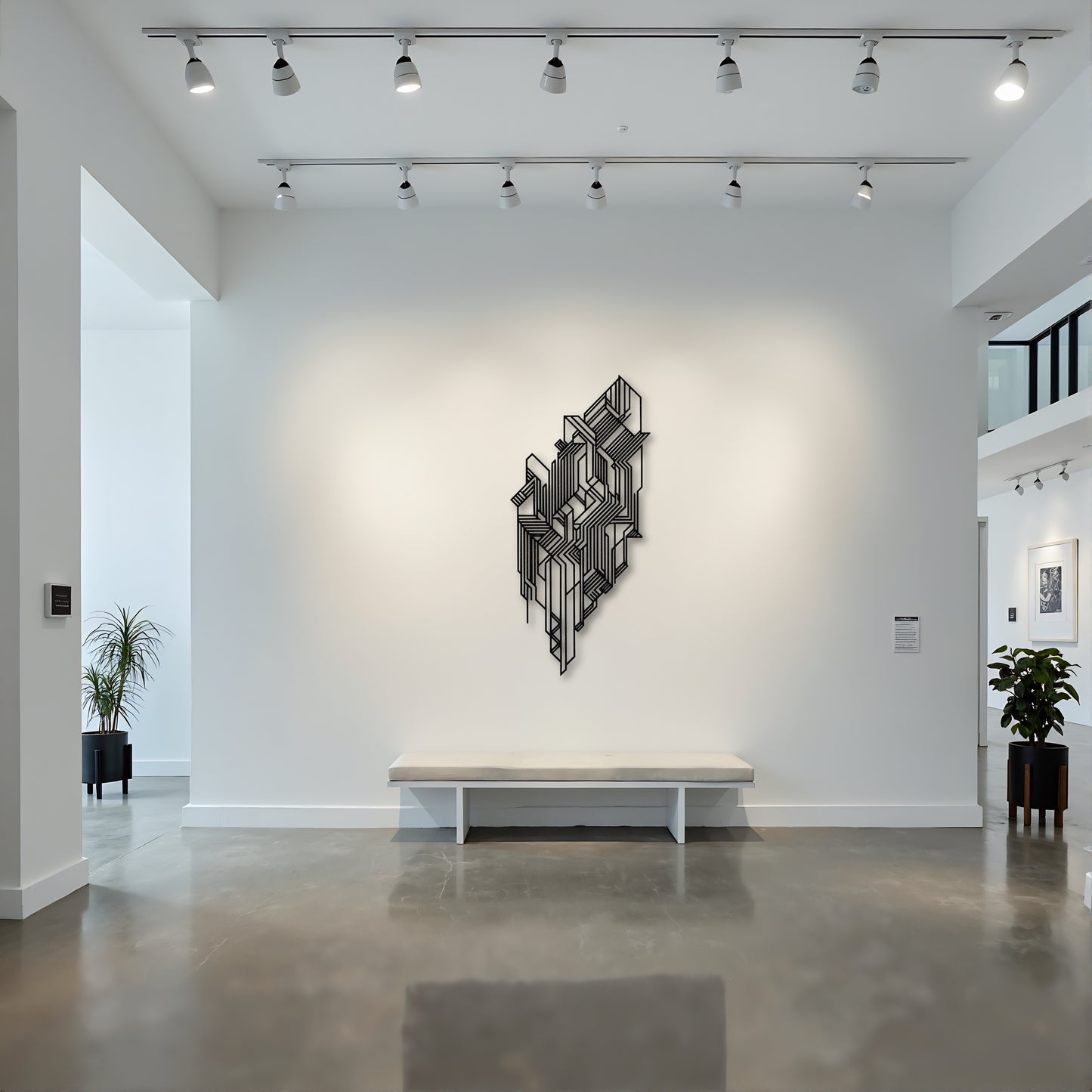 An intricate display of vertical and diagonal lines, creating a layered and abstract geometric pattern. This statement piece is perfect for modern and contemporary spaces.