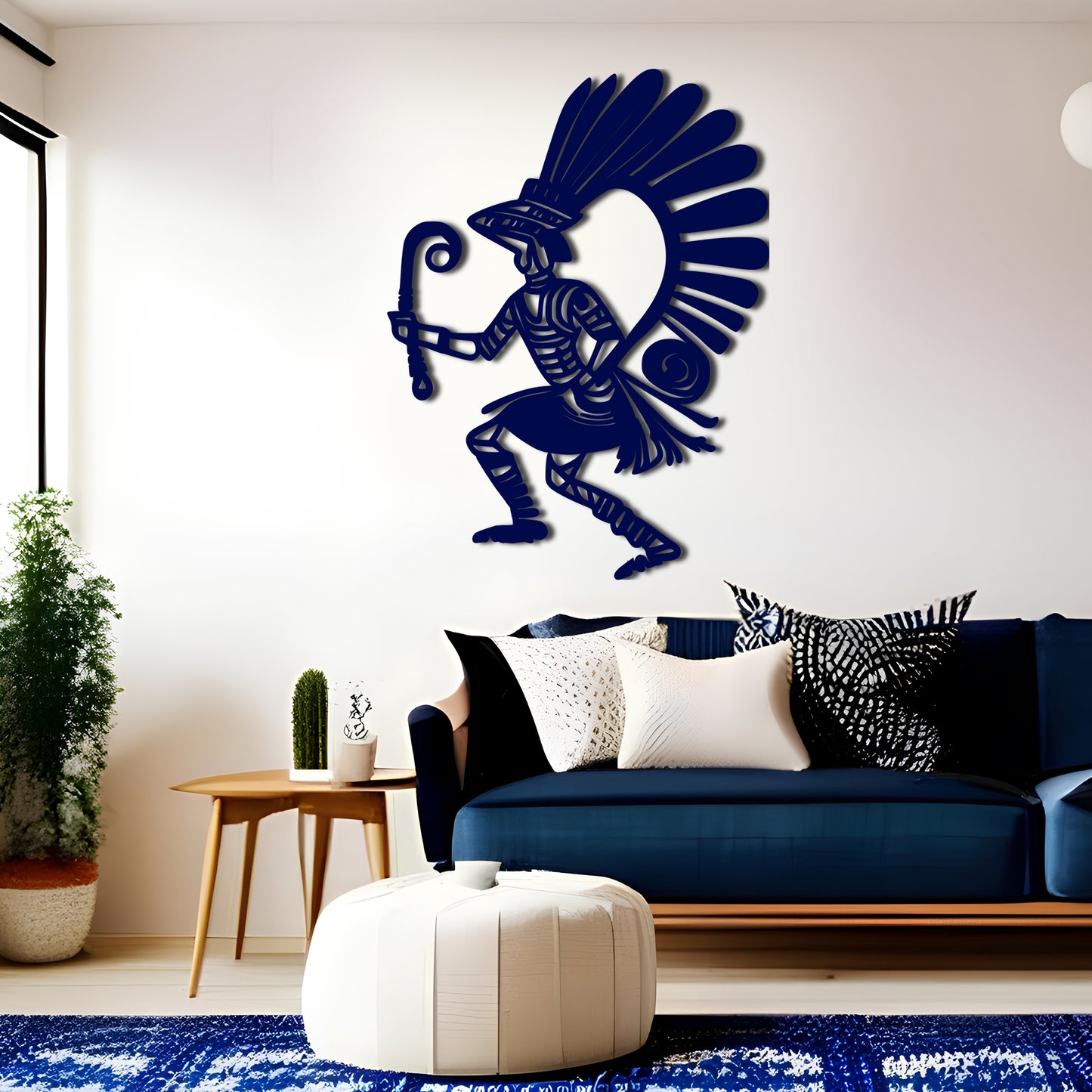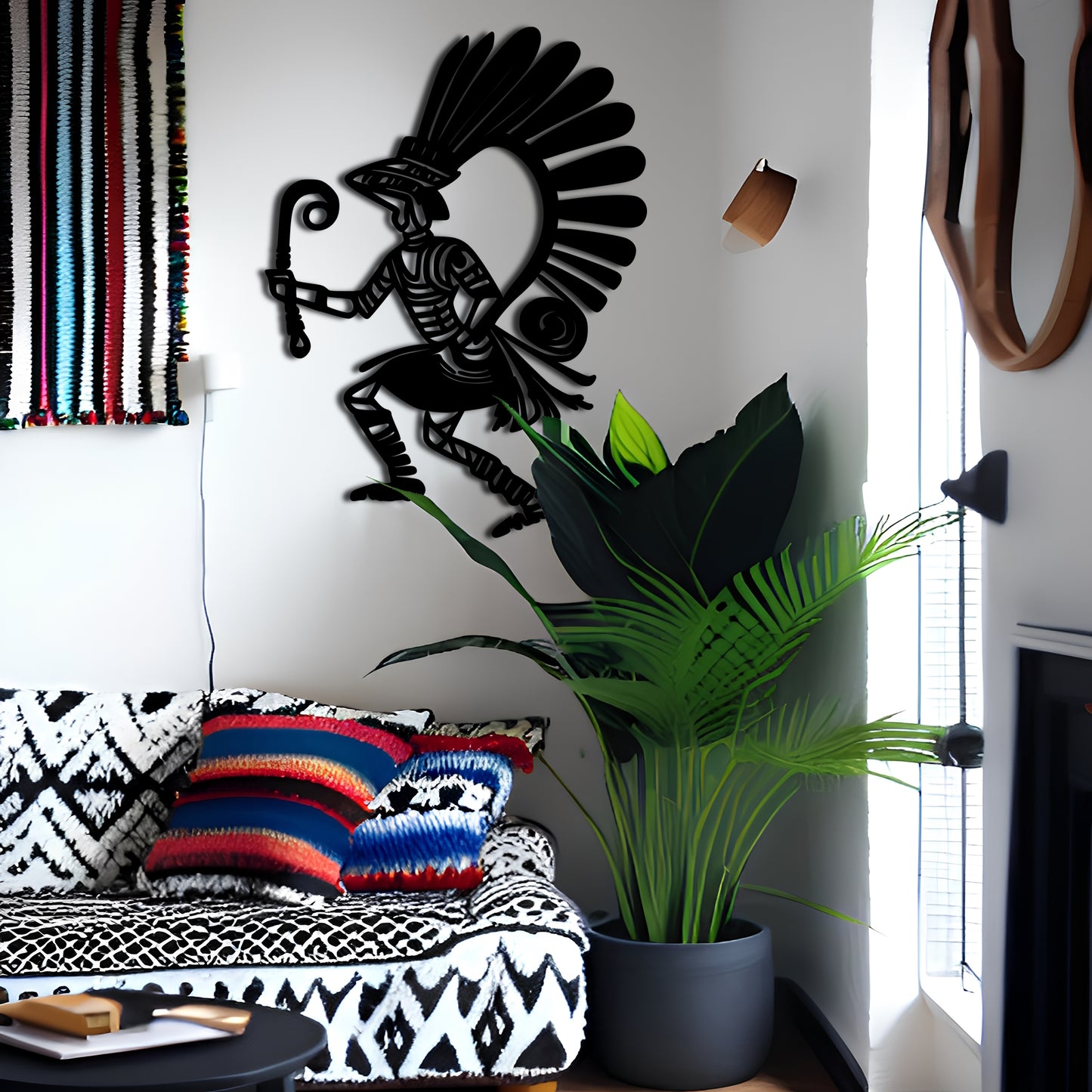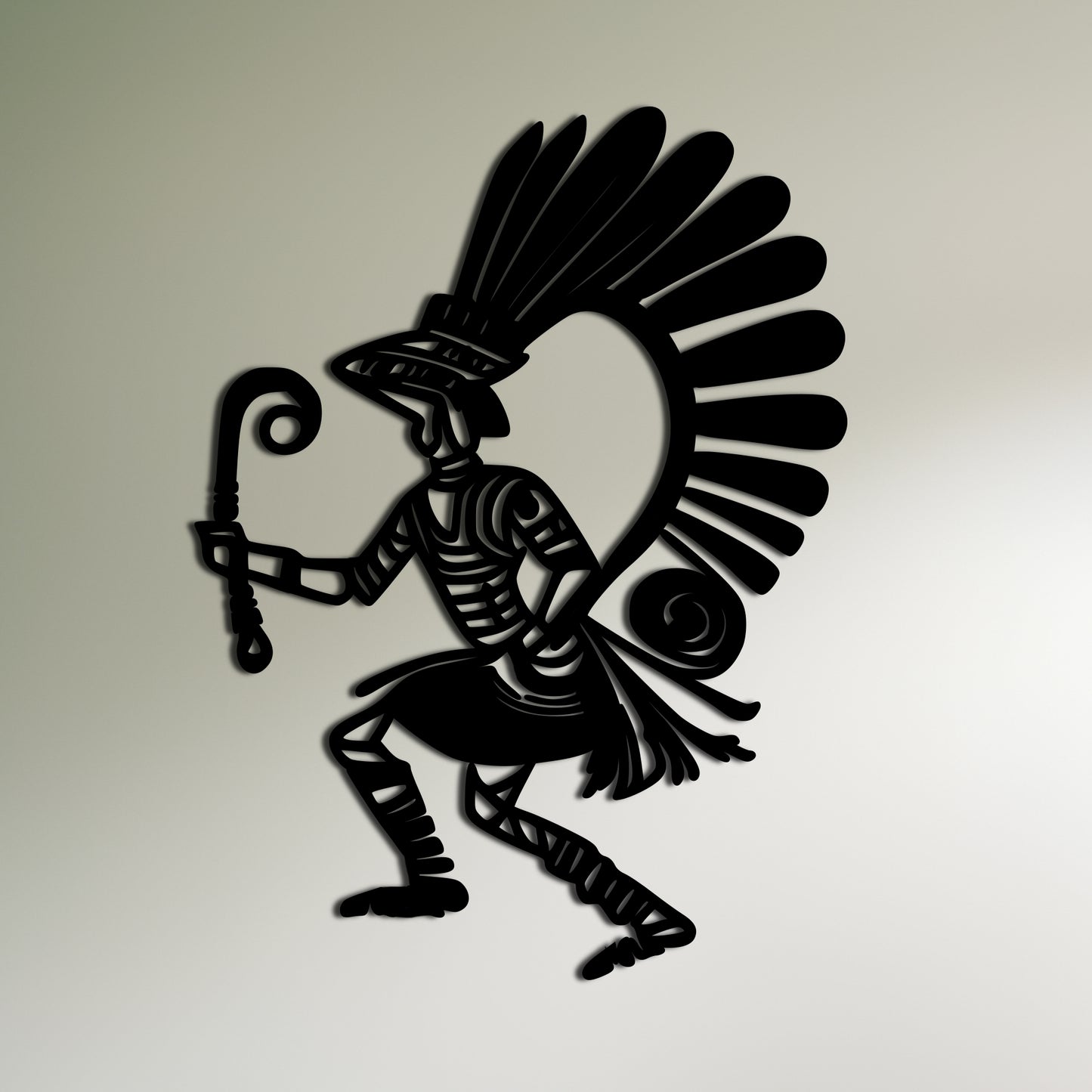 This stunning metal wall art features an art deco inspired illustration of Kokopelli holding a staff and dancing like Danza Azteca dancers. The feathered cavalry and winged hat add a touch of ancient mysticism to the design, making it the perfect addition to any wall in your home. This piece is made of high-quality metal and comes with custom color options to match your decor.
