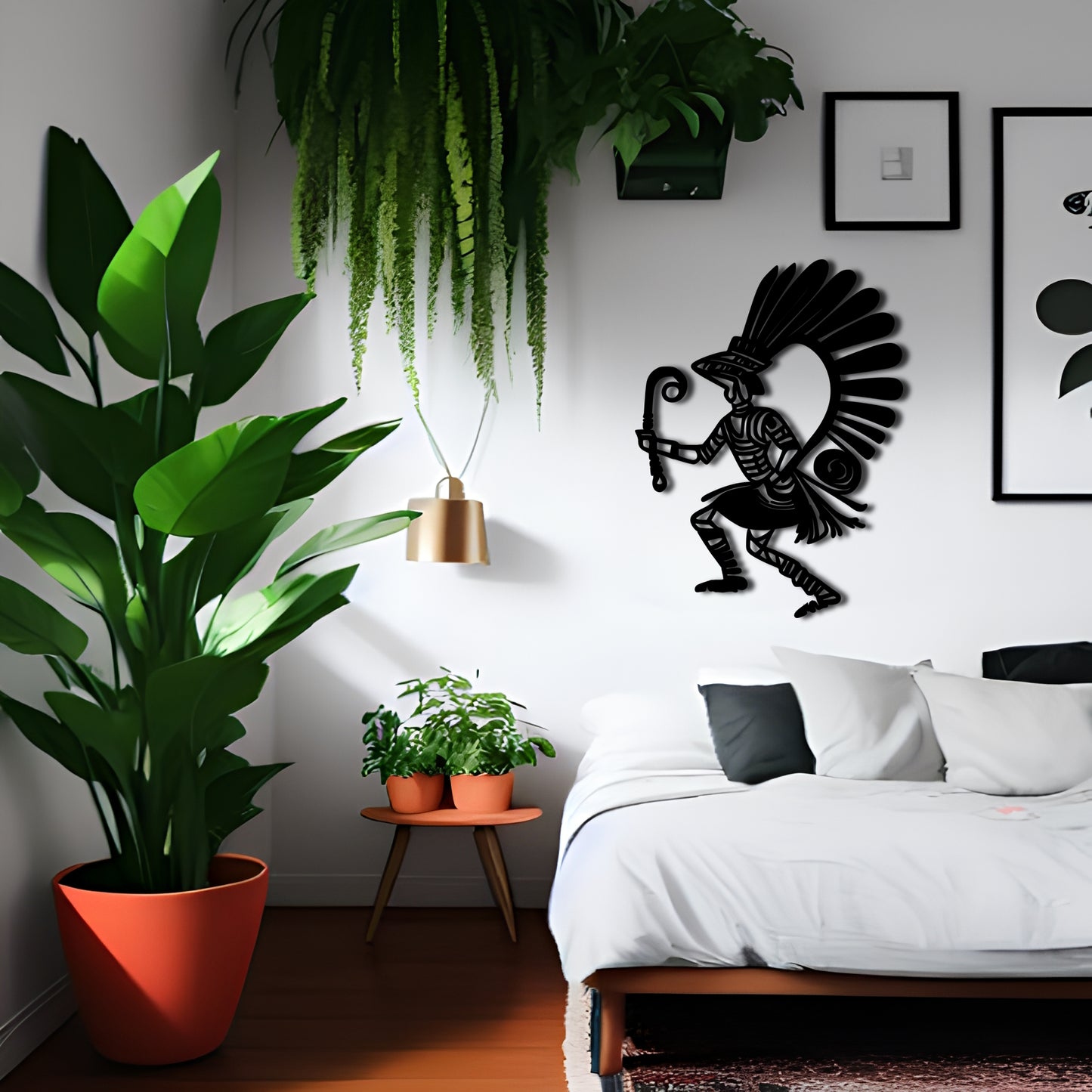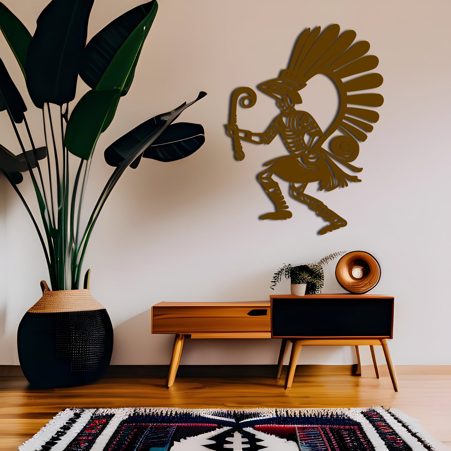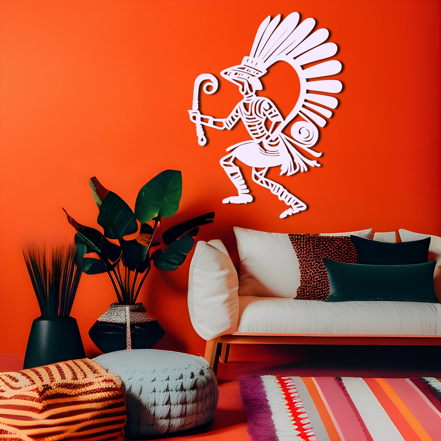 This stunning metal wall art features an art deco inspired illustration of Kokopelli holding a staff and dancing like Danza Azteca dancers. The feathered cavalry and winged hat add a touch of ancient mysticism to the design, making it the perfect addition to any wall in your home. This piece is made of high-quality metal and comes with custom color options to match your decor.