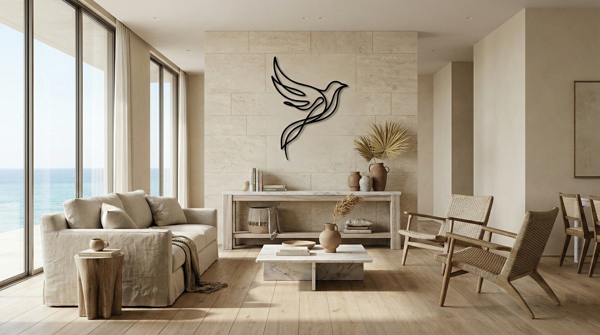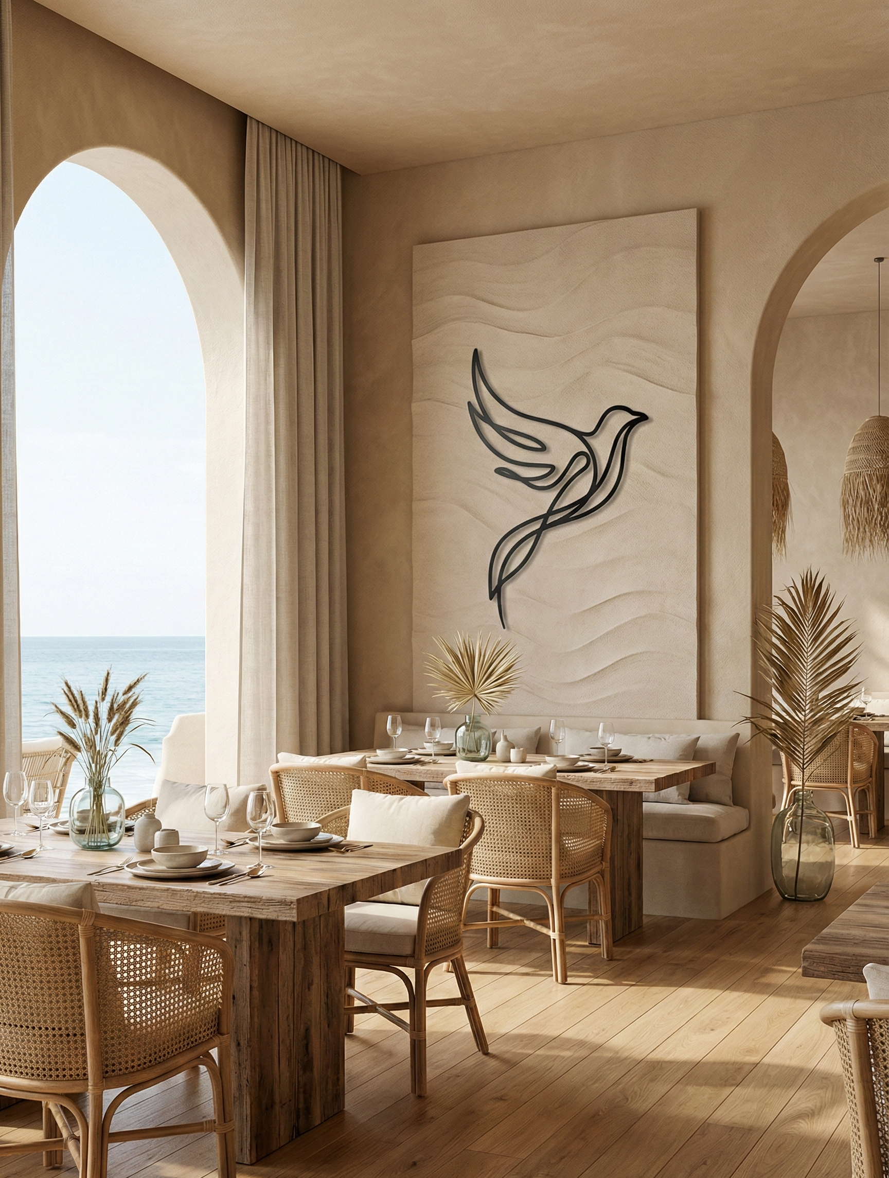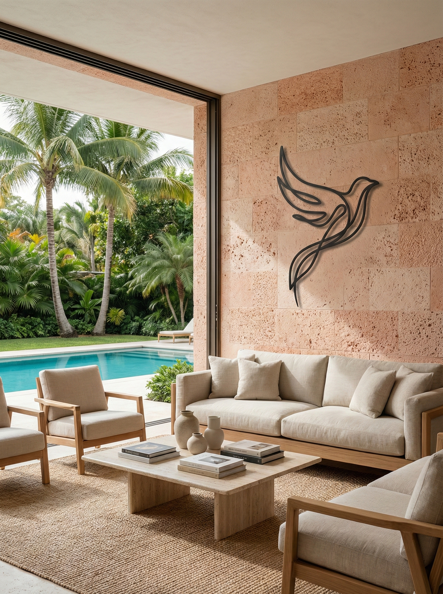 The form is translated into powder coated metal through confident, continuous contours that create open negative space and a crisp outline. The long curves and tapered turns are designed to cast a floating shadow effect, letting the linework read as both drawing and structure.