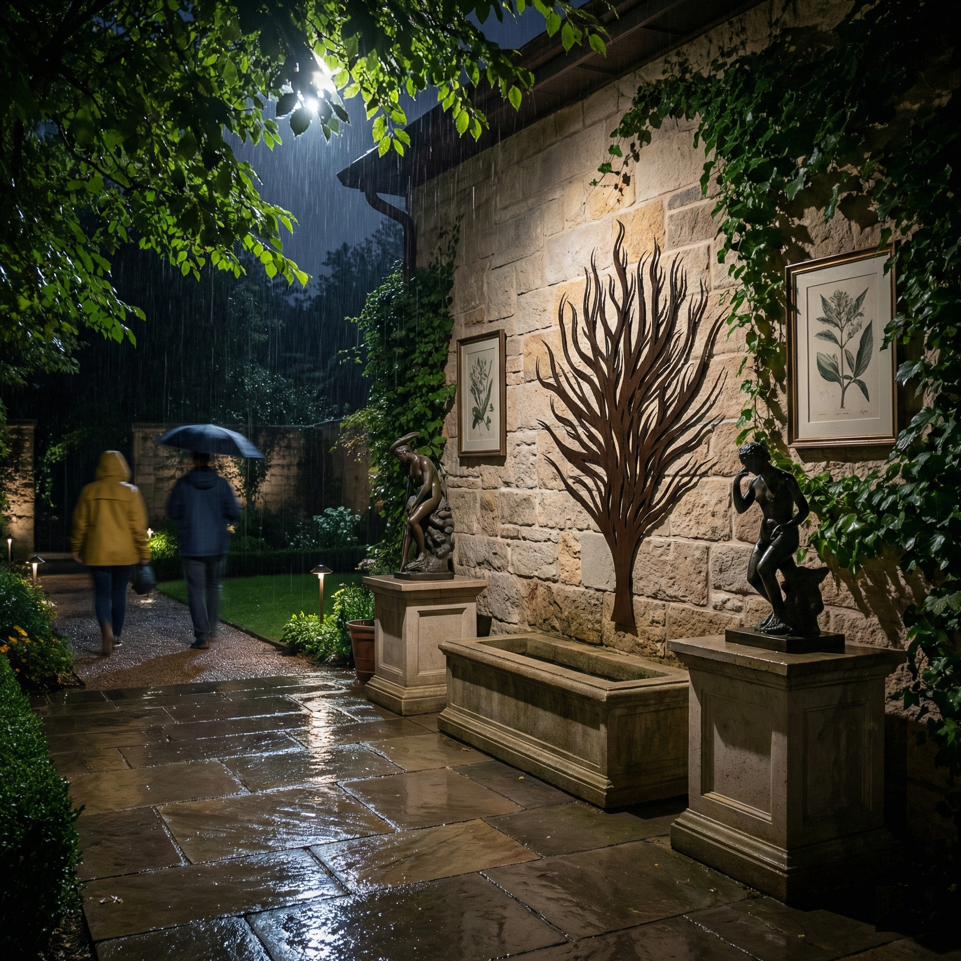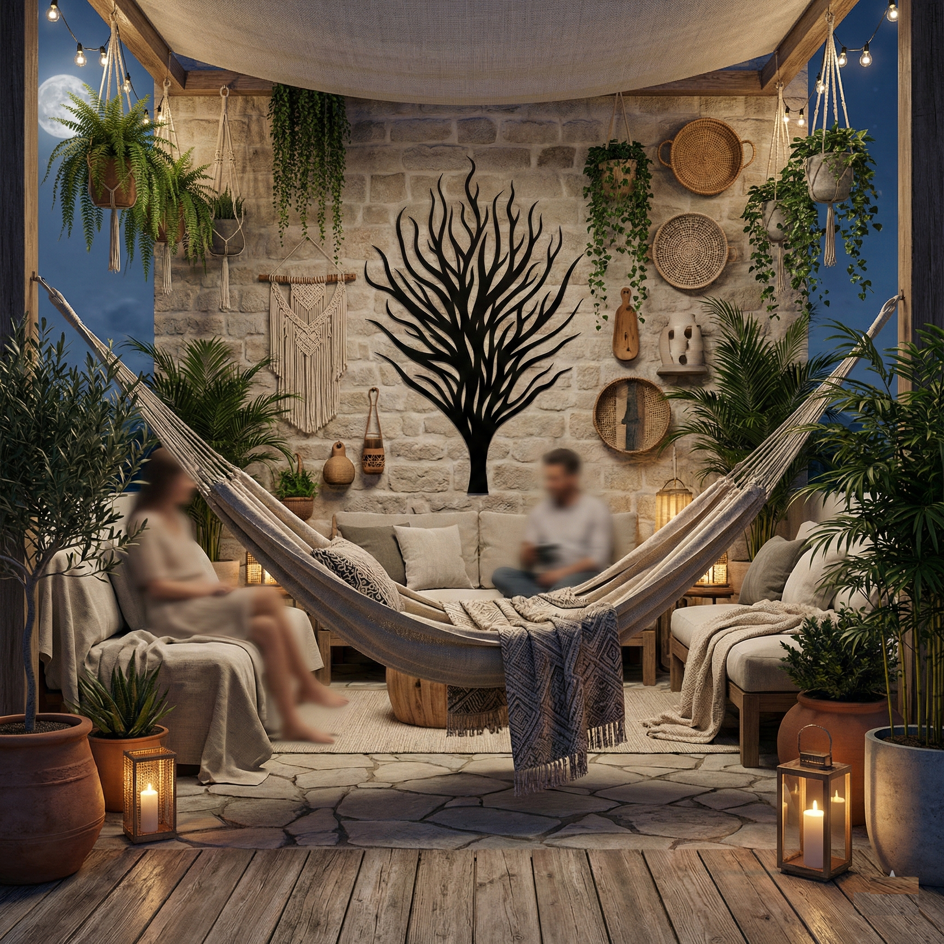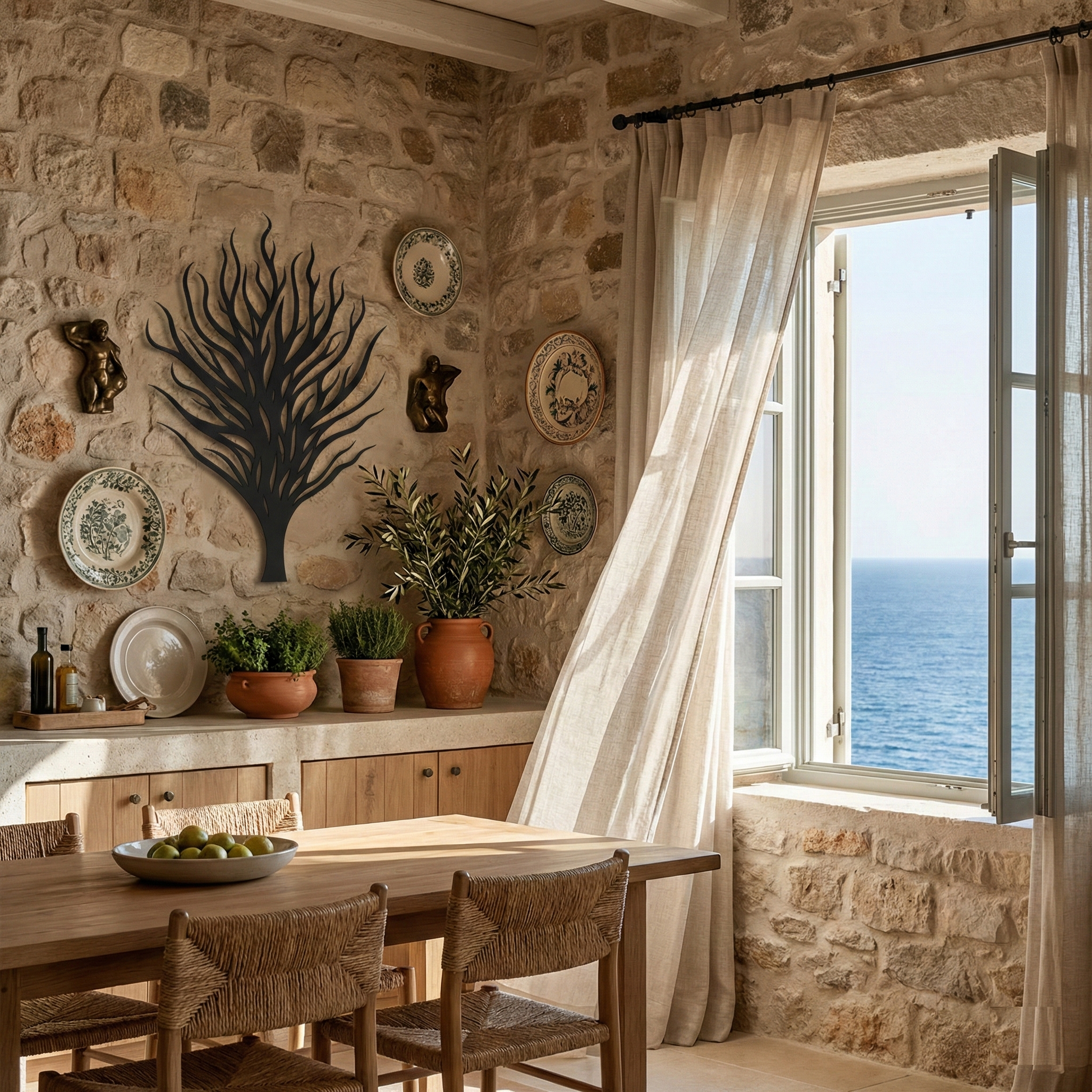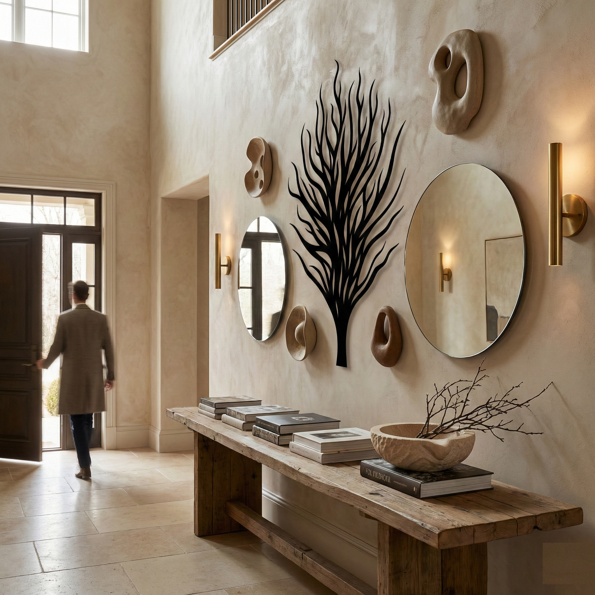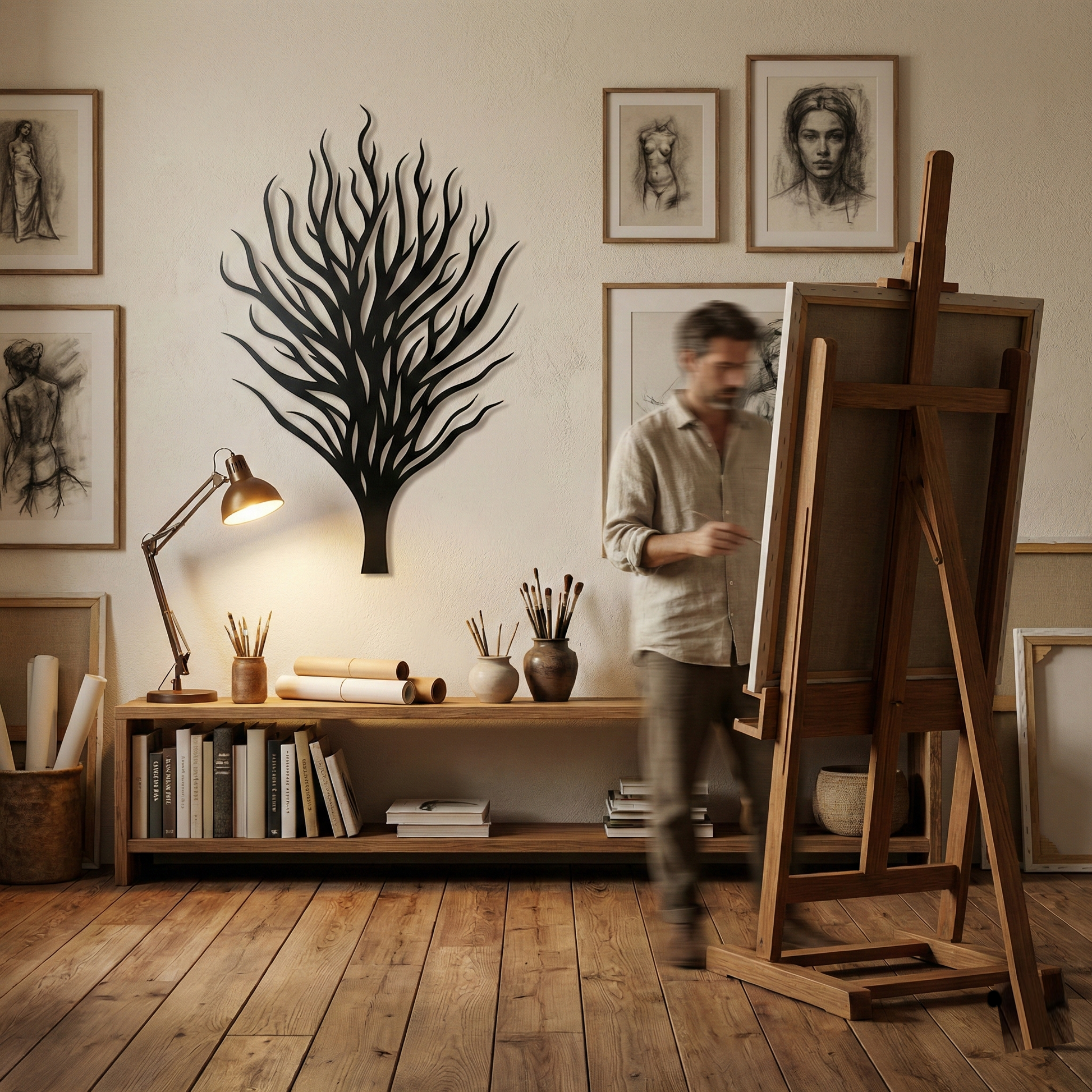 In metal, the form is translated into a strong central trunk that supports a network of tapering limbs, creating layered negative space that stays open and readable. The rising branch lines are designed to cast intricate, shifting shadows, reinforcing the floating offset effect while keeping the overall silhouette clean and architectural.