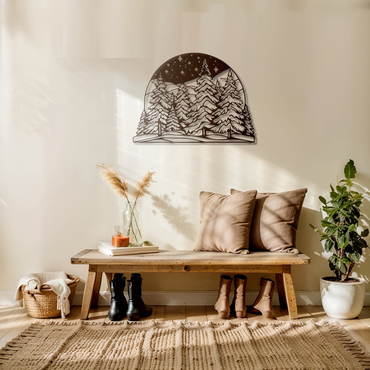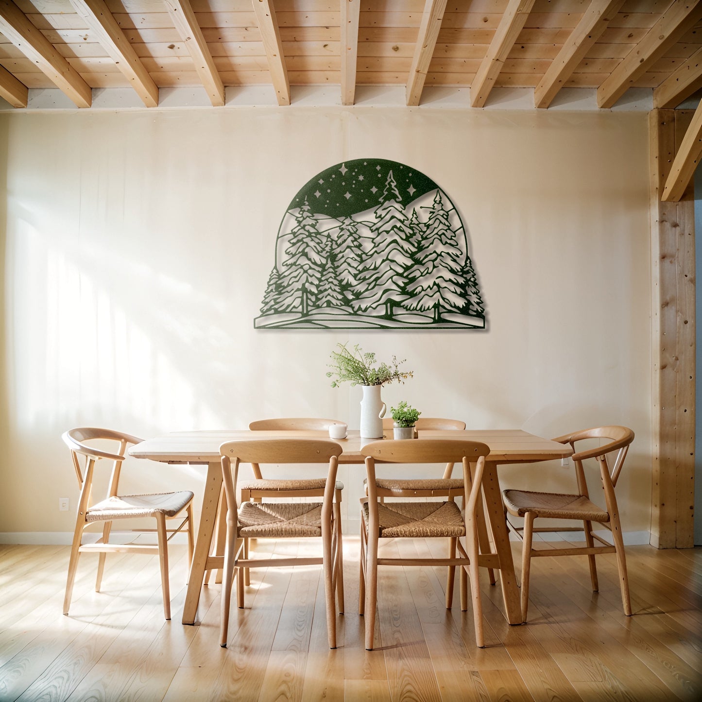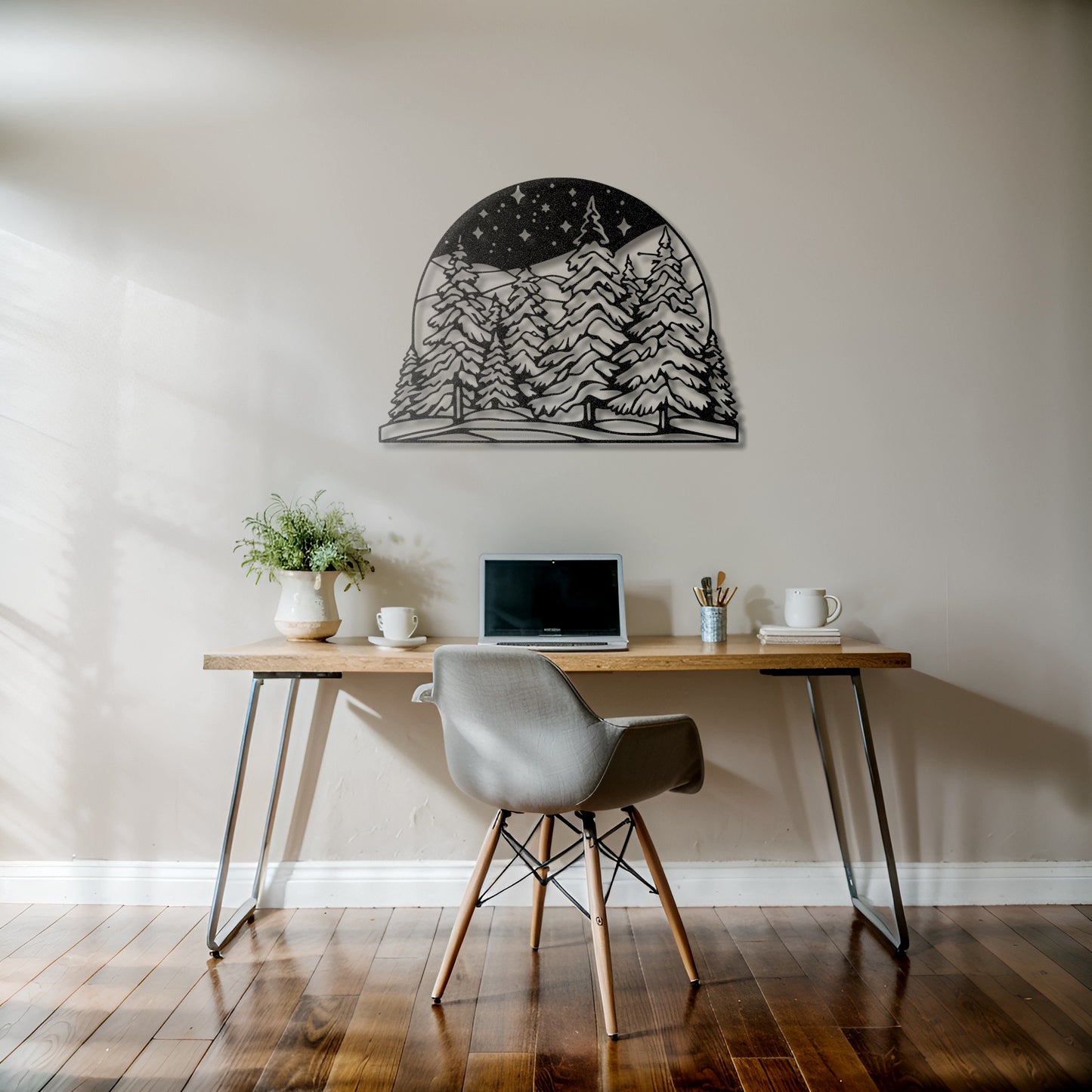 Bring the magic of a starry night into your home with this stunning Starry Night Forest Metal Wall Art. Featuring a serene pine forest under a sparkling night sky, this circular design blends elegance and nature in a timeless way. Whether you're looking for a statement piece for your living room or a serene accent for your outdoor space, this wall art is the perfect choice.