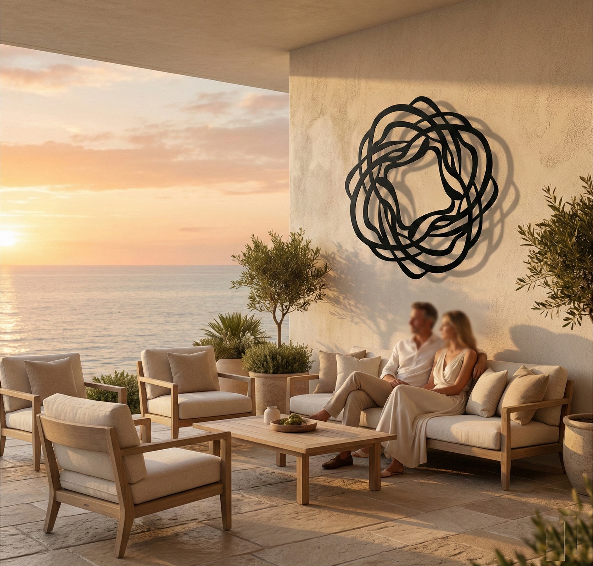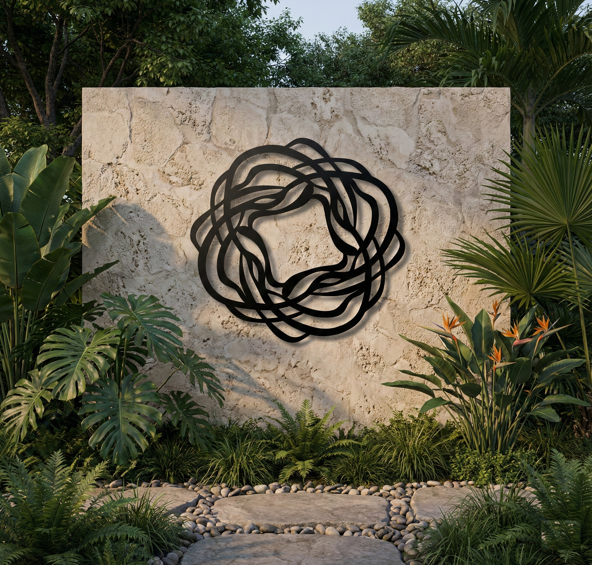 The design is translated into powder coated metal through bold, flowing bands and precisely spaced overlaps that preserve the woven illusion. Open negative space is kept generous so the knot reads clearly at a distance, while the floating offset adds dimensional shadow to every curve and crossing.