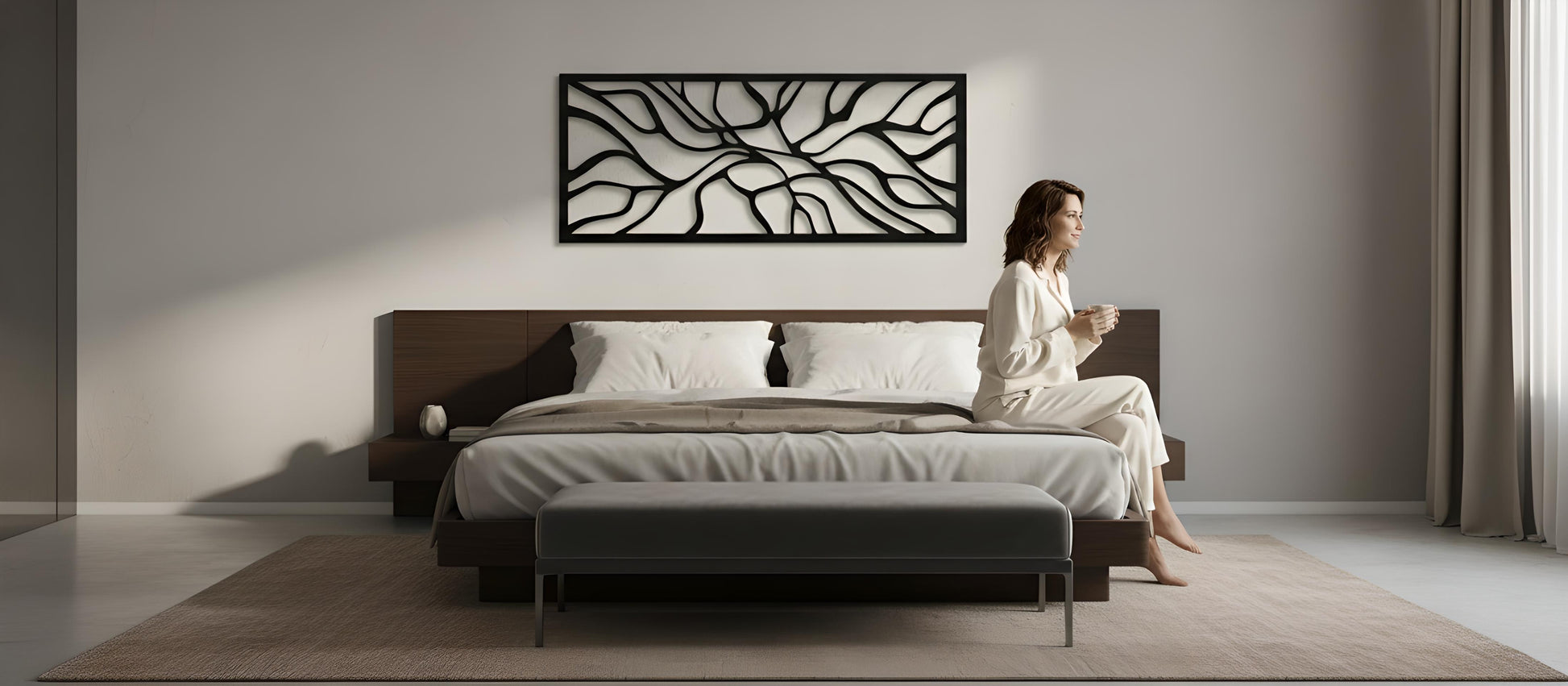 A wide horizontal field fractures into river-smooth bands and tectonic seams, stitched together by bold channels of negative space. The geometry reads like a modern relief: organic movement held inside disciplined structure. In shifting daylight, the cut paths throw long, layered shadows that travel across the wall like slow current—quiet at a distance, intensely graphic up close. Softened radius corners keep the edges refined, echoing river-worn obsidian rather than sharp machinery.